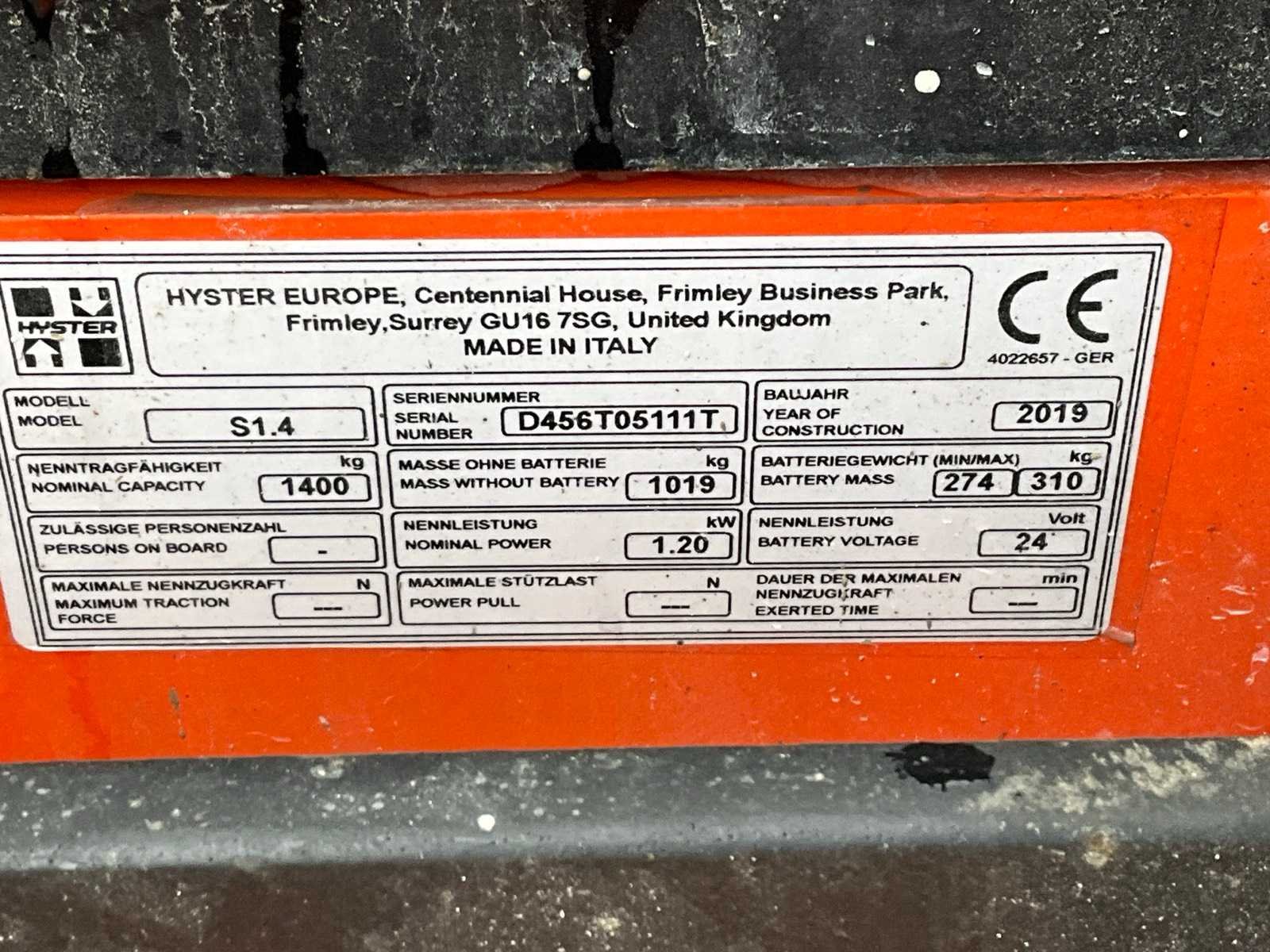 Triple mast; ingebouwde acculader; not working; Nee Merk: Hyster Type: S1.4 Bouwjaar: 2019 Serienummer: D456T05111T Hefvermogen: 1400kg Hefhoogte: 4990mm Lepellengte: 1150mm Afgelezen urenstand: 568 Eigen gewicht: 1300kg Totale afmeting L: 2200mm Totale afmeting Breedte: 800mm Totale afmeting Hoogte: 2300mm Accu lader: true