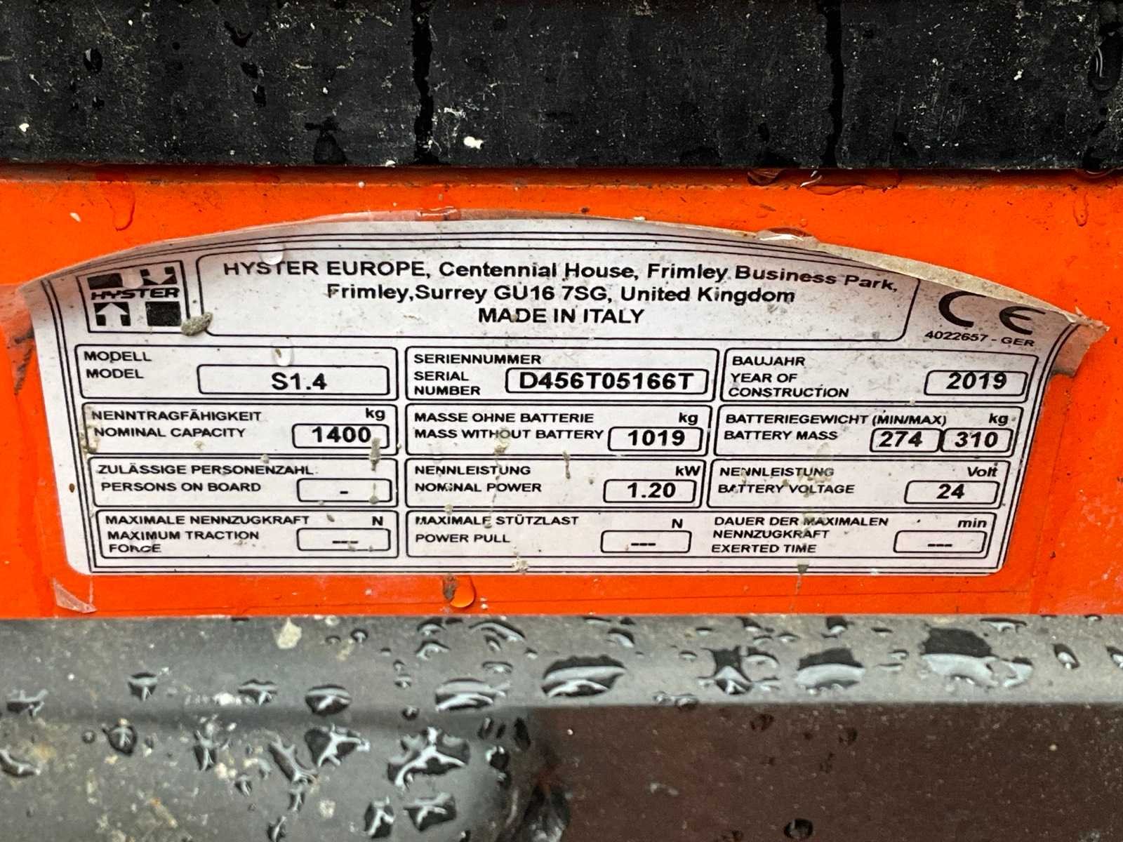 Triple mast; ingebouwde acculader; urenstand niet afleesbaar; not working; Nee Merk: Hyster Type: S1.4 Bouwjaar: 2019 Serienummer: D456T05166T Hefvermogen: 1400kg Hefhoogte: 4990mm Lepellengte: 1150mm Eigen gewicht: 1300kg Totale afmeting L: 2200mm Totale afmeting Breedte: 800mm Totale afmeting Hoogte: 2300mm Accu lader: true