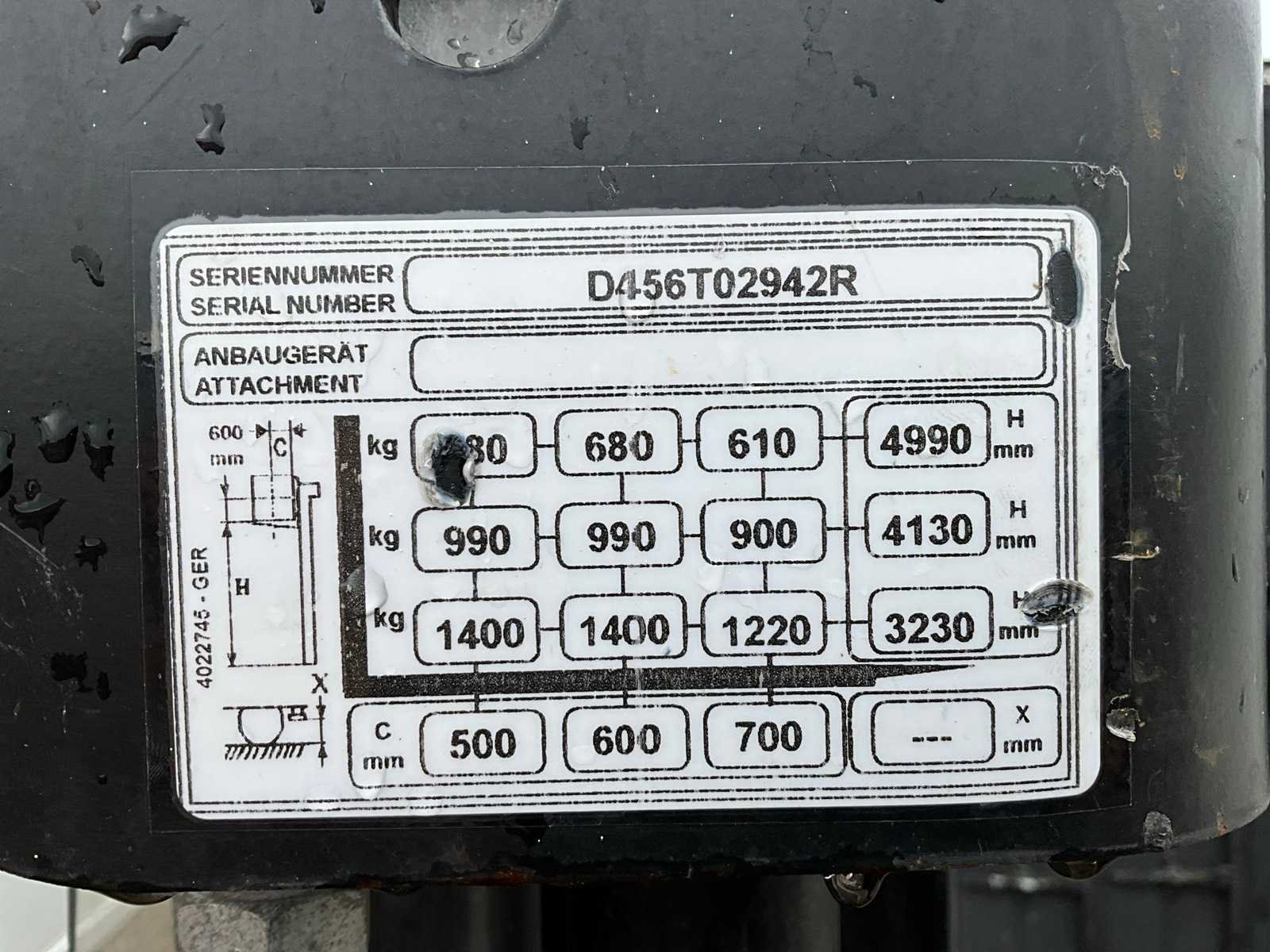 Triple mast; ingebouwde acculader; not working; Nee Merk: Hyster Type: S1.4 Bouwjaar: 2017 Serienummer: D456T02942R Hefvermogen: 1400kg Hefhoogte: 4990mm Lepellengte: 1150mm Afgelezen urenstand: 433 Eigen gewicht: 1300kg Totale afmeting L: 2200mm Totale afmeting Breedte: 800mm Totale afmeting Hoogte: 2300mm Accu lader: true