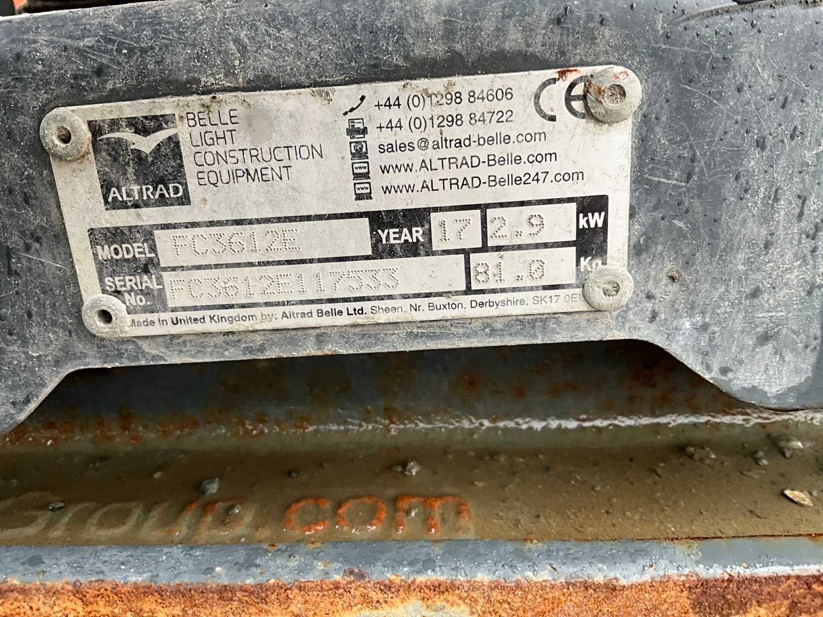 Neerklapbare beugel; wielset; toepassing: aantrillen van grond / stol / zand / klinkers / natuursteen; 4 Pk; hijsbeugel; working condition Nee Merk: Altrad / Belle Type: FC3612E Bouwjaar: 2017 Serienummer: FC3612E117533 Grondplaat afm. l: 610mm Grondplaat afm. b: 360mm Centrifugale kracht: 16kN Merk motor: Honda GX120 Motorvermogen (kW): 2.9kW Brandstof: Aspen4 Eigen gewicht: 81kg Totale afmeting L: 1050mm Totale afmeting Breedte: 400mm Totale afmeting Hoogte: 1000mm