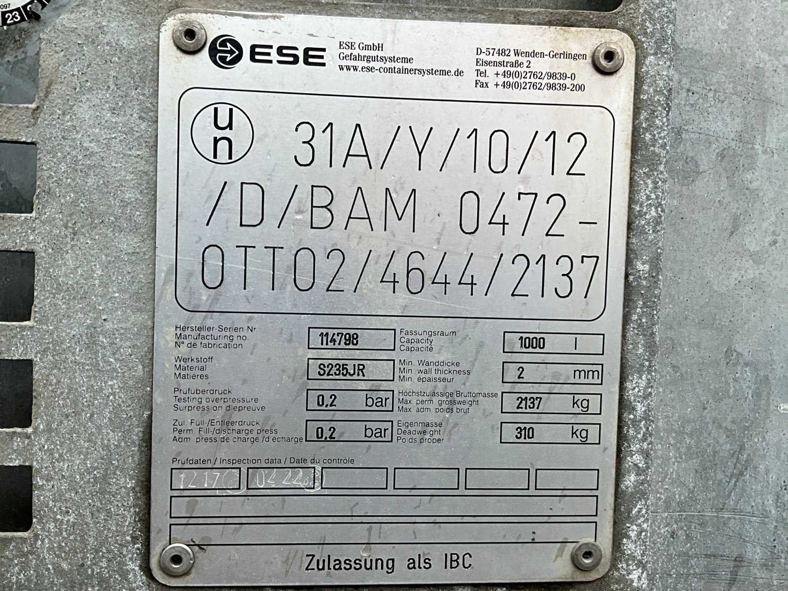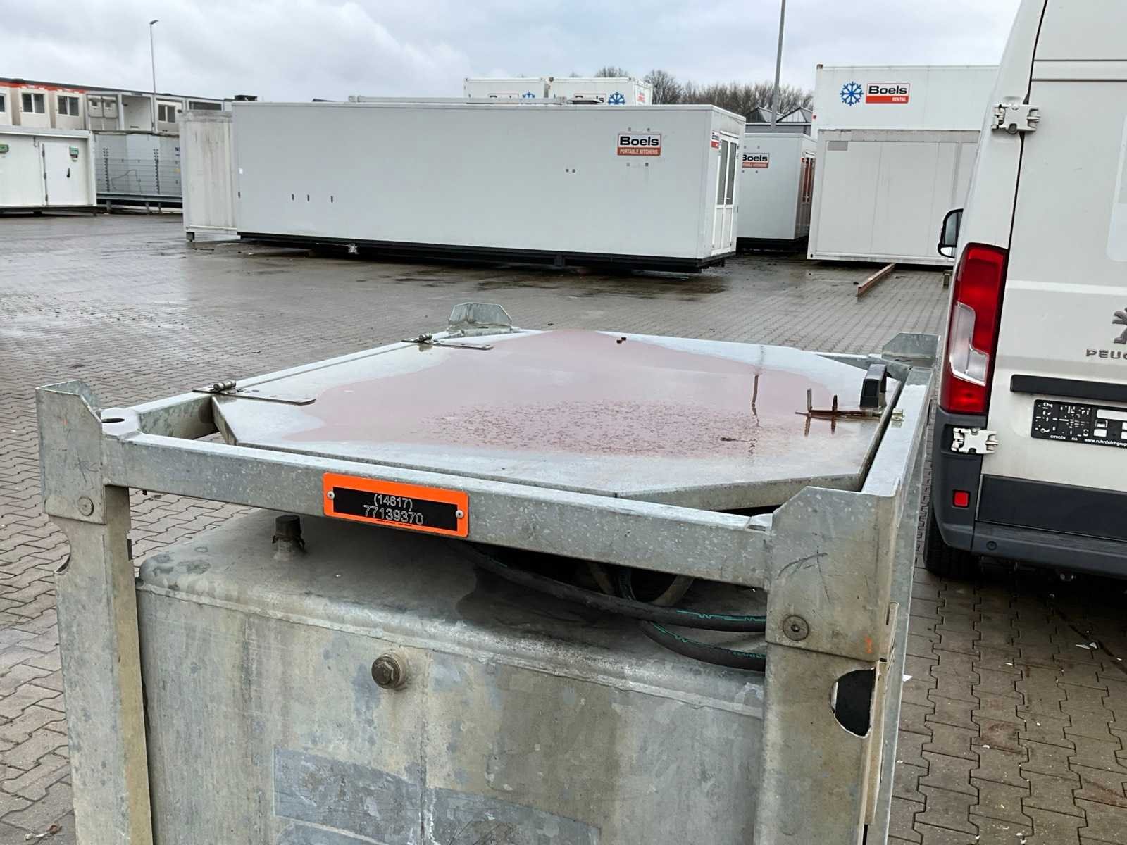 Gegalvaniseerd staal; wanddikte 2 mm; hijsogen; heftruck vorksleuven; vulgraad meter; slangen; openklapbaar deksel; 1x afsluitdop; mangat; stapelbaar Nee Merk: ESE Gewicht: 310kg Type: ASF 1000 DW Bouwjaar: 2012 Totale afmeting L: 1250mm Totale afmeting Breedte: 1050mm Totale afmeting Hoogte: 1400mm