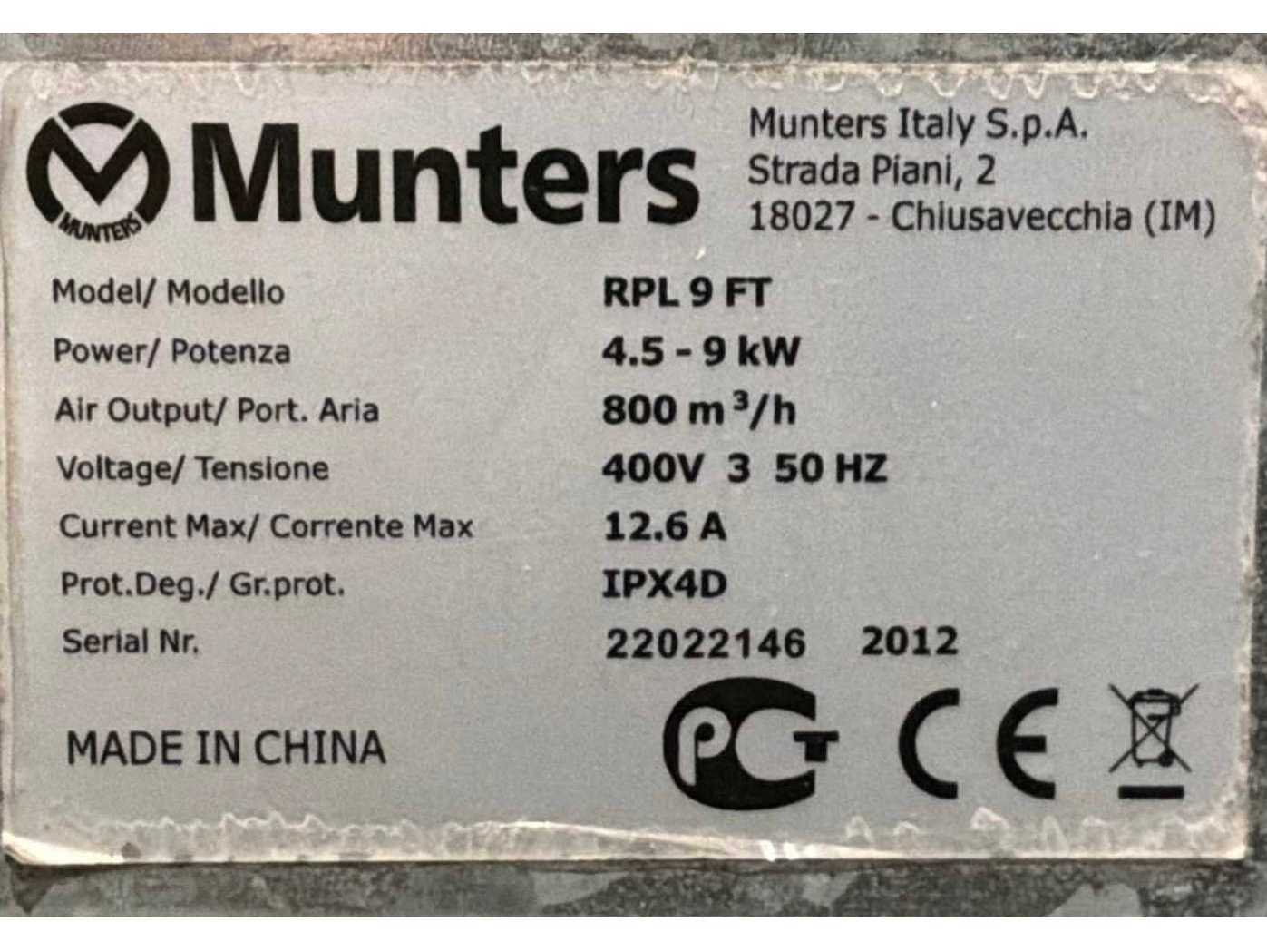 Standenschakelaar; volumestroom 800 m3 / uur; 12,6 Ampère; draagbeugel; working condition; Nee Merk: Munters Type: RPL 9FT Bouwjaar: 2012 Serienummer: 22022146 Vermogen: 9kW Ventilator: true Thermostaat: true Eigen gewicht: 10kg Totale afmeting L: 320mm Totale afmeting Breedte: 350mm Totale afmeting Hoogte: 480mm Aansluiting: 400V