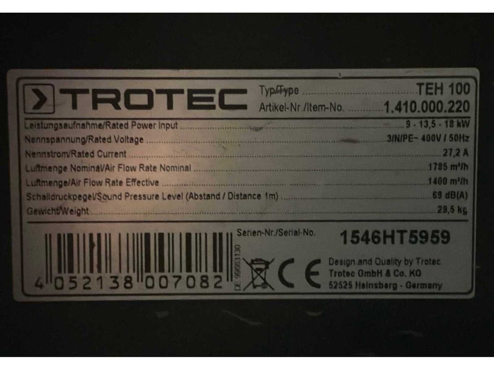 Verrijdbaar; thermostaat; standenschakelaar; volumestroom 1785 m3 / uur; 27,2 ampère; working condition Nee Merk: Trotec Type: TEH 100 Bouwjaar: 2015 Serienummer: 1546HT5959 Vermogen: 18kW Ventilator: true Eigen gewicht: 29kg Totale afmeting L: 400mm Totale afmeting Breedte: 420mm Totale afmeting Hoogte: 600mm Aansluiting: 400V
