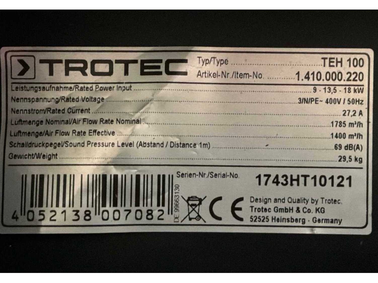 Verrijdbaar; thermostaat; standenschakelaar; volumestroom 1785 m3 / uur; 27,2 Ampère; working condition Nee Merk: Trotec Type: TEH 100 Bouwjaar: 2017 Serienummer: 1743HT10121 Vermogen: 18kW Ventilator: true Eigen gewicht: 29kg Totale afmeting L: 400mm Totale afmeting Breedte: 420mm Totale afmeting Hoogte: 600mm Aansluiting: 400V