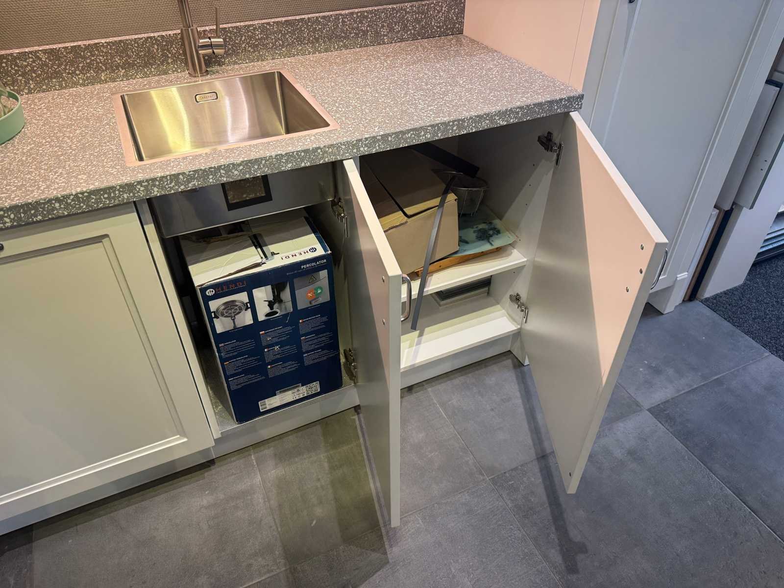 Nee Merk: Tristar Type keukenopstelling: Recht Lengte: 341cm Breedte: 60cm Hoogte: 220cm Kraan: Ja Gootsteen: Ja Aanrechtblad: Composiet Fornuis: Pelgrim IK4084R Koelkast: AEG SKB410F1AS Softclose: true Oven: Siemens Studioline CM924G1B1 Afzuigkap: Novy 877 Vaatwasser: AEG FSE63807P Kleur: Wit