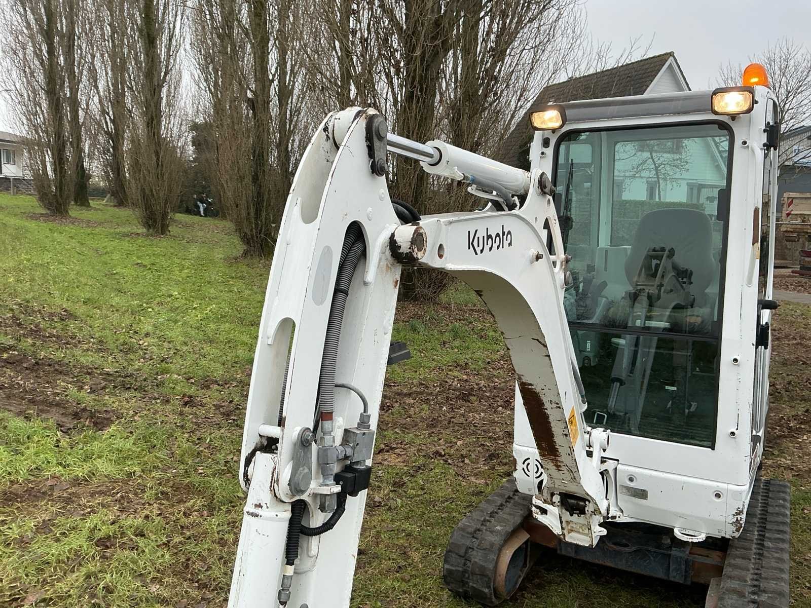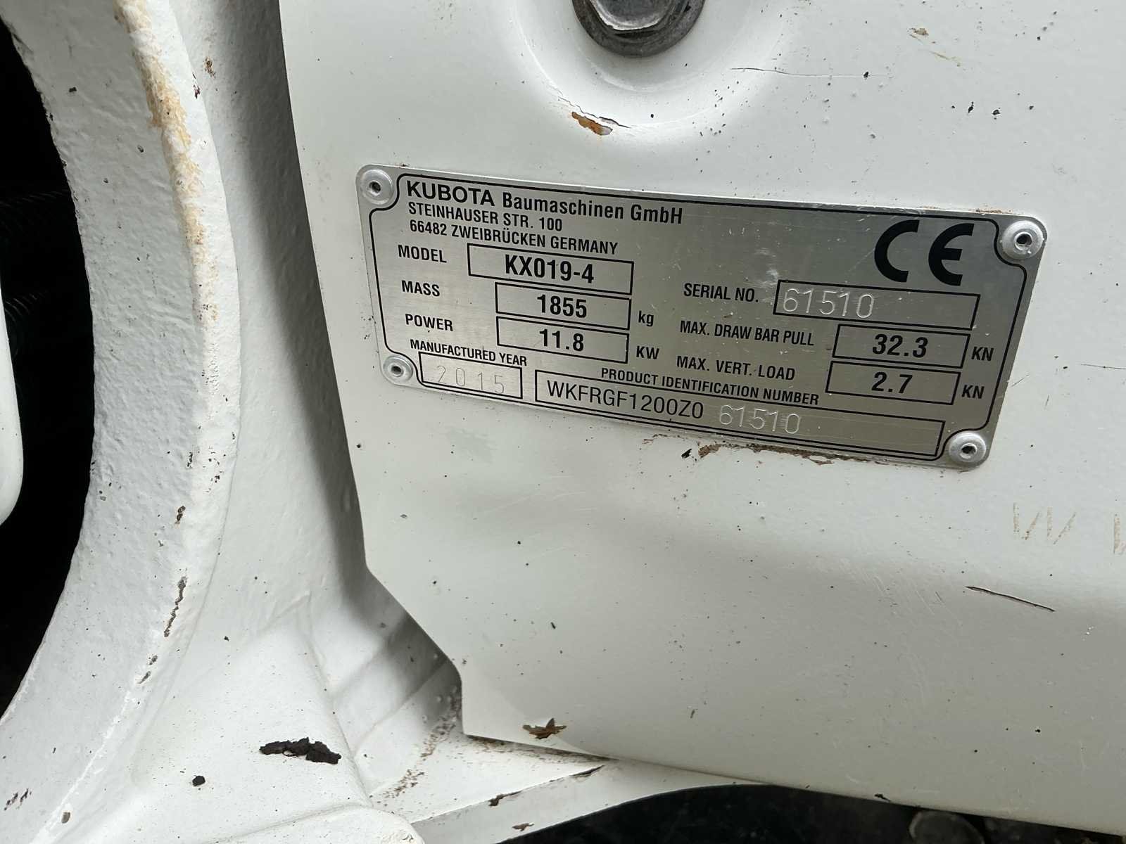 Voorzien van: 2x extra graafbakken, trekhaak, werkverlichting, radio, wreeds rijsnelheid, rode sleutel, in breedte verstelbare rupsen, schuifbladverbreders, hydraulische snelwissel, CW05, 1 extra hydraulische functie, zwenkgiek links/rechts, verwarming, extra hydraulische bediening op joystick, openslaande voorruit Nee Merk: Kubota Type: KX019-4 Bouwjaar: 2015 Serienummer: 61510 Motorvermogen (kW): 11.8kW Bedrijfsgewicht: 1855kg Inclusief graafbak: Ja Graafbak afm. l: 100mm Graafbak afm. b: 390mm Graafbak afm. h: 330mm Rups breedte: 330mm Afgelezen urenstand: 3115 Eigen gewicht: 1855kg Totale afmeting L: 2720mm Totale afmeting Breedte: 1020mm Totale afmeting Hoogte: 2480mm