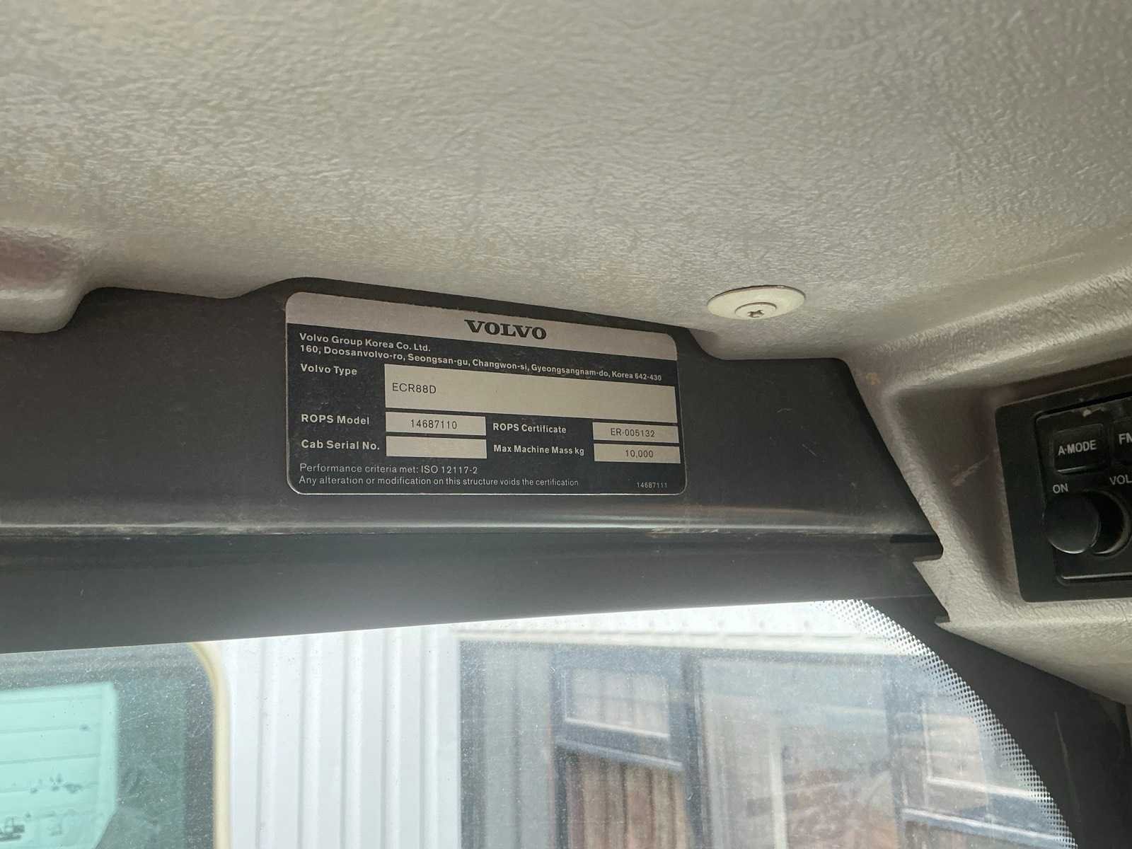 Voorzien van werkverlichting, radio, airco, extra functies. Voorzien van 2 diverse graafbakken. Nee Merk: Volvo Type: ECR88D Bouwjaar: 2016 Serienummer: VCE00E88L00212249 Merk motor: Volvo Motorvermogen (kW): 42kW Aantal cilinders: 4 Brandstof: Diesel Max. werkbereik: 6800mm Max. graafdiepte: 4130mm Rups breedte: 450mm Cabine: true Afgelezen urenstand: 4615 Eigen gewicht: 8778kg Totale afmeting L: 6450mm Totale afmeting Breedte: 2320mm Totale afmeting Hoogte: 2700mm