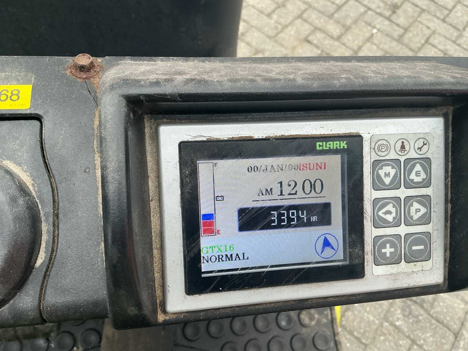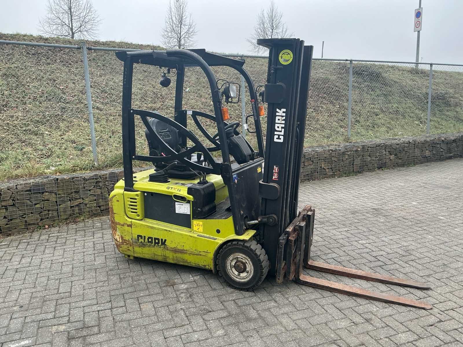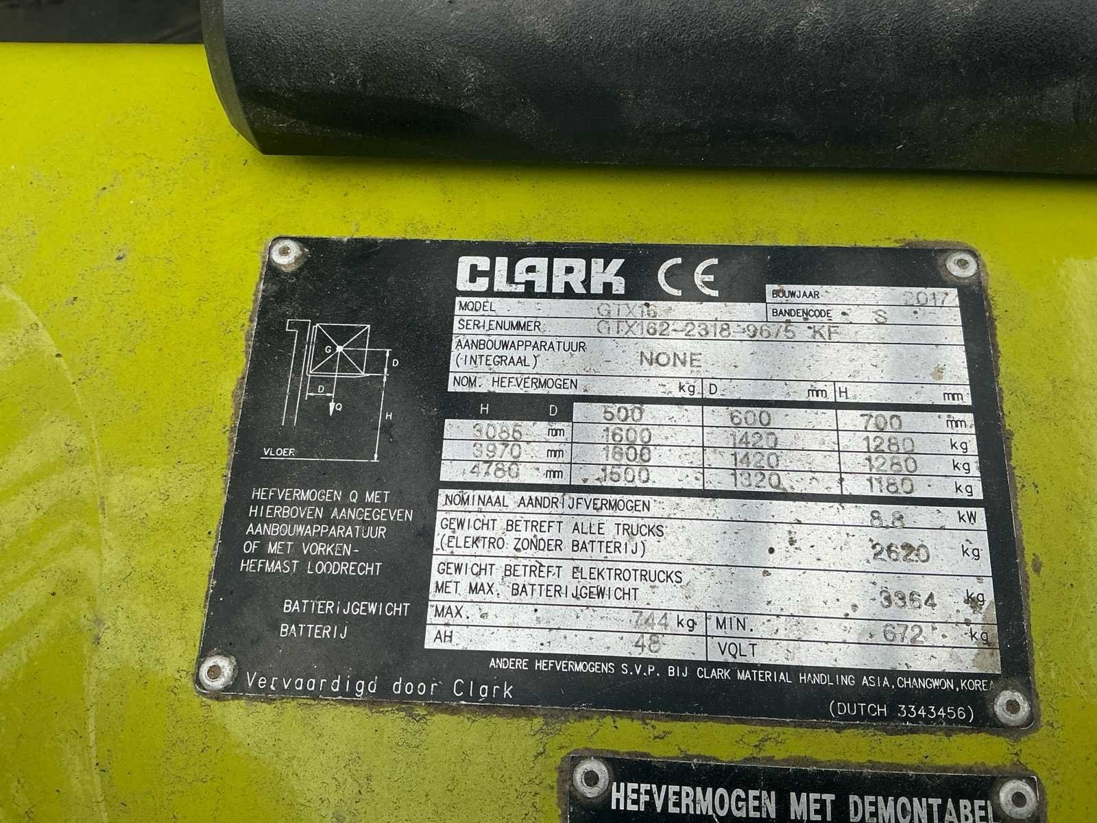 Voorzien van: side-shift, triplex mast, volrubber banden, led verlichting, verstelbare stuurkolom, acculader, Nee Merk: Clark Type: GTX16 Bouwjaar: 2017 Serienummer: GTX162-2318-9675 Brandstof: Elektrisch Mast: Triplex Soort band: Volrubber Aantal wielen: 3 Afgelezen urenstand: 3394 Side-shift: true Triple mast: true Eigen gewicht: 3364kg Hefvermogen: 1600kg Lepellengte: 1050mm Vol rubber banden: true Minimale doorrijhoogte: 2150mm Totale afmeting L: 3000mm Totale afmeting Breedte: 1100mm Totale afmeting Hoogte: 2150mm