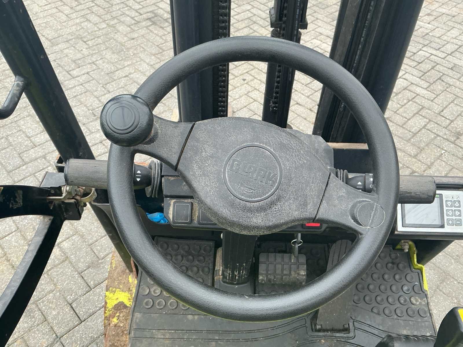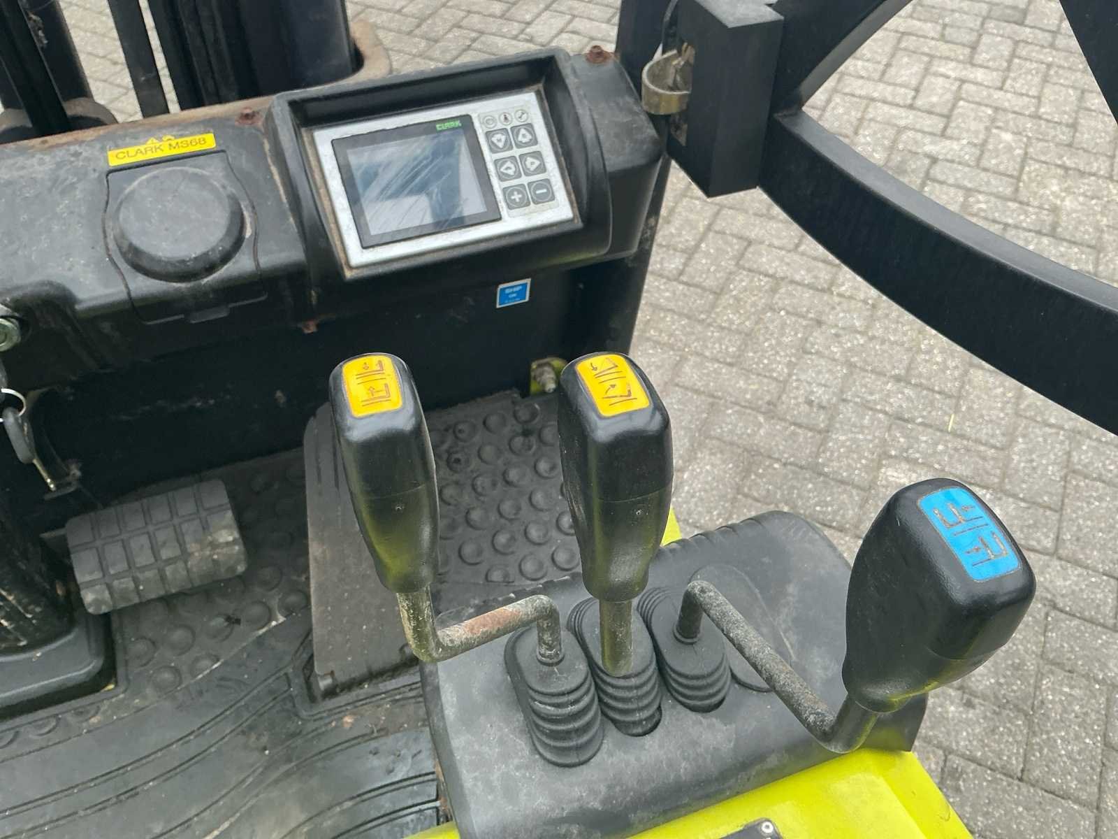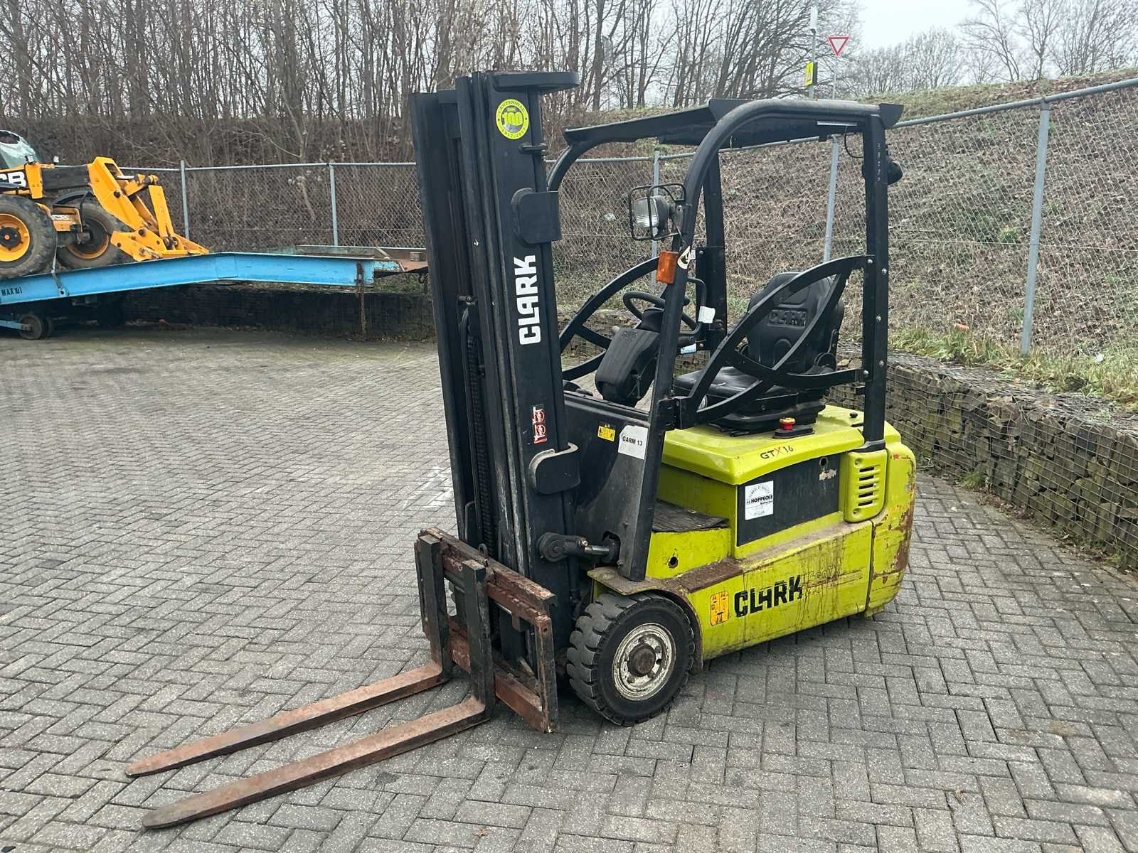 Voorzien van: side-shift, triplex mast, volrubber banden, led verlichting, verstelbare stuurkolom, acculader, Nee Merk: Clark Type: GTX16 Bouwjaar: 2017 Serienummer: GTX162-2318-9675 Brandstof: Elektrisch Mast: Triplex Soort band: Volrubber Aantal wielen: 3 Afgelezen urenstand: 3394 Side-shift: true Triple mast: true Eigen gewicht: 3364kg Hefvermogen: 1600kg Lepellengte: 1050mm Vol rubber banden: true Minimale doorrijhoogte: 2150mm Totale afmeting L: 3000mm Totale afmeting Breedte: 1100mm Totale afmeting Hoogte: 2150mm