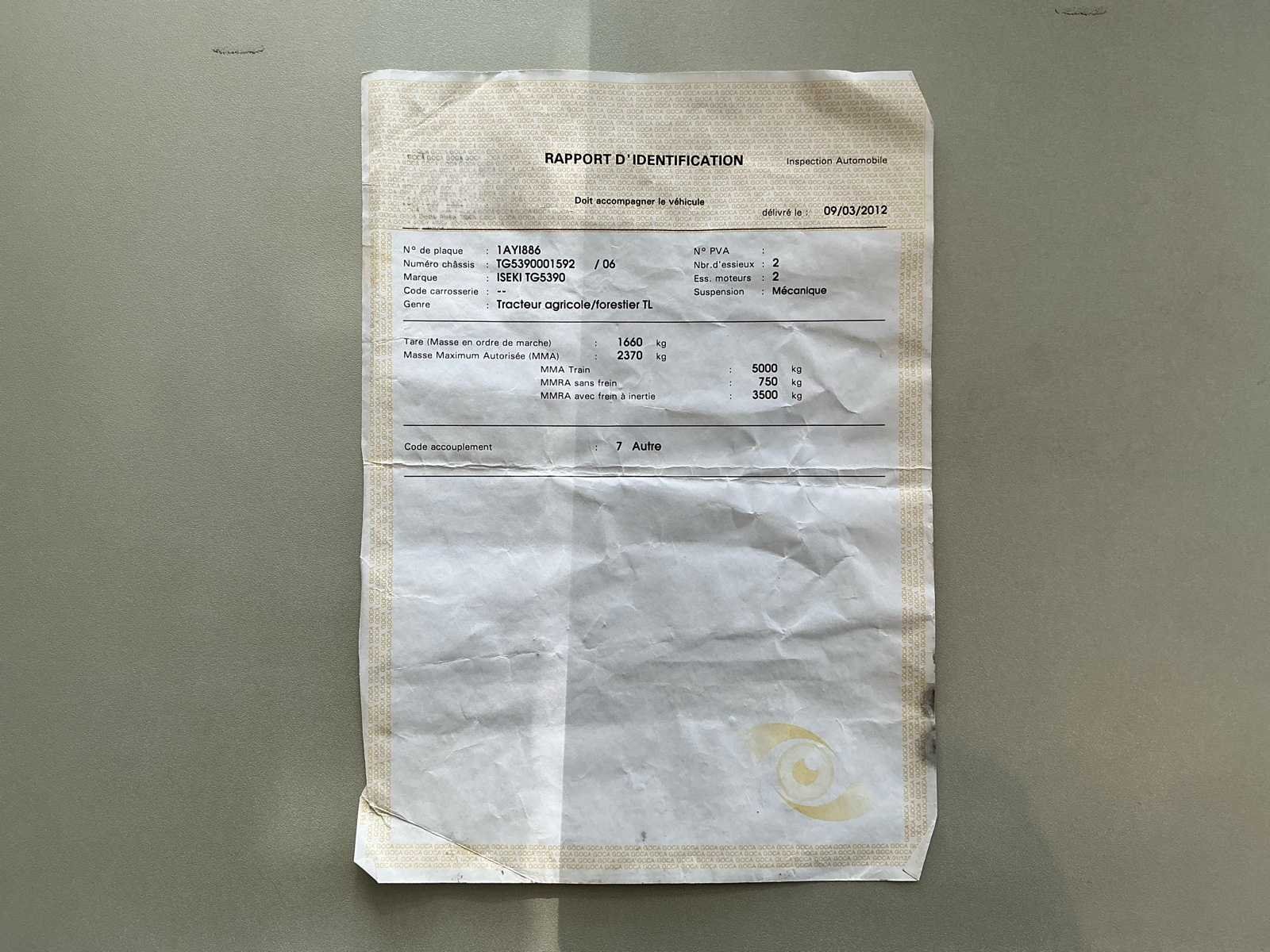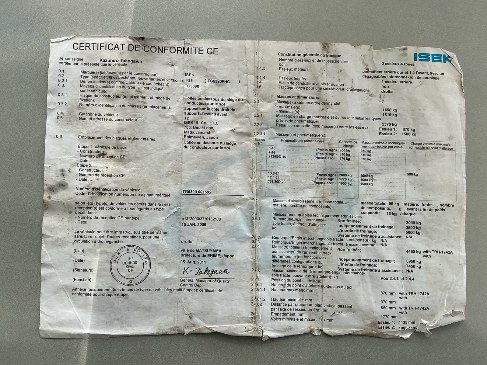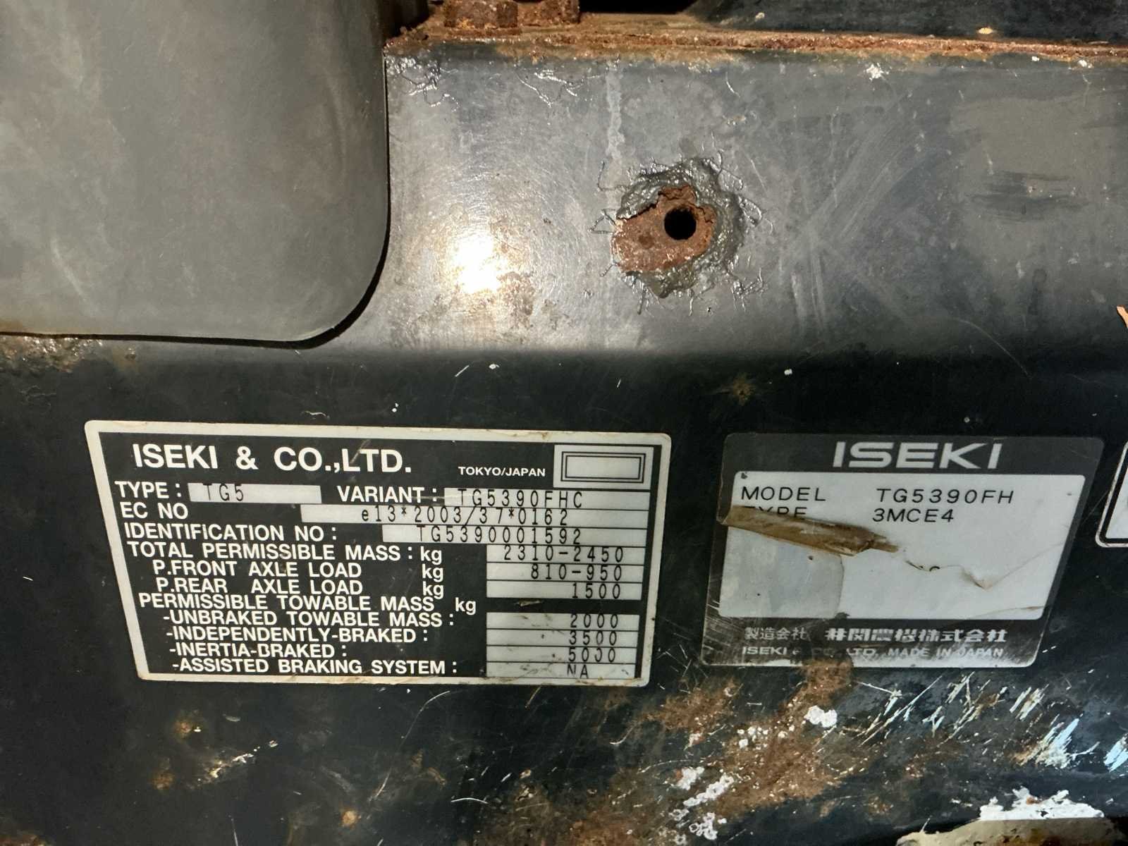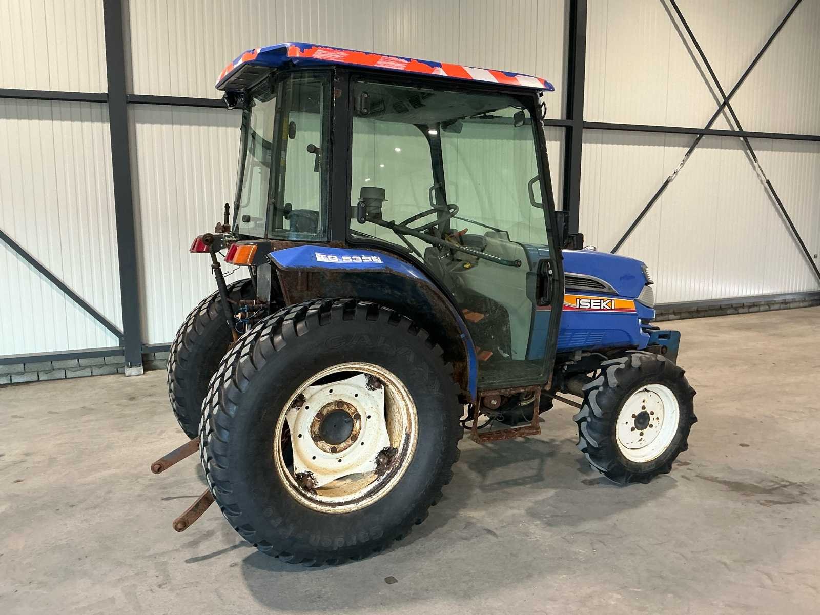 Voorzien van: dieselmotor, gesloten cabine, airco, verwarming, frontgewichten, 3punts hefinrichting achterzijde, aftakas achterzijde, hydraulische ventielen achterzijde, verlichting, hydrostatische versnellingsbak. Nee Merk: Iseki Type: TG5390 Bouwjaar: 2012 Chassisnummer: TG5390001592 Motorvermogen (kW): 30kW Afgelezen urenstand: 3406 Versnellingsbaktype: Hydrostatisch Bandenmaat voor: TR-144 Bandenmaat achter: 380/70R24 Aantal hydraulische ventielen achter: 4 Frontgewichtenset: true Totale afmeting L: 3200mm Totale afmeting Breedte: 1600mm Totale afmeting Hoogte: 220mm Kentekenpapieren compleet?: true Nationaliteit documenten: België