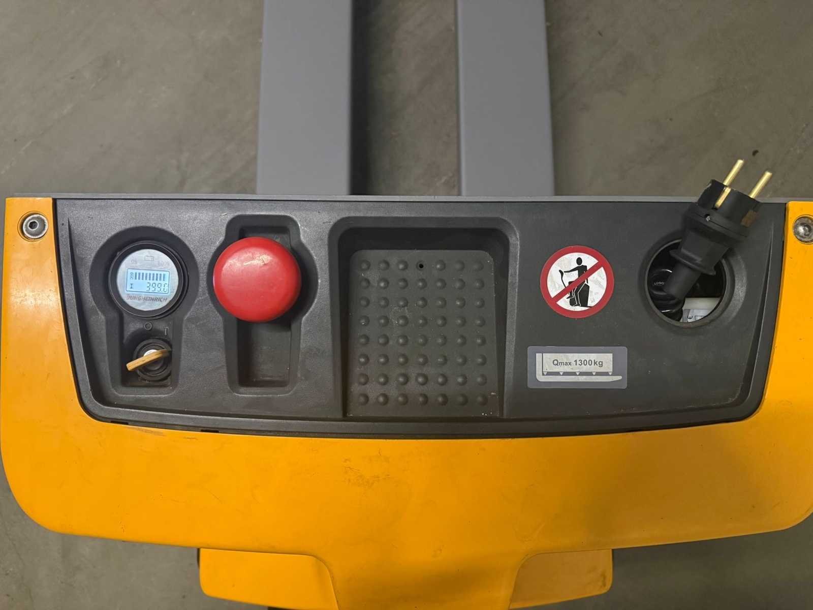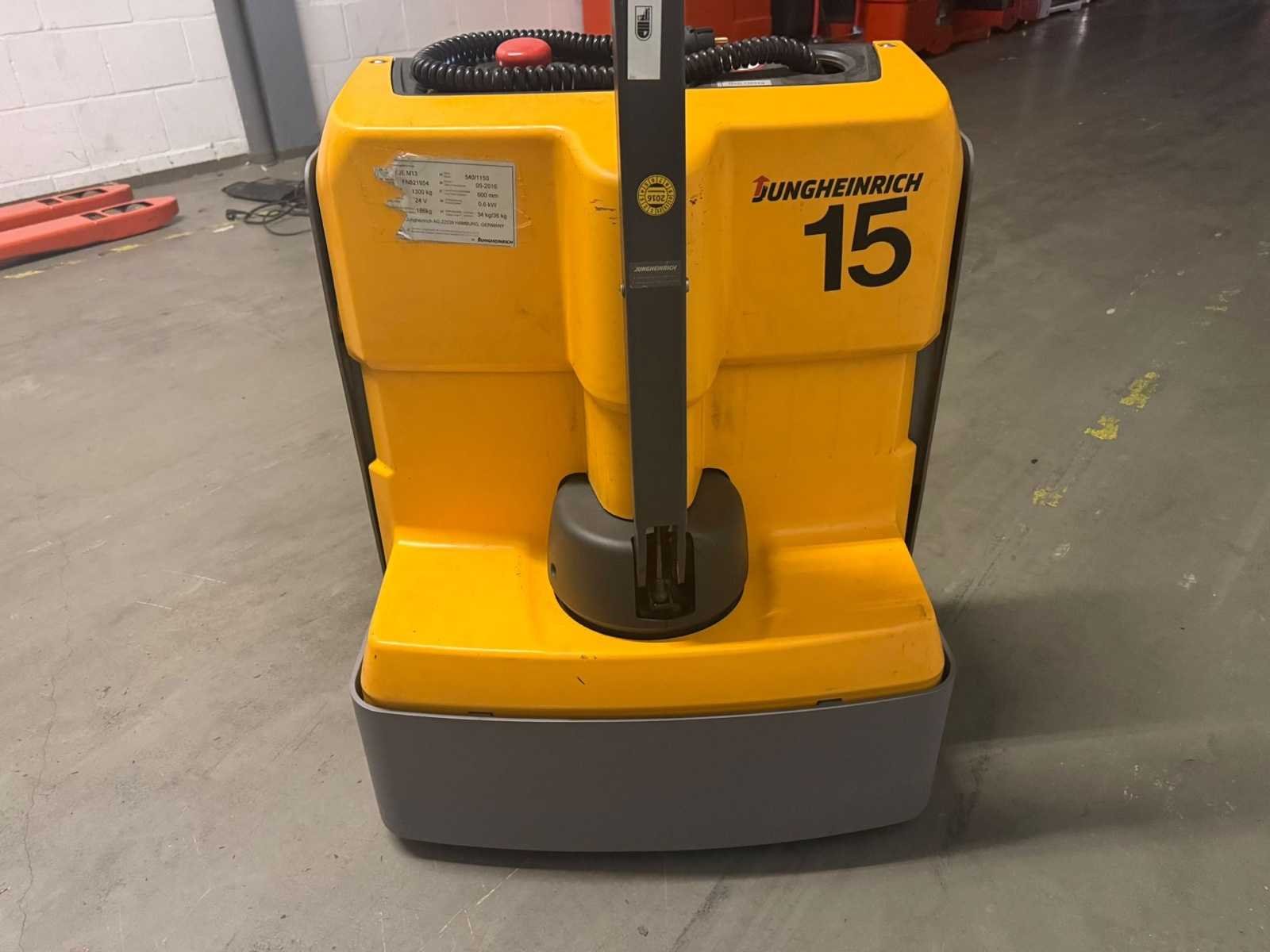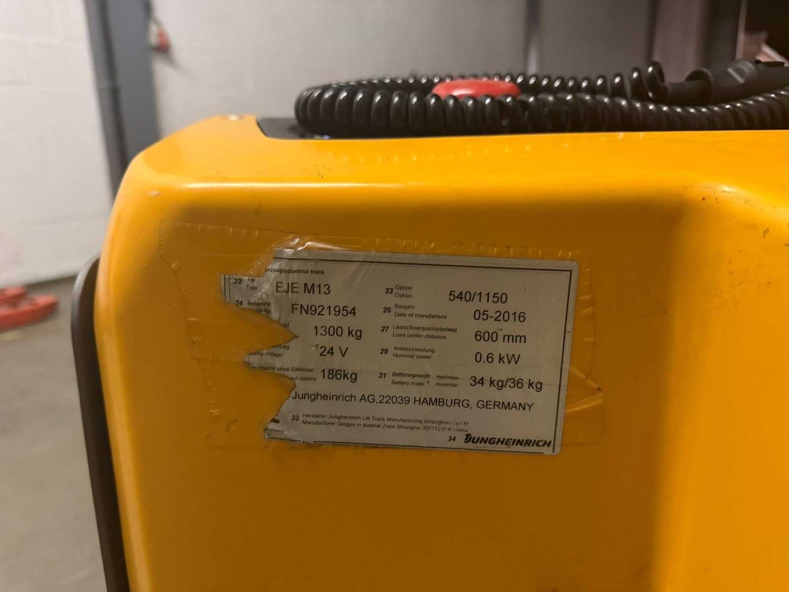 Voorzien van : EJE M13 ( Jungheinrich ), serie nummer : FN921954, hef vermogen : 1300kg, eigen gewicht incl batterij : 225kg, urenstand : 399, bouwjaar : 05-2016, wielbasis 1.212 m, standard banden TPU 1x+2/4, lengte 1.585 m, breedte 0.65 m, hoogte 0.74 m, hefhoogte 0.12 m, ractiemotor 0.6 kW, hijsmotor 1.2 kW, draaicirkel 1.357 m, model serie EJE Nee Merk: Jungheinrich Type: EJE M13 Bouwjaar: 2016 Serienummer: FN921954 Hefvermogen: 1300kg Vol rubber banden: true Afgelezen urenstand: 339 Eigen gewicht: 225kg Totale afmeting L: 1600mm Totale afmeting Breedte: 650mm Totale afmeting Hoogte: 740mm