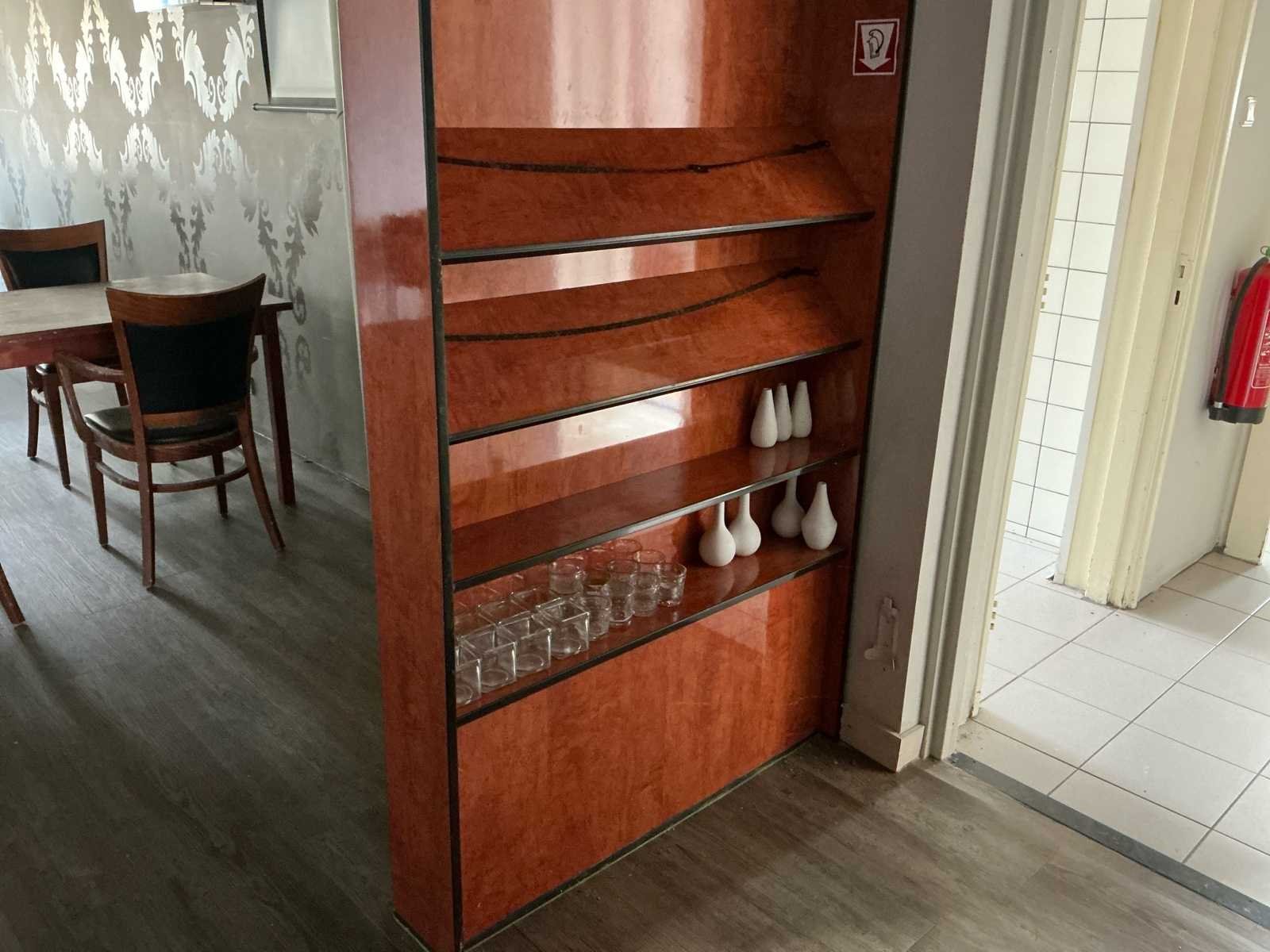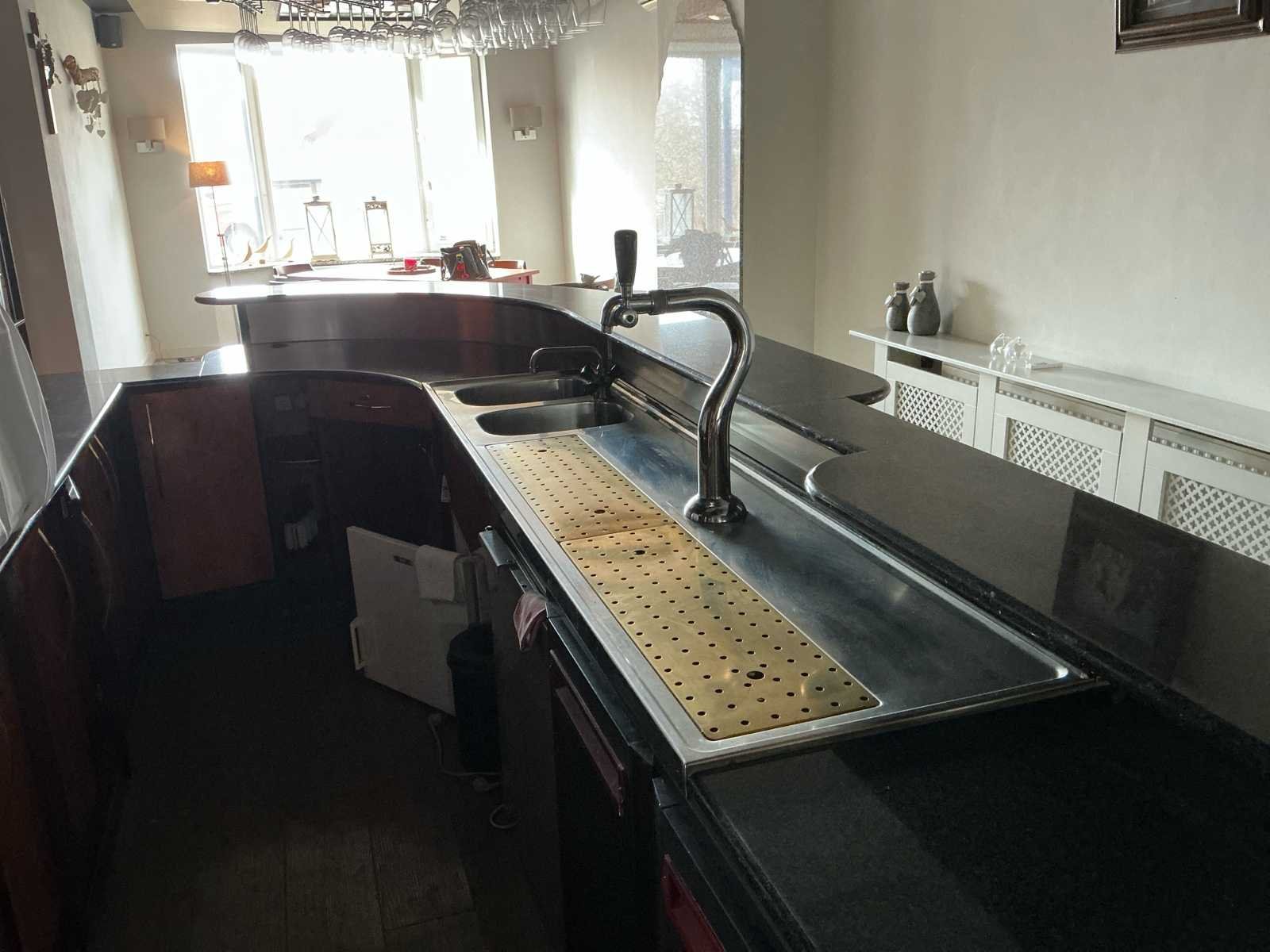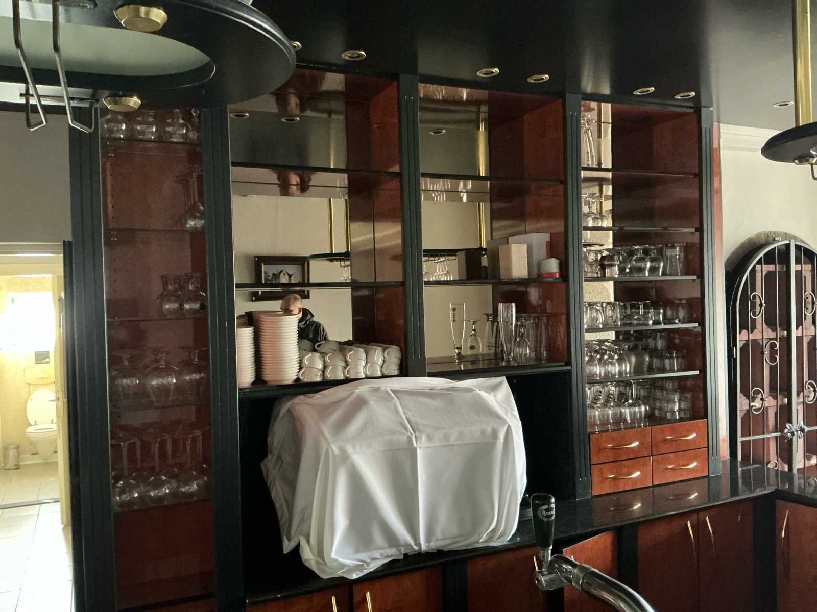Bestaat uit: complete horecabar met achterwand, koelingen, fustkoeler en spoelunit, representatieve baropstelling geschikt voor gebruik in horeca, café, restaurant of evenementlocatie, bar is uitgevoerd met een gebogen frontpaneel, donker werkblad (steen/composiet uitstraling) en een luxe achterwand met glazen legplanken en geïntegreerde glasophangsystemen, de afwerking bestaat uit houtfineer panelen met zwarte omlijsting en messingkleurige accenten, samenstelling kavel: gebogen barmeubel met werkblad. achterwand met glazen schappen en opberglades,plafondgemonteerde glasophangrekken, dubbele RVS spoelbak met mengkraan, ingebouwde biertap met lekblad, fustkoeler, 2x Gamko barkoelingen (Type HFK20/2, bouwjaar 2004, 220-240V),1x Zanussi onderbouwkoelkast, diverse opberglades en kastruimte (Glaswerk en overige losse inventaris uitsluitend inbegrepen indien aanwezig bij oplevering.), totaal lengte bar 4700mm, 2200mm, 1100mm hoog, Nee Totale afmeting L: 4700mm Totale afmeting Breedte: 2200mm Totale afmeting Hoogte: 1100mm