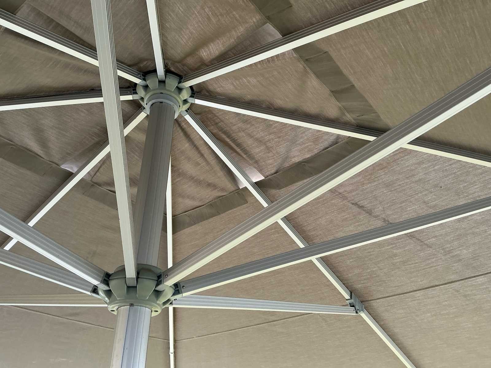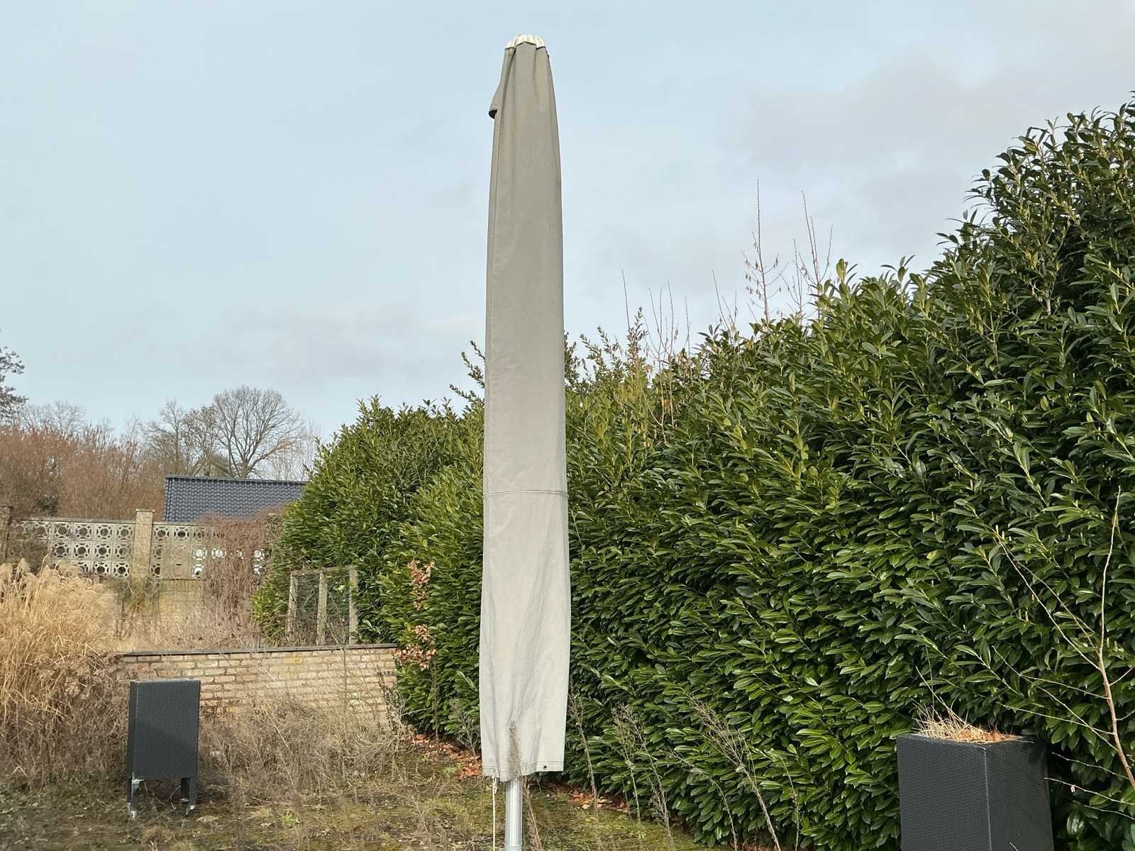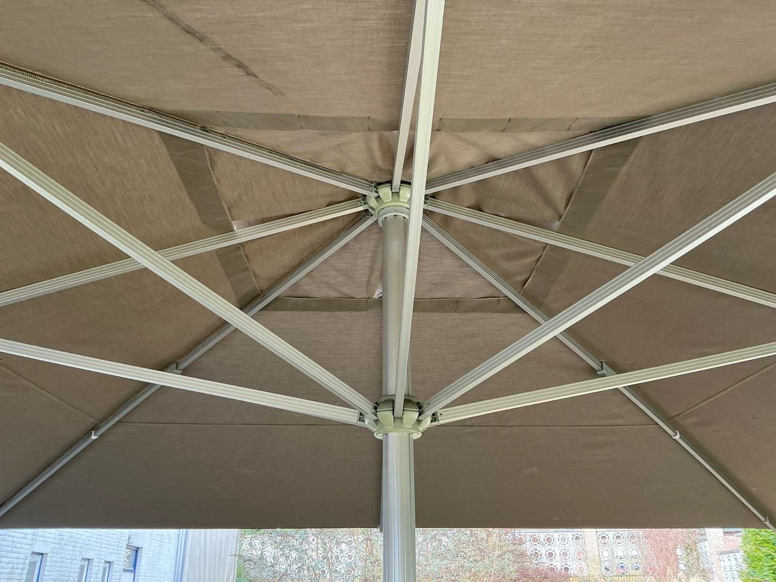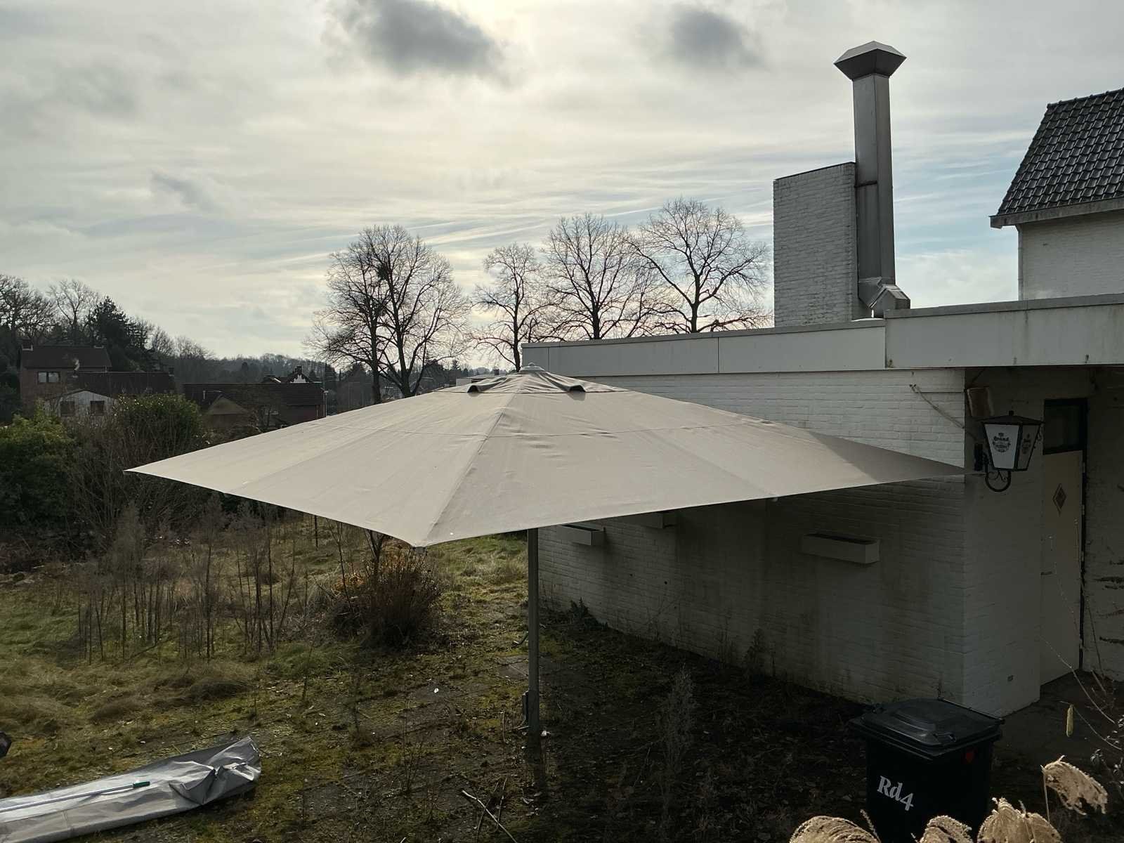 Voorzien van: 2 professionele terrasparasols van het merk Solero, 5Mtrx5Mtr, geschikt voor gebruik in horeca, evenementen of particuliere buitenruimtes, aluminium frame en een doek in neutrale beige/taupe kleur, centrale mast met handslinger voor het openen en sluiten, gemonteerd op vaste stalen voetplaten, geschikt voor verankering op een vaste ondergrond, inclusief bijbehorende beschermhoezen, inclusief handslingers, uitschuifbare stok om beschermhoes te plaatsen, geschikt voor terras of horecagebruik, onderloop hoogte 2200mm, ingeklapt 5000mm lang, met hoes, betreft 2 stuks, inclusief handels en schuifstok. Nee Merk: Solero Parasolvoet: true Verstelbaar: true Lengte: 500cm Breedte: 500cm Hoogte: 220cm