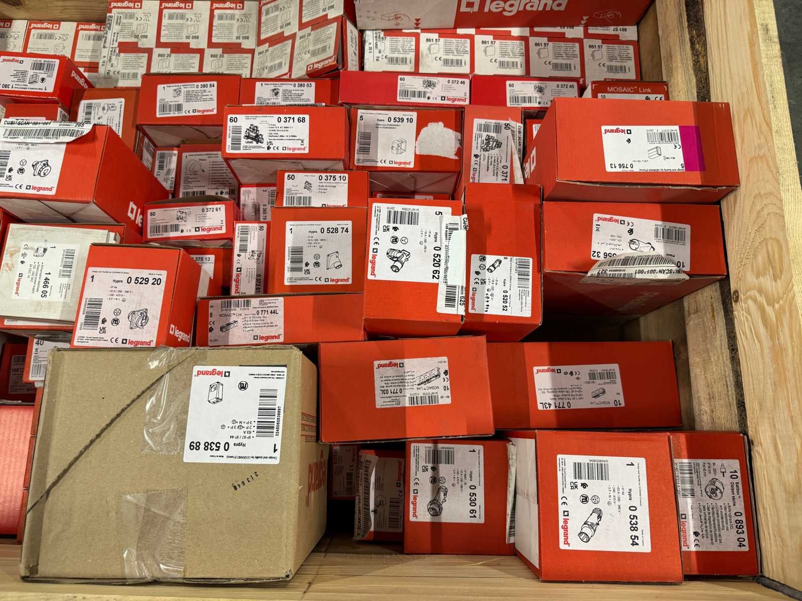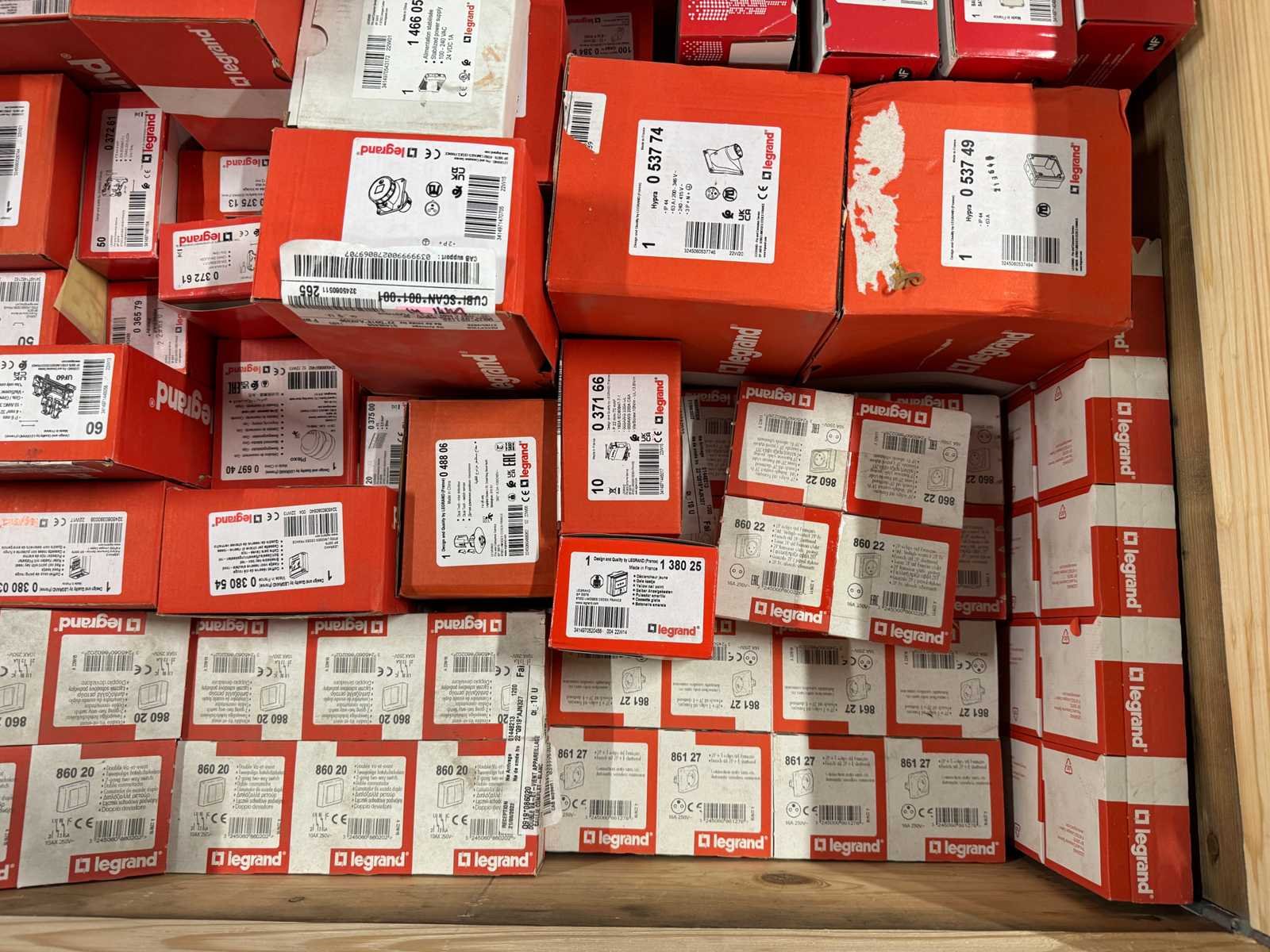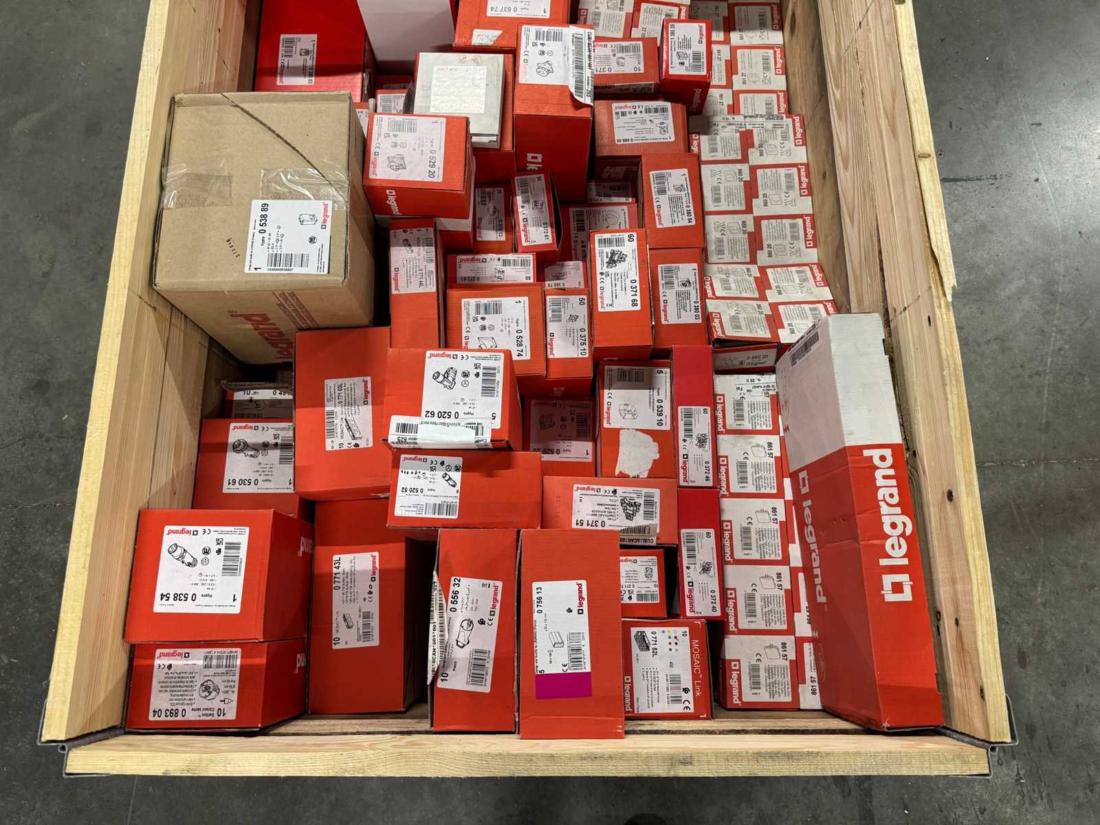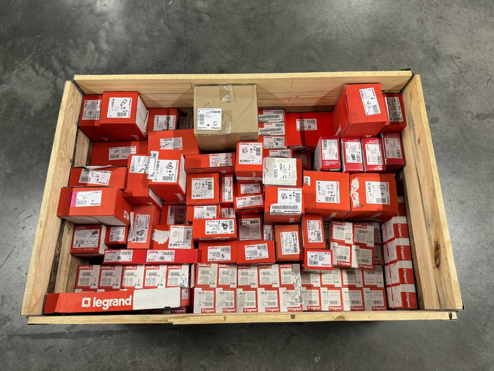<li>Partij Legrand elektra installatiemateriaal</li> <li>Selectie van artikelnummers in deze partij (niet volledig):</li> <li>0 371 66 – min. 1x</li> <li>0 371 68 – min. 1x</li> <li>0 372 46 – min. 1x</li> <li>0 375 10 – min. 1x</li> <li>0 380 03 – min. 1x</li> <li>0 520 52 – min. 1x</li> <li>0 520 62 – min. 1x</li> <li>0 530 61 – min. 1x</li> <li>0 538 54 – min. 1x</li> <li>0 538 89 – min. 1x</li> <li>0 539 10 – min. 1x</li> <li>0 556 65 – min. 1x</li> <li>0 557 06 – min. 1x</li> <li>0 771 03 – min. 1x</li> <li>0 893 04 – min. 1x</li> <li>1 380 25 – min. 1x</li> <li>1 466 05 – min. 1x</li> <li>860 20 / 860 22 / 861 27 / 861 57 – meerdere stuks aanwezig</li> No Merk: Legrand