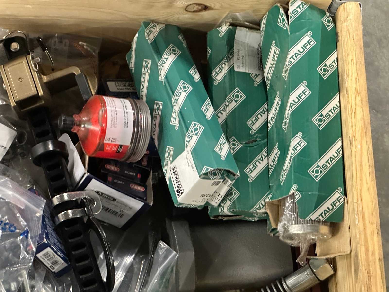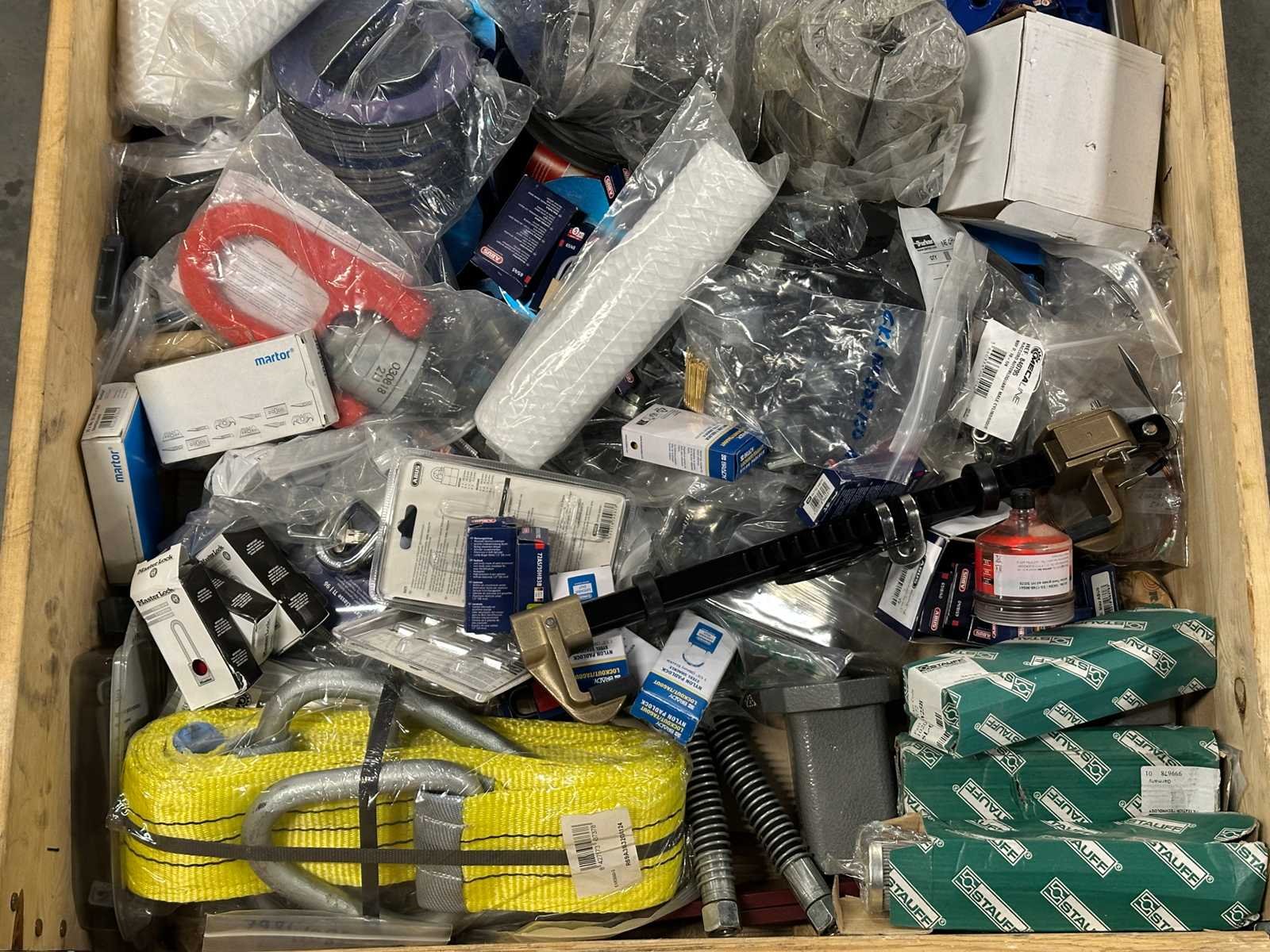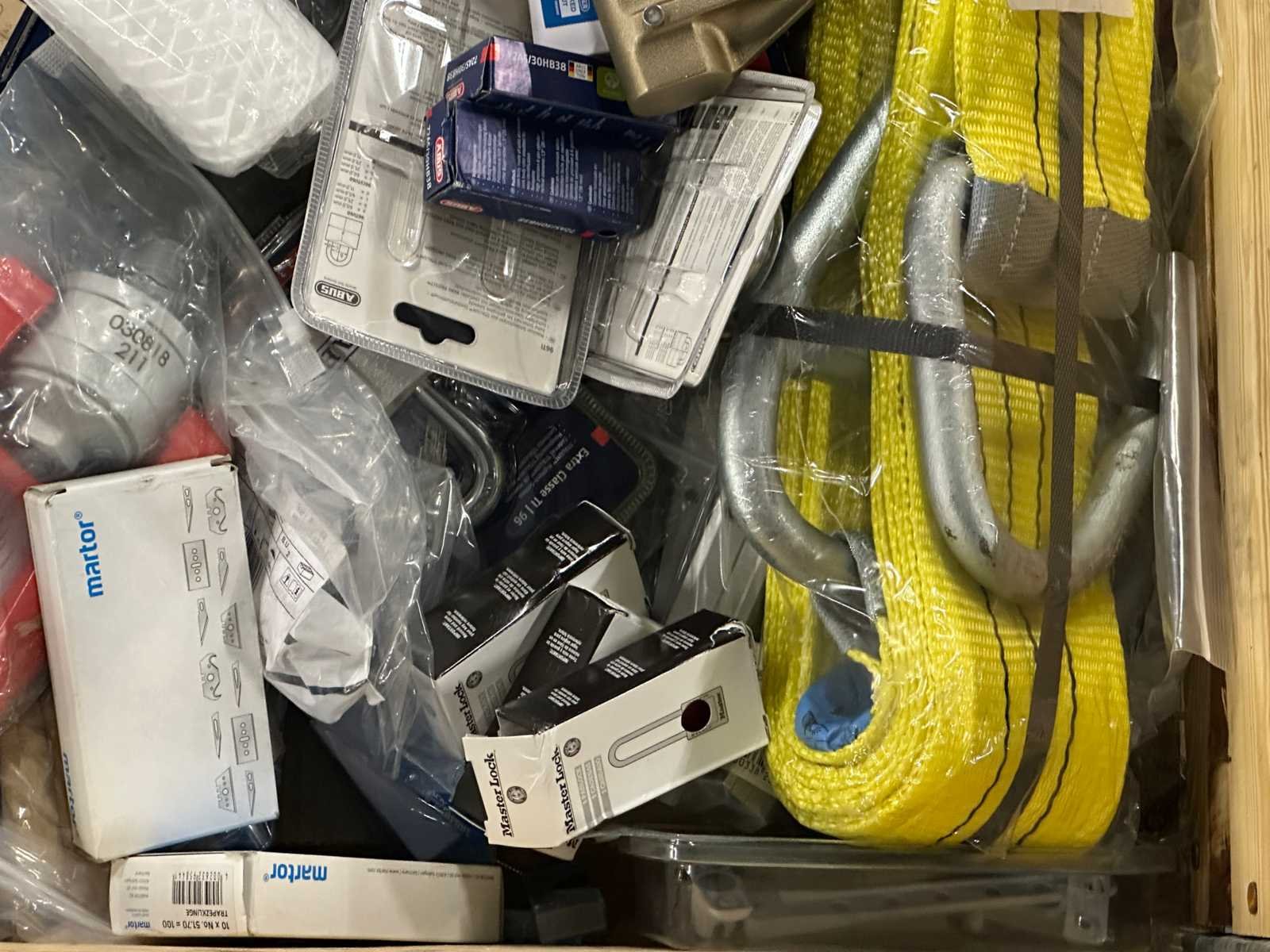 Mix partij onderdelen, sloten, hijsmiddelen, pneumatiek