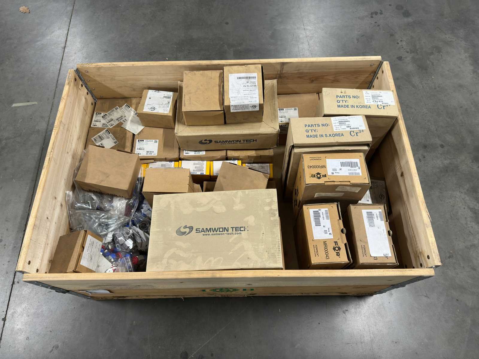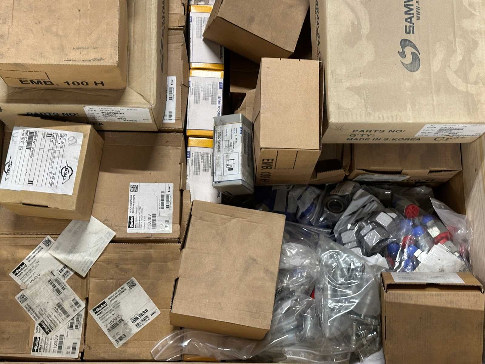 <li>Partij hydraulische koppelingen & fittingen</li> <li> Staat: ongebruikt</li> <li> Gewicht: 89KG net </li> No Merk: Parker, Samwon Tech