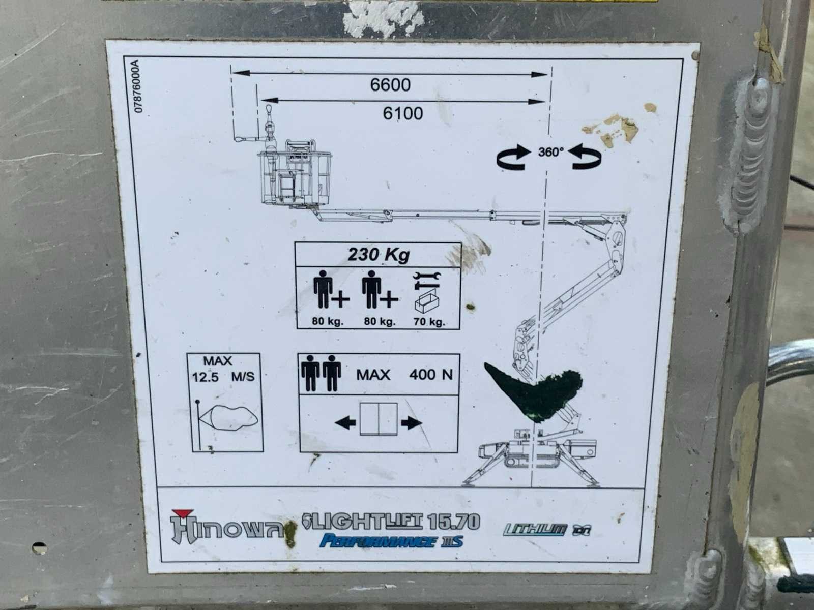 Binnen en buiten, max. rotatie: 360°, dubbele rijsnelheid: 1,4-2,6 km/uur, maximum scheefstand (B /L) 16,00, max. wind 12,50, voorzien van hydraulische stempels, stempelbreedte buitenmaat: 3,25 meter, Lithum -ion accu’s, aansluiting: 230 volt / 50 Hz, stroom en water en perslucht aansluiting in de korf. Non-marking tracks. Inclusief hoogwerkerboek en volledige onderhoudshistorie Nee Merk: Hinowa Type: Lightlift 15.70LI Performance IIIS Bouwjaar: 2018 Serienummer: 1 BV15 Elektrisch: true Knikarm hoogwerker: true Werkhoogte: 15400mm Horizontale rijkwijdte: 6600mm Plateau afm. l: 1330mm Plateau afm. b: 690mm Platform capaciteit: 230kg Afgelezen urenstand: 189 Eigen gewicht: 1992kg Totale afmeting L: 4020mm Totale afmeting Breedte: 748mm Totale afmeting Hoogte: 1990mm