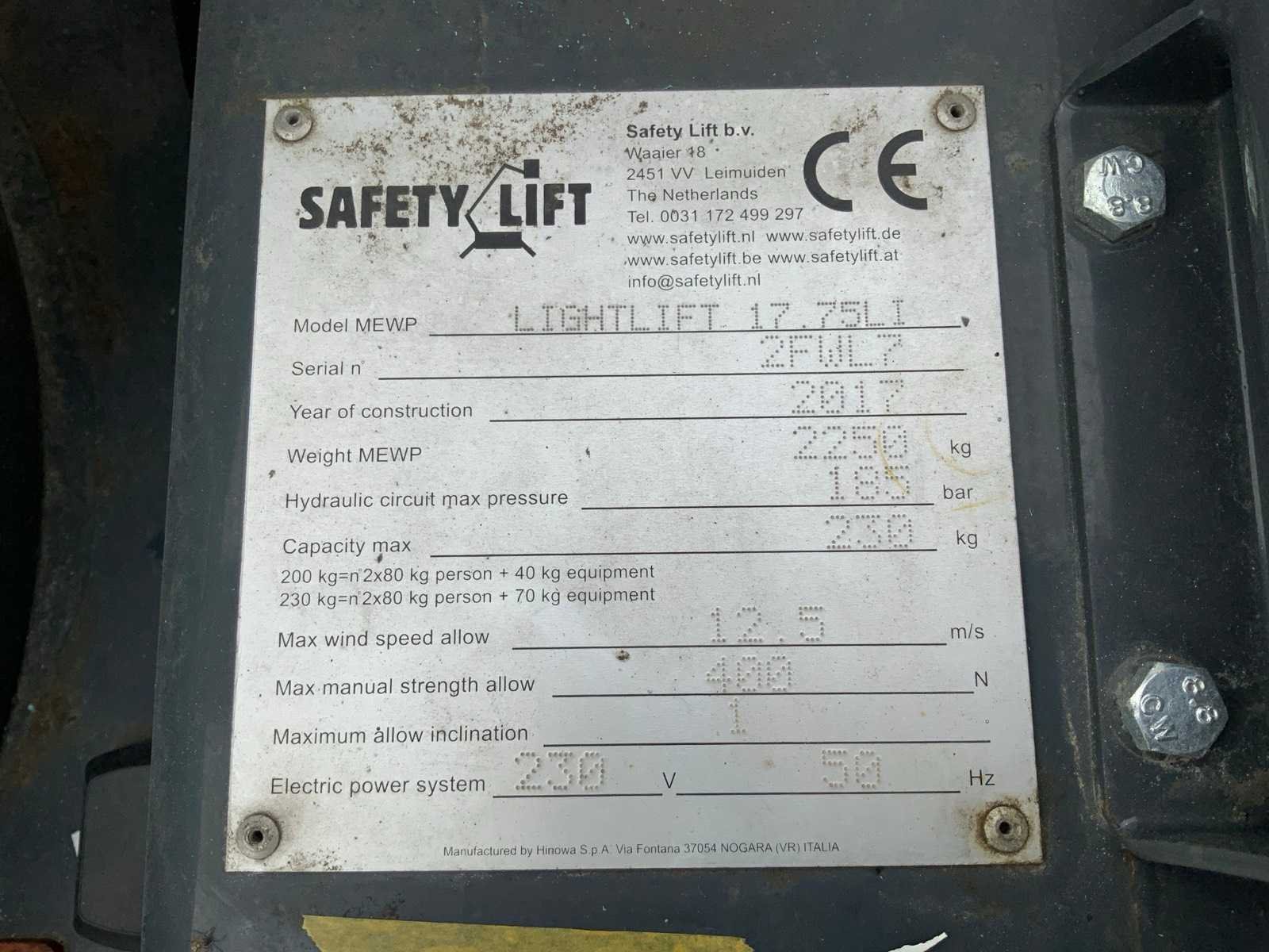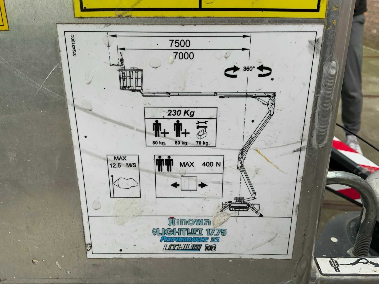 Binnen en buiten, max. 360° rotatie, dubbele rijsnelheid: 1,8-3,6 km/uur, maximum scheefstand ( B / L) 16,00, max. wind 12,50, voorzien van hydraulische stempels, stempelbreedte buitenmaat: 3,35m, Lithum -ion accu, aansluiting: 230 volt / 50 HZ, perslucht, water en stroom aansluiting in de korf, Non-marking tracks. Inclusief hoogwerkerboek en volledige onderhoudshistorie Nee Merk: Hinowa Type: Lightlift 17.75LI Performance IIIS Bouwjaar: 2017 Serienummer: 2FWL7 Elektrisch: true Werkhoogte: 17060mm Horizontale rijkwijdte: 7500mm Plateau afm. l: 1330mm Plateau afm. b: 690mm Platform capaciteit: 230kg Afgelezen urenstand: 190 Eigen gewicht: 2250kg Totale afmeting L: 4527mm Totale afmeting Breedte: 1300mm Totale afmeting Hoogte: 1998mm