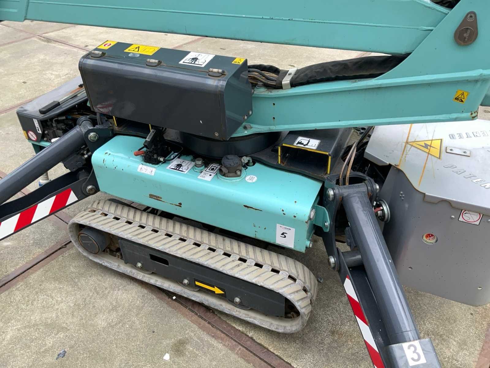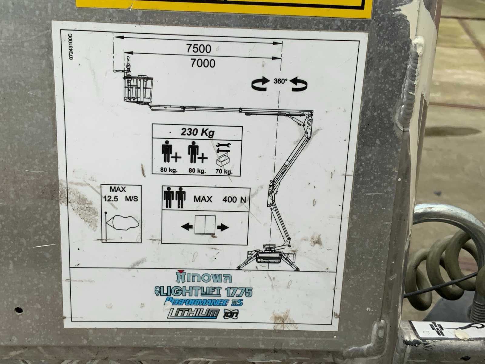 Binnen en buiten, max. 360° rotatie, dubbele rijsnelheid: 1,8-3,6 km/uur, maximum scheefstand ( B / L) 16,00, max. wind 12,50, voorzien van hydraulische stempels, stempelbreedte buitenmaat: 3,35m, Lithum -ion accu, aansluiting: 230 volt / 50 HZ, perslucht, water en stroom aansluiting in de korf, Non-marking tracks. Inclusief hoogwerkerboek en volledige onderhoudshistorie Nee Merk: Hinowa Type: Lightlift 17.75LI Performance IIIS Bouwjaar: 2018 Serienummer: 2MOL7 Elektrisch: true Werkhoogte: 17060mm Horizontale rijkwijdte: 7500mm Plateau afm. l: 1330mm Plateau afm. b: 690mm Platform capaciteit: 230kg Accu lader: true Afgelezen urenstand: 241 Eigen gewicht: 2250kg Totale afmeting L: 4527mm Totale afmeting Breedte: 786mm Totale afmeting Hoogte: 1998mm