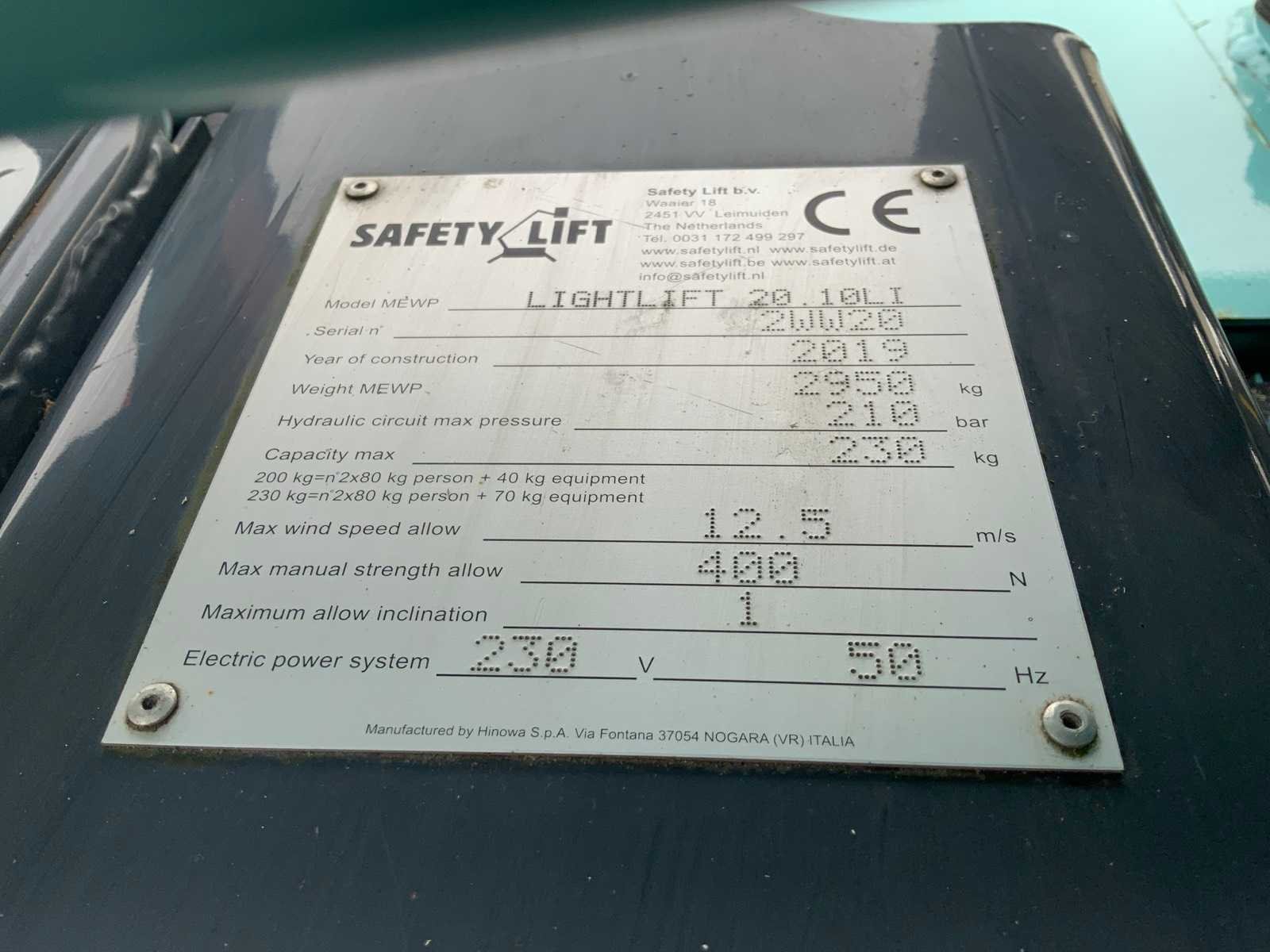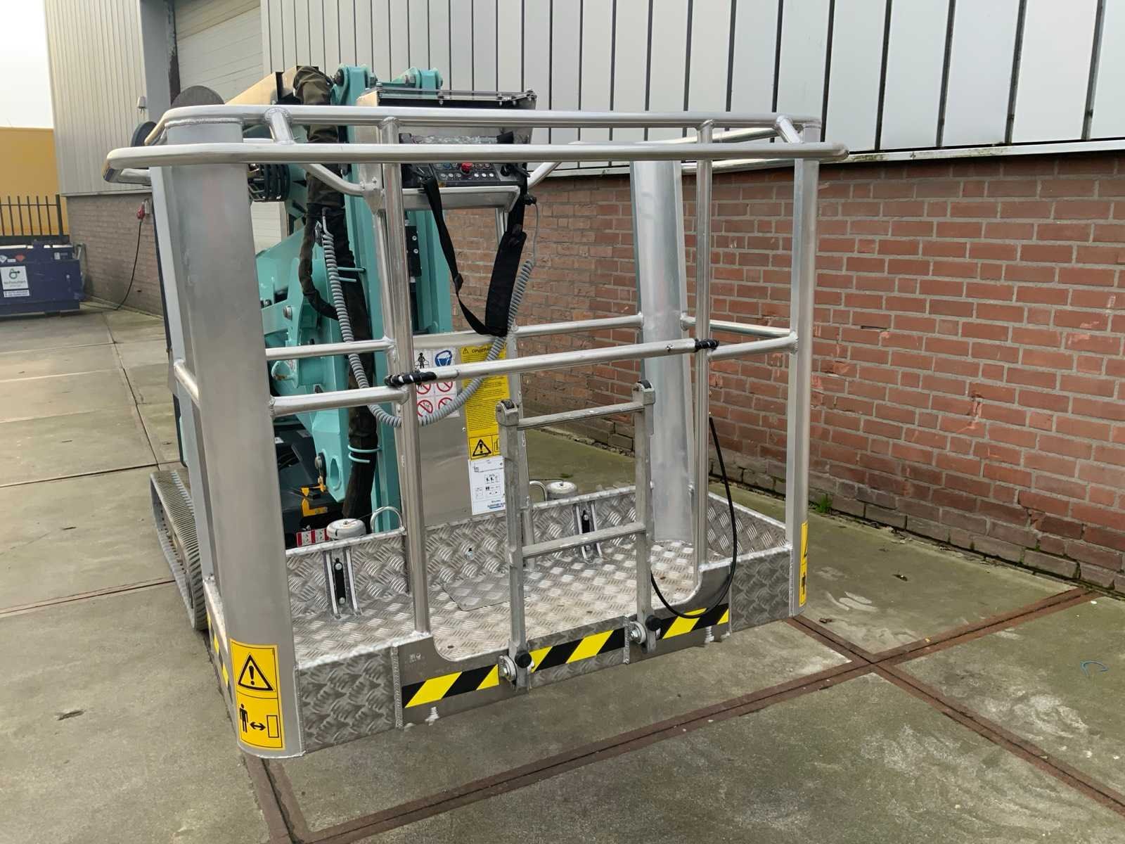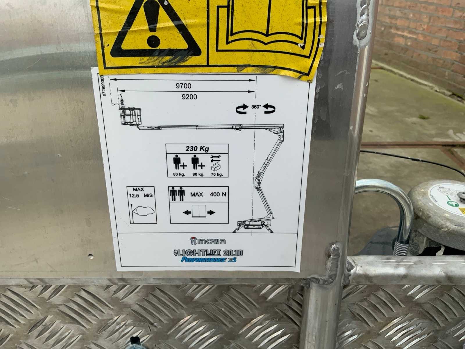 Binnen en buiten, Max. rotatie 360°, dubbele rij snelheid, maximum scheefstand (B / L) 15,00, max. wind 15.00, voorzien van hydraulische stempels, stempelbreedte buitenmaat: 3,35 meter, Lithum-ion accu’s, aansluit spanning: 230 volt, 50 Hz, perslucht, water en stroom aansluiting in de korf, Non-marking tracks. Inclusief hoogwerkerboek en volledige onderhoudshistorie Nee Merk: Hinowa Type: Lightlift 20.10LI Performance IIIS Bouwjaar: 2019 Serienummer: 2WW20 Elektrisch: true Werkhoogte: 20000mm Horizontale rijkwijdte: 9.7mm Plateau afm. l: 1330mm Plateau afm. b: 690mm Platform capaciteit: 230kg Accu lader: true Afgelezen urenstand: 188 Eigen gewicht: 2950kg Totale afmeting L: 5100mm Totale afmeting Breedte: 1500mm Totale afmeting Hoogte: 2000mm