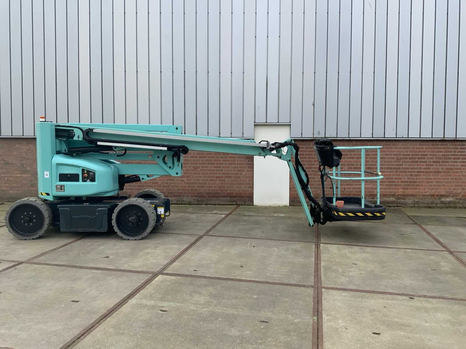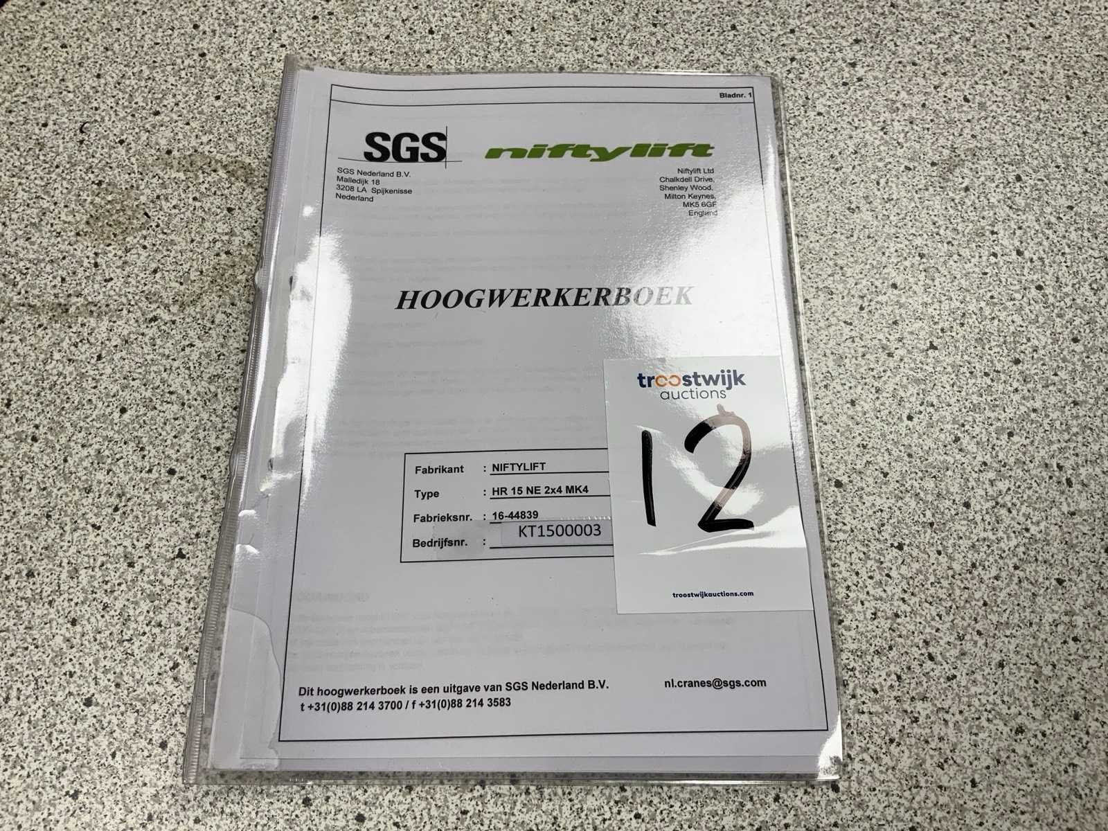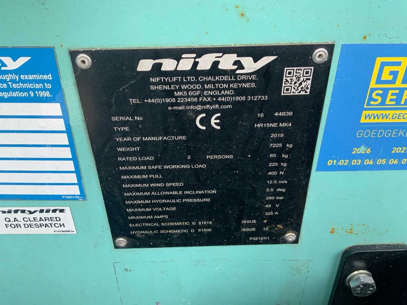 Perslucht en stroom aansluiting tot aan de manbak, aansluiting: 230 volt, 50HZ. voorzien van hoogwerkerboek en volledige onderhoudshistorie Nee Merk: Nifty Type: HR15NE 2x4 MK4 Bouwjaar: 2019 Serienummer: 16 44839 Elektrisch: true Werkhoogte: 15000mm Horizontale rijkwijdte: 9700mm Plateau afm. l: 1500mm Plateau afm. b: 850mm Platform capaciteit: 225kg Accu lader: true Afgelezen urenstand: 400 Eigen gewicht: 7250kg Totale afmeting L: 4930mm Totale afmeting Breedte: 1500mm Totale afmeting Hoogte: 1990mm