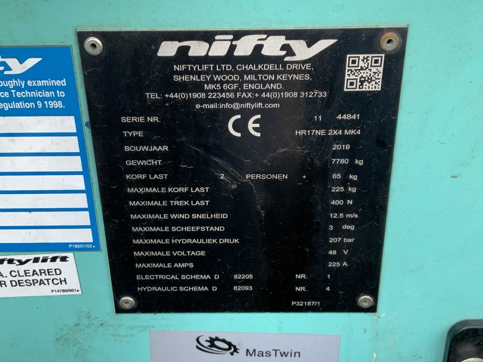 Voorzien van stroomaansluiting in de werkbak, aansluiting: 230 volt. voorzien van hoogwerkerboek en volledige onderhoudshistorie Nee Merk: Nifty Type: HR17NE 2x4 MK4 Bouwjaar: 2019 Serienummer: 11 44841 Elektrisch: true Werkhoogte: 17000mm Horizontale rijkwijdte: 9700mm Plateau afm. l: 1500mm Plateau afm. b: 800mm Platform capaciteit: 225kg Afgelezen urenstand: 400 Eigen gewicht: 7780kg Totale afmeting L: 6600mm Totale afmeting Breedte: 1500mm Totale afmeting Hoogte: 2100mm