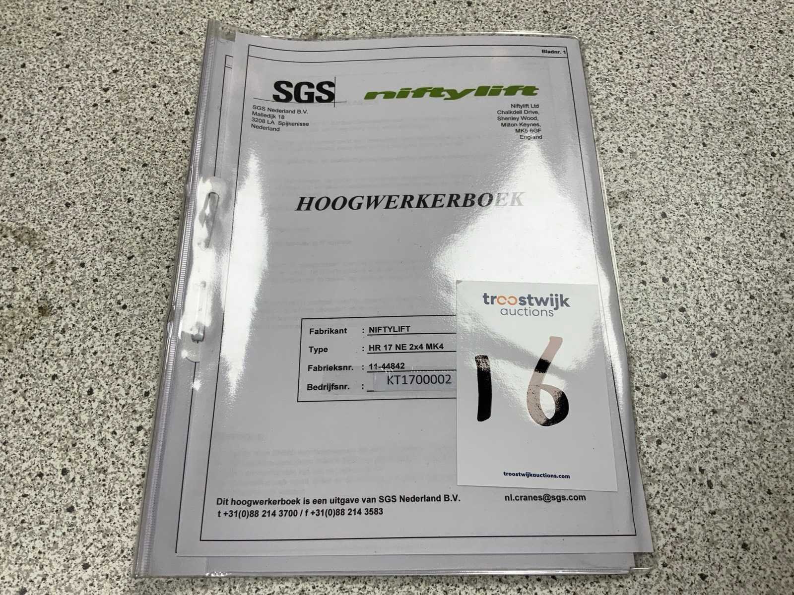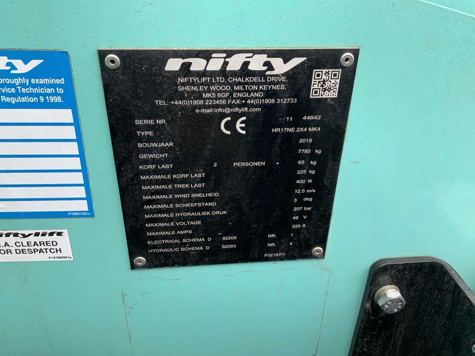 Voorzien van hoogwerkerboek en volledige onderhoudshistorie Nee Merk: Nifty Type: HR17NE Bouwjaar: 2019 Serienummer: 11 44842 Elektrisch: true Werkhoogte: 17000mm Horizontale rijkwijdte: 9700mm Plateau afm. l: 1500mm Plateau afm. b: 800mm Platform capaciteit: 225kg Accu lader: true Afgelezen urenstand: 401 Eigen gewicht: 7780kg Totale afmeting L: 4930mm Totale afmeting Breedte: 1500mm Totale afmeting Hoogte: 1990mm