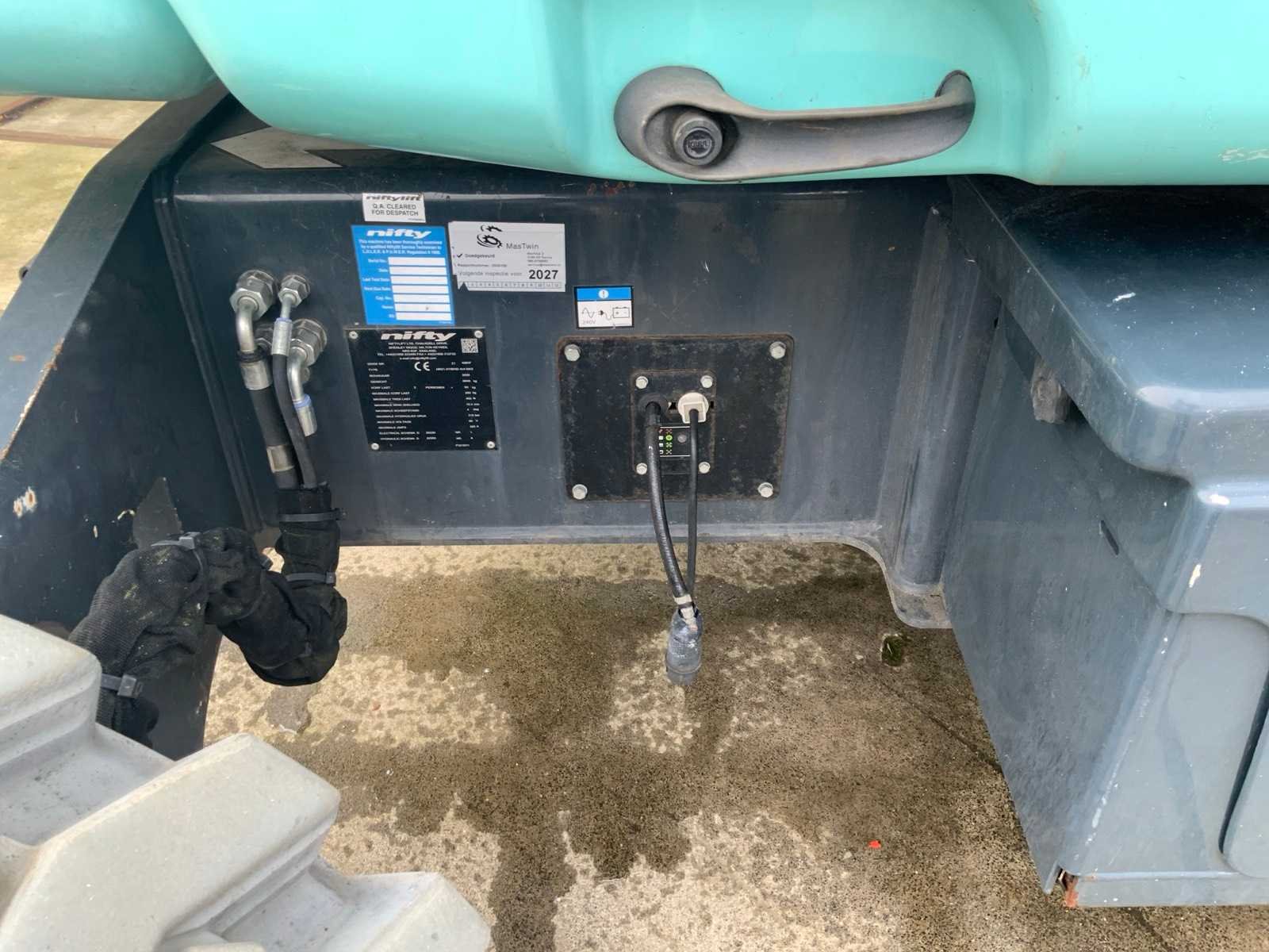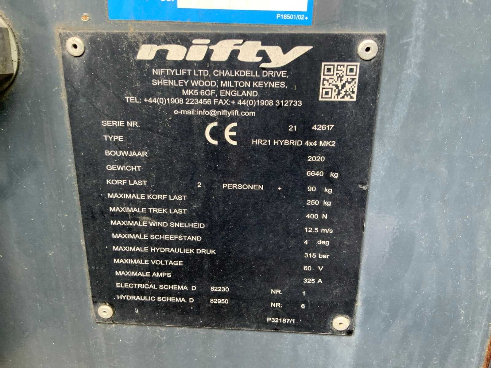 Voorzien van perslucht en stroomaansluiting tot aan de manbak, aansluiting: 230 volt, 50HZ Nee Merk: Nifty Type: HR21-Hybrid 4x4 MK2 Bouwjaar: 2020 Serienummer: 21 42617 Diesel: true Elektrisch: true Werkhoogte: 20800mm Horizontale rijkwijdte: 13000mm Plateau afm. l: 1800mm Plateau afm. b: 800mm Platform capaciteit: 250kg Accu lader: true Afgelezen urenstand: 398 Eigen gewicht: 6640kg Totale afmeting L: 5470mm Totale afmeting Breedte: 2270mm Totale afmeting Hoogte: 2150mm