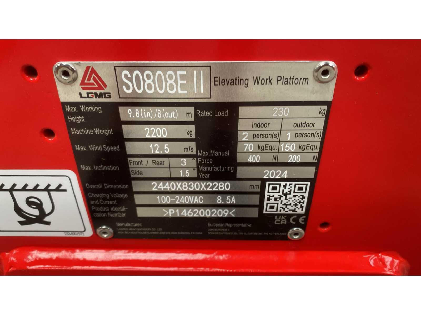 Nee Merk: LGMG Type: S0808E Bouwjaar: 2024 Serienummer: >P14200209< Elektrisch: true Werkhoogte: 10000mm Platform capaciteit: 230kg Afgelezen urenstand: 69 Eigen gewicht: 2200kg Totale afmeting L: 2440mm Totale afmeting Breedte: 830mm Totale afmeting Hoogte: 2280mm