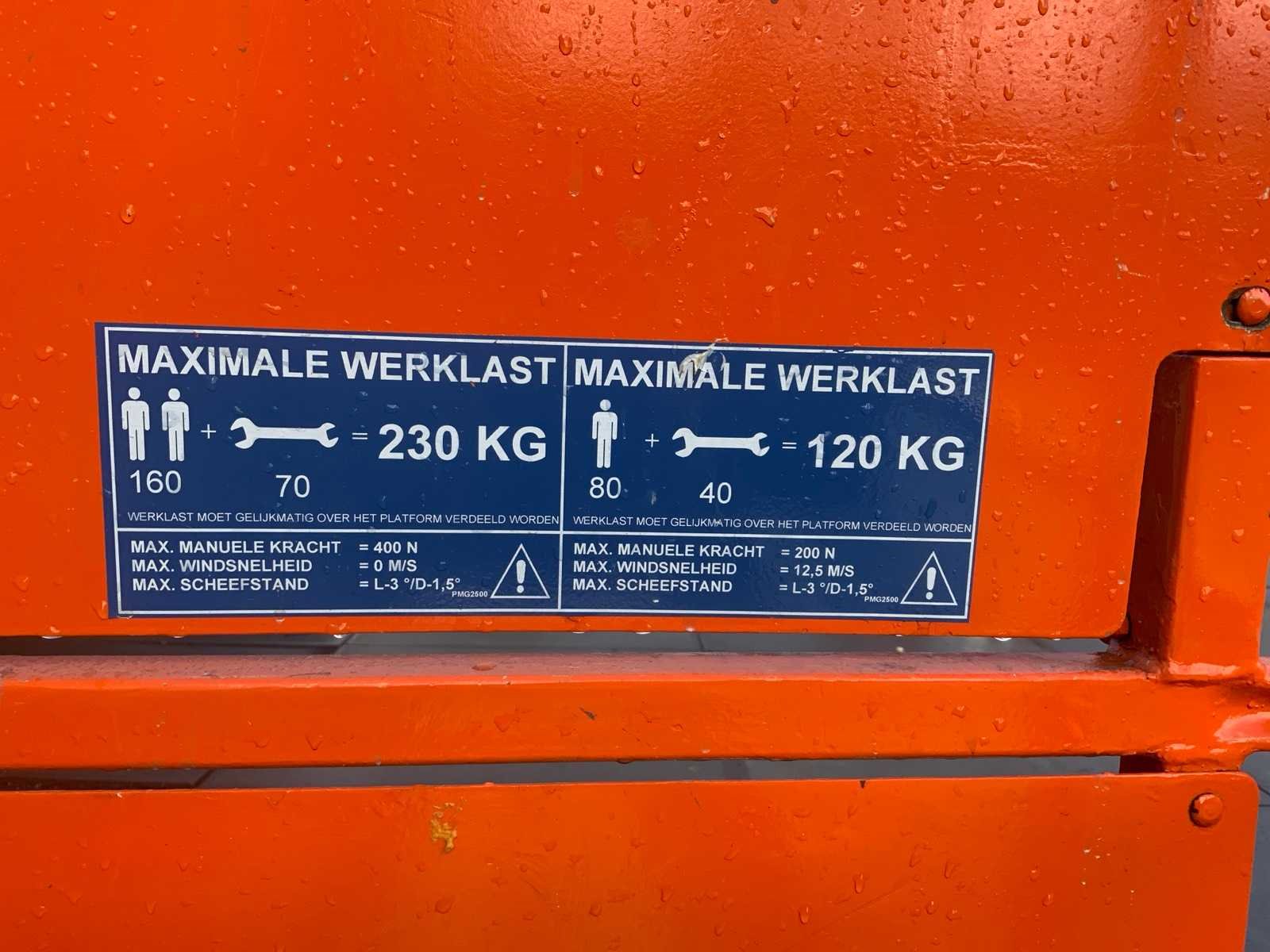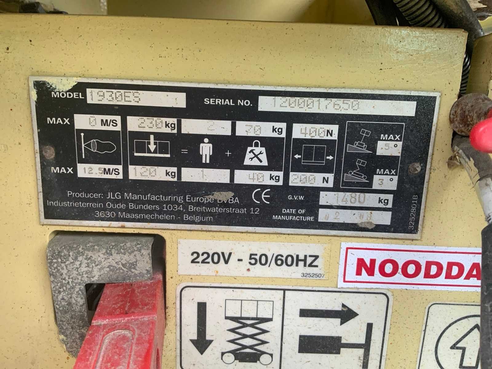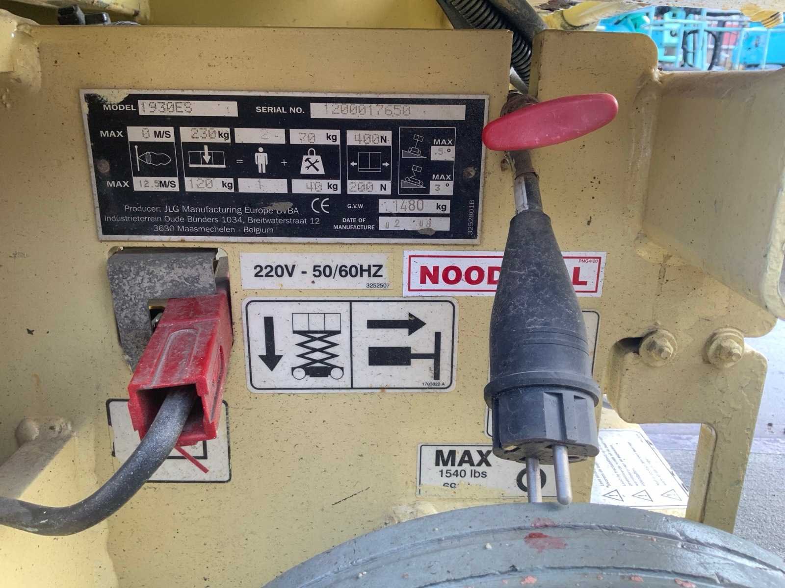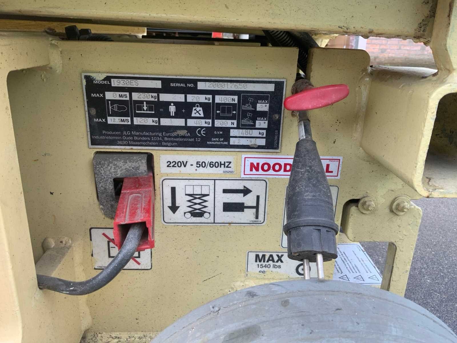 Plauteau uitschuifbaar tot: 2750mm, aansluiting: 230 volt, 50 HZ Nee Merk: JLG Type: 1930 ES Bouwjaar: 2009 Serienummer: 1200017650 Elektrisch: true Werkhoogte: 8000mm Plateau afm. l: 1800mm Plateau afm. b: 670mm Platform capaciteit: 230kg Afgelezen urenstand: 437 Eigen gewicht: 1480kg Totale afmeting L: 1900mm Totale afmeting Breedte: 770mm Totale afmeting Hoogte: 1990mm
