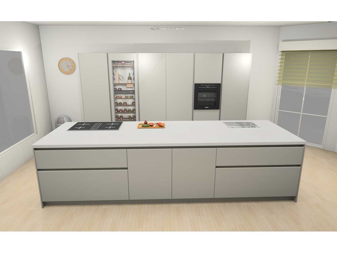 Miele KWT 6722 iS-1 EU1, wijnklimaatkast, 177cm. 259liter, Miele KMDA 7473 FR-U Silence RVS BNE, werkblad afzuiging, inductie, 4 kookzones, 80cm. Opbouwmodel Let op! Werkblad is van Kemie Venturo Gold glans, cosmostone, 4cm. Heeft naad in het midden. Let op! Keuken staat niet opgesteld, enkel 3D tekening en wordt geleverd ongebruikt in doos. Let op! Aanrecht blad is zwaar, tijdens afhaal dag zorgvuldig meenemen en neem extra man kracht mee! Nee Merk: Duitse Keuken Model: Kasjmier mat lak Type keukenopstelling: Eiland met hoge kasten Lengte: 375cm Breedte: 60cm Hoogte: 214cm Gootsteen: Reginox Houston RVS vlak inbouw Aanrechtblad: Kemie Venturo Gold glans, cosmostone, 4cm Koelkast: Miele K7715E, koeler 178cm, Softclose: true Oven: DGC 7250 OBSW BN, Stoomoven, 60cm Vaatwasser: Miele G 5651 SCVi Active, volledig geintegreerd Lengte kookeiland: 364cm Breedte kookeiland: 120cm Hoogte kookeiland: 93,5cm Plintkleur: Kasjmier mat Hoofdkleur: Kasjmier mat lak Style: Modern greeploos Kleur: Kasjmier mat lak