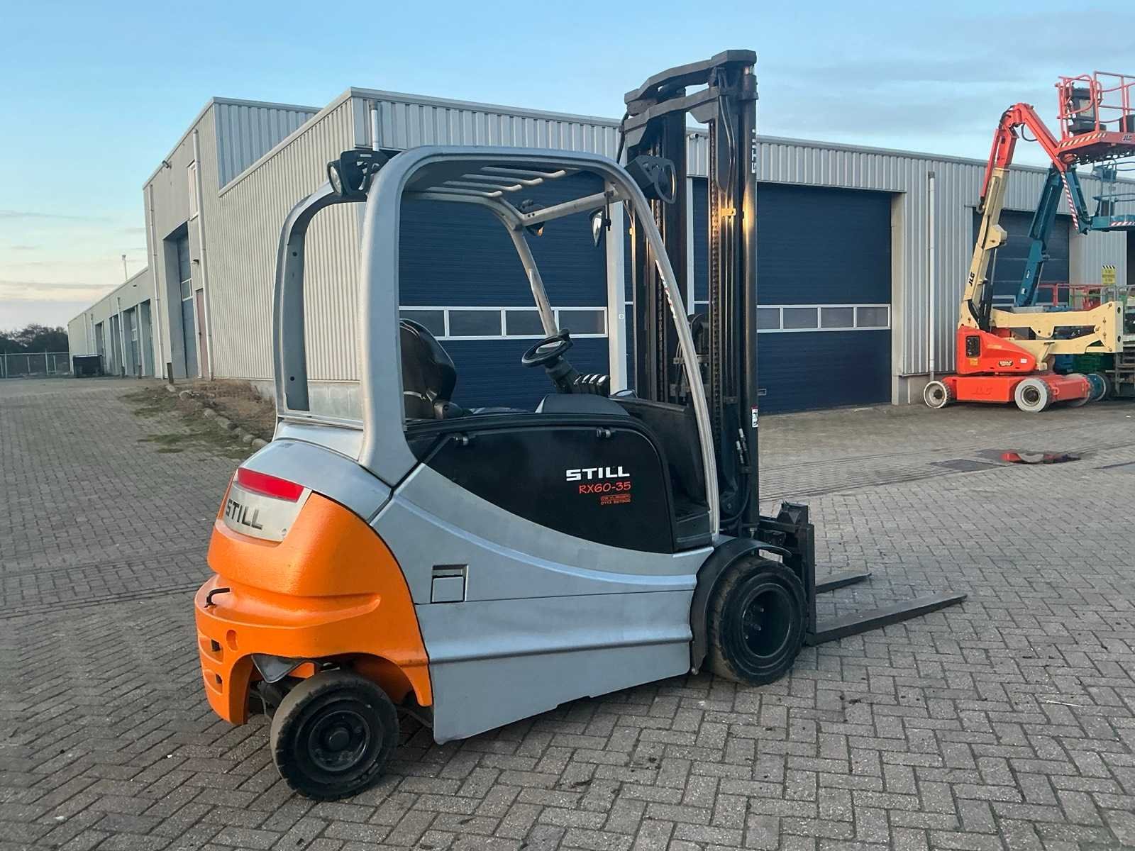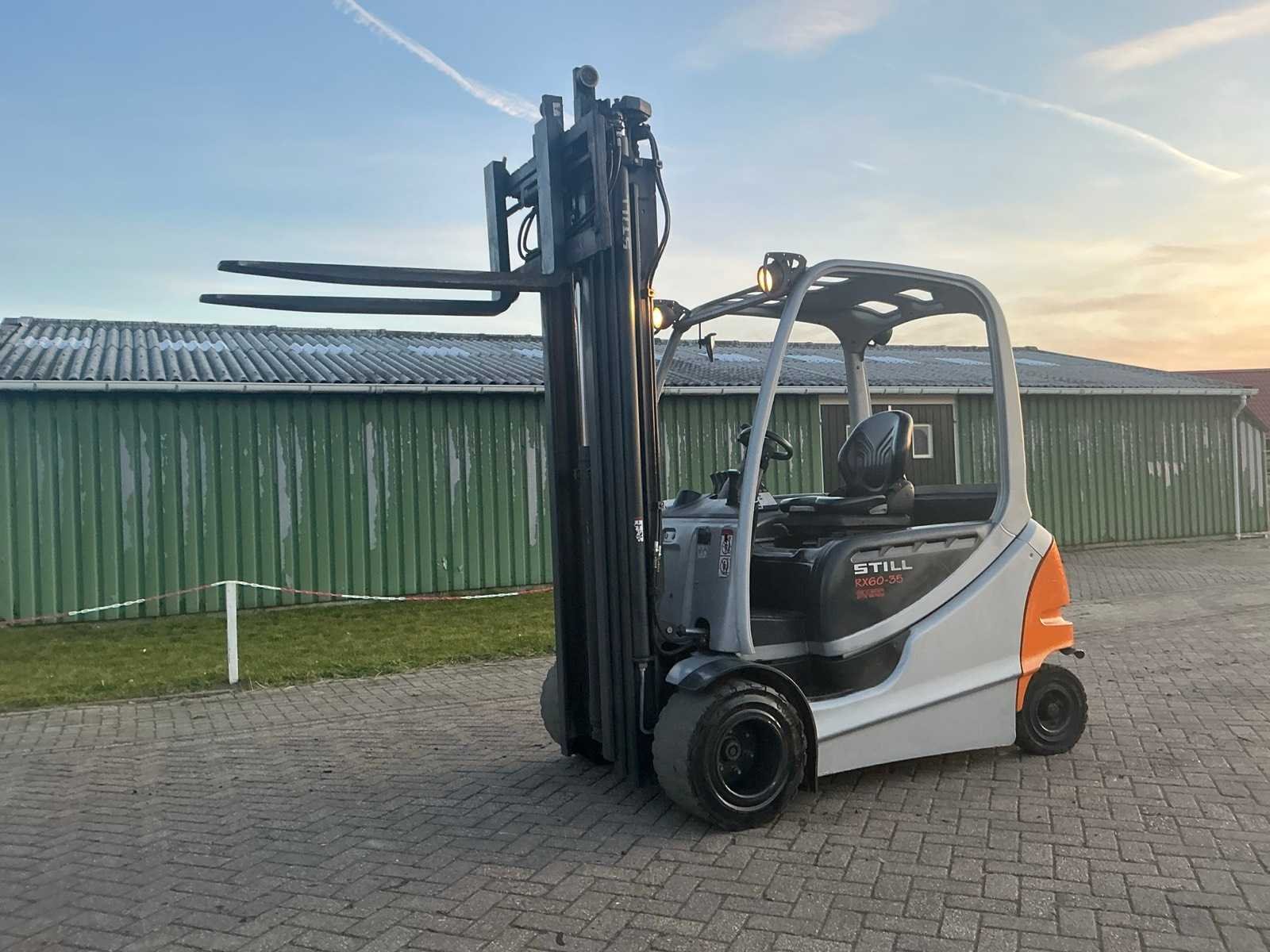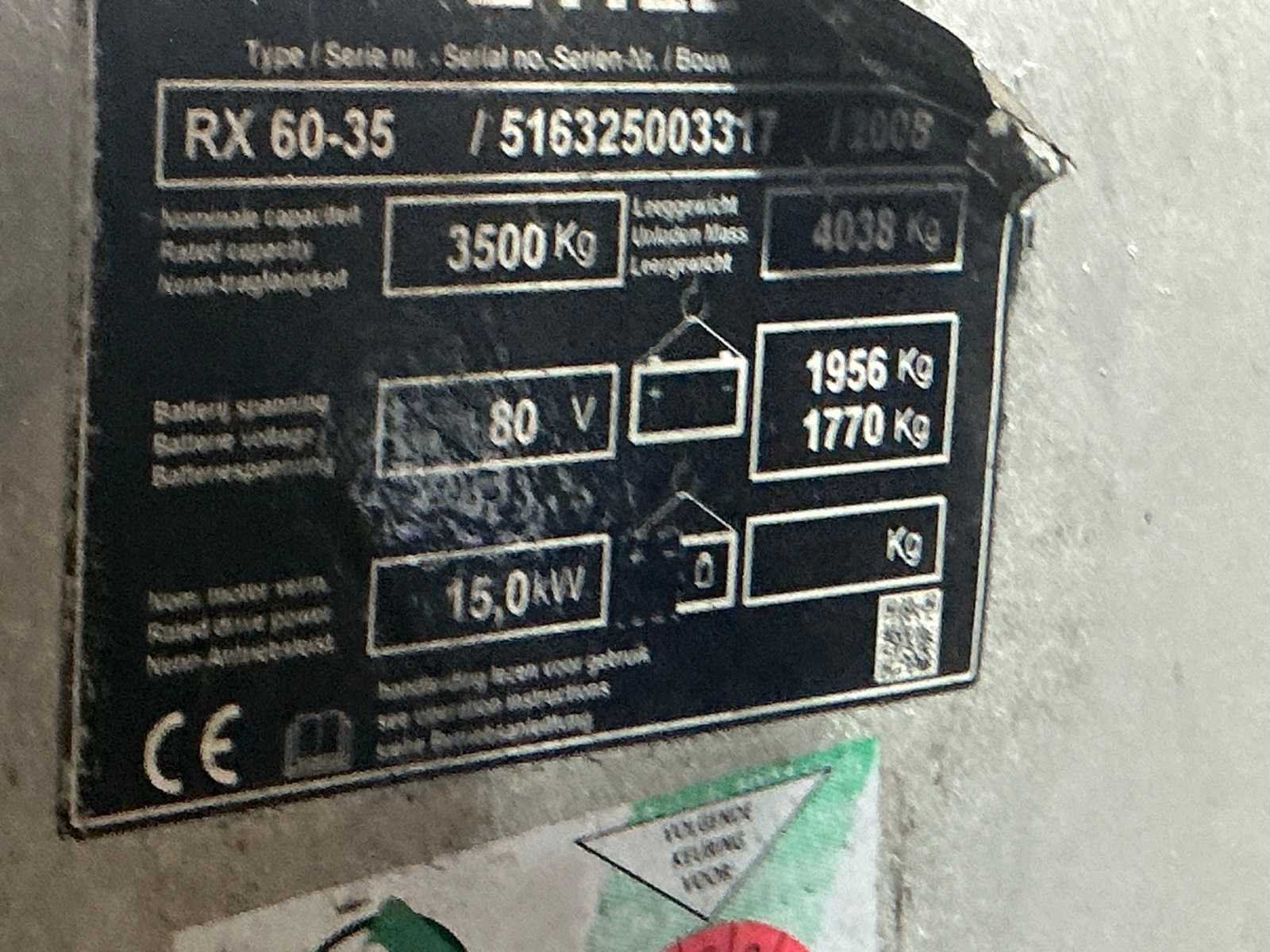 Nee Merk: Still Type: RX60-35 Bouwjaar: 2008 Serienummer: 516325003317 Brandstof: Elektrisch Mast: Triple Soort band: Volrubber banden Aantal wielen: 4 Afgelezen urenstand: 8465 Free-lift: true Side-shift: true Triple mast: true Eigen gewicht: 6000kg Hefvermogen: 3500kg Lepellengte: 1200mm Hefhoogte: 6000mm Vol rubber banden: true Totale afmeting L: 2650mm Totale afmeting Breedte: 1400mm Totale afmeting Hoogte: 2700mm
