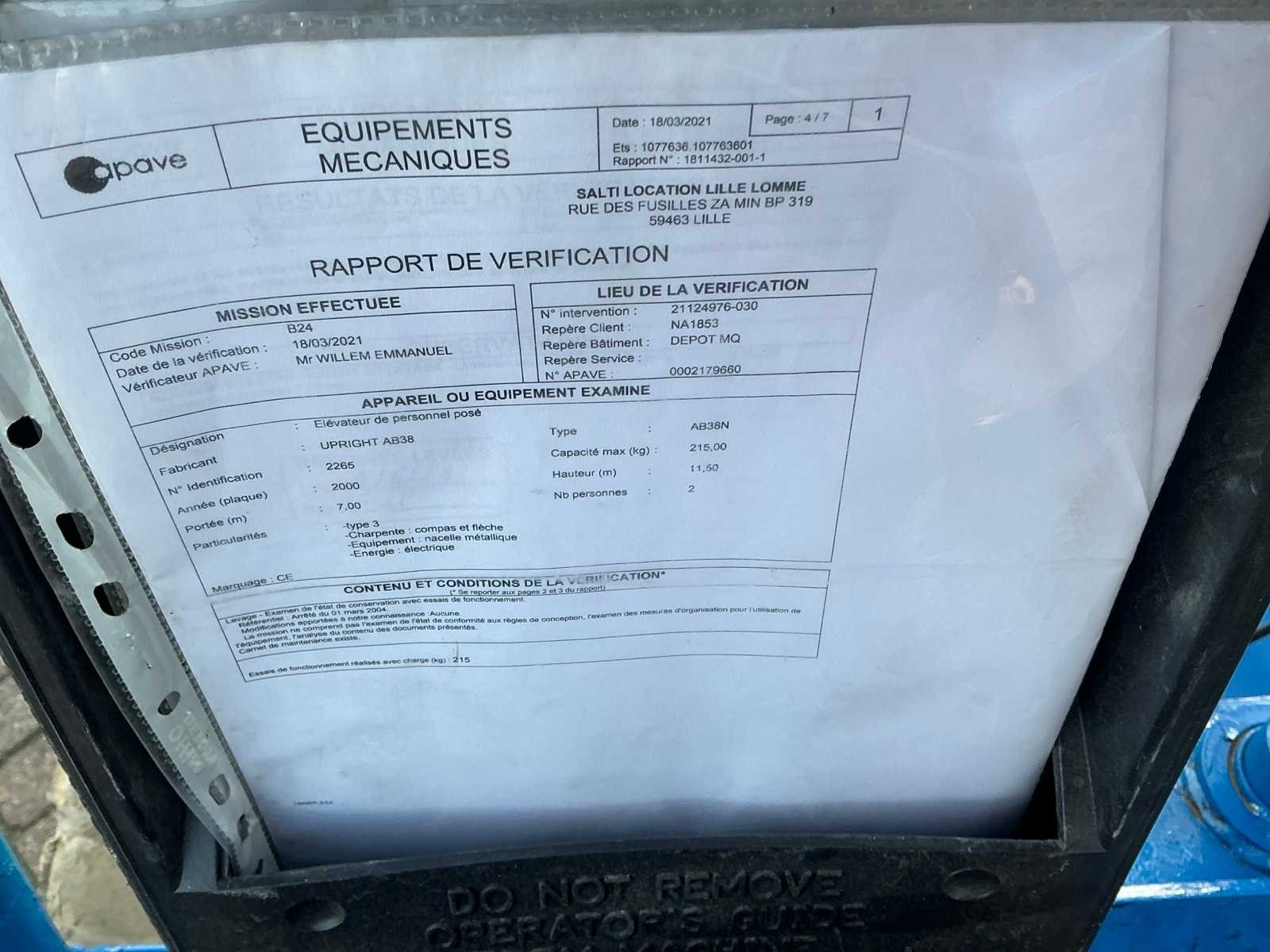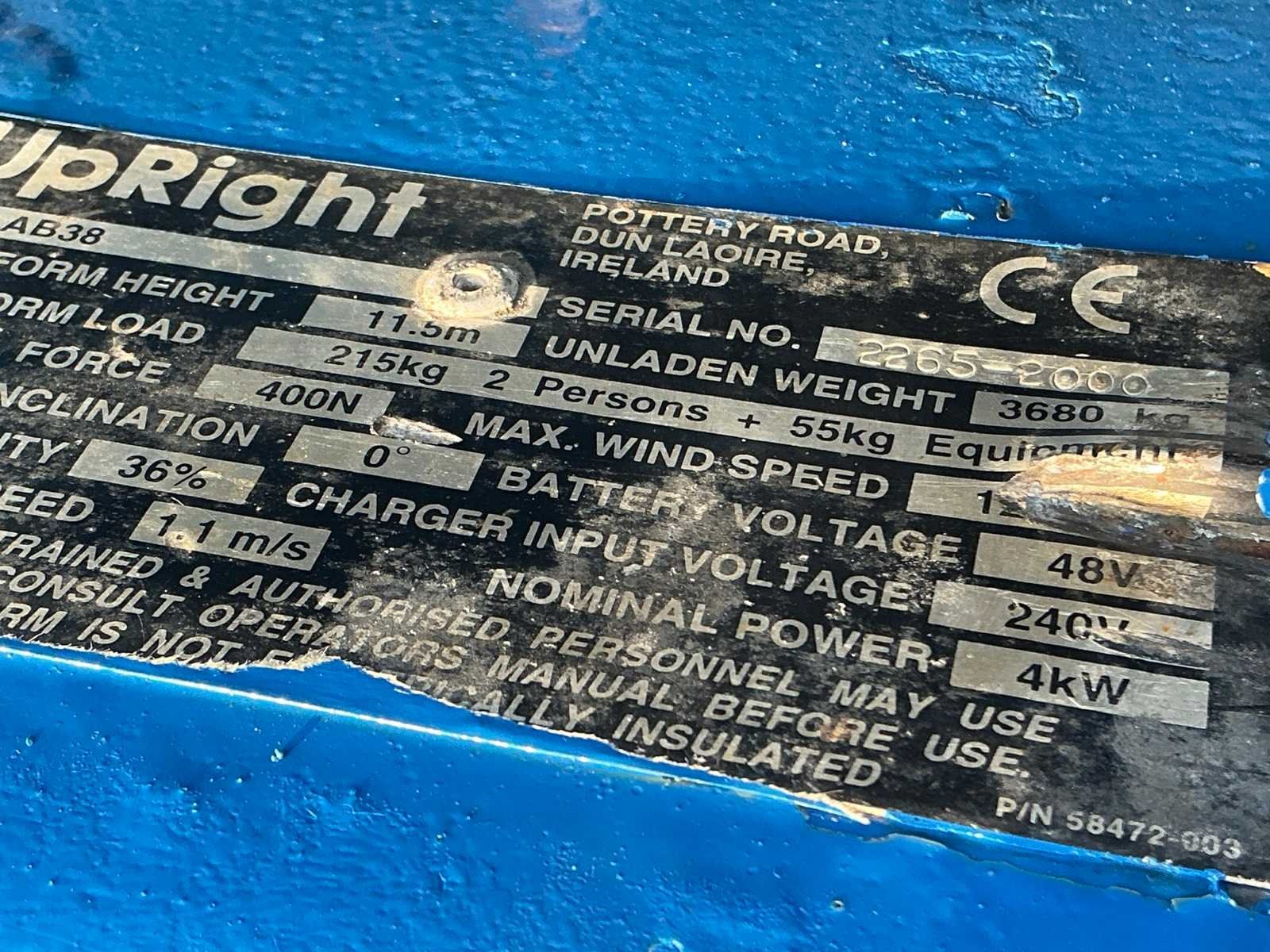 Nee Merk: Upright Type: AB38N Serienummer: 2265-2000 Elektrisch: true Motorvermogen (kW): 4kW Telescoop hoogwerker: true Knikarm hoogwerker: true Werkhoogte: 13500mm Horizontale rijkwijdte: 6100mm Plateau afm. l: 1200mm Plateau afm. b: 600mm Platform capaciteit: 215kg Accu lader: true Eigen gewicht: 3680kg Totale afmeting L: 4100mm Totale afmeting Breedte: 1600mm Totale afmeting Hoogte: 2150mm