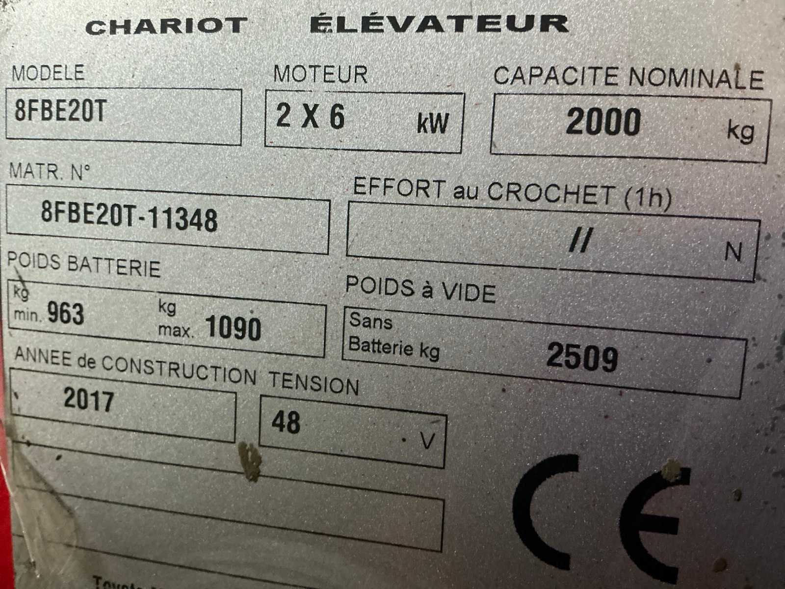 Nee Merk: Toyota Type: 8FBE20T Bouwjaar: 2017 Serienummer: 11348 Brandstof: Elektrisch Mast: Triple Soort band: Volrubber banden Aantal wielen: 3 Accu lader: true Free-lift: true Side-shift: true Triple mast: true Eigen gewicht: 3599kg Hefvermogen: 2000kg Lepellengte: 1150mm Hefhoogte: 4300mm Vol rubber banden: true Totale afmeting L: 2000mm Totale afmeting Breedte: 1150mm Totale afmeting Hoogte: 2050mm
