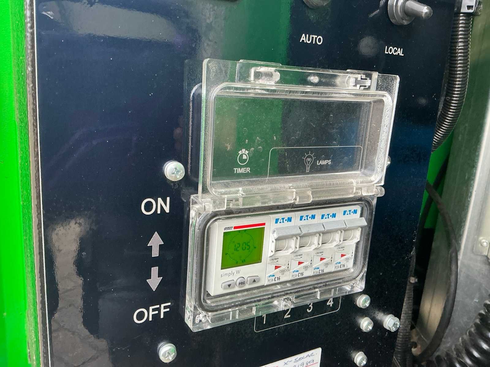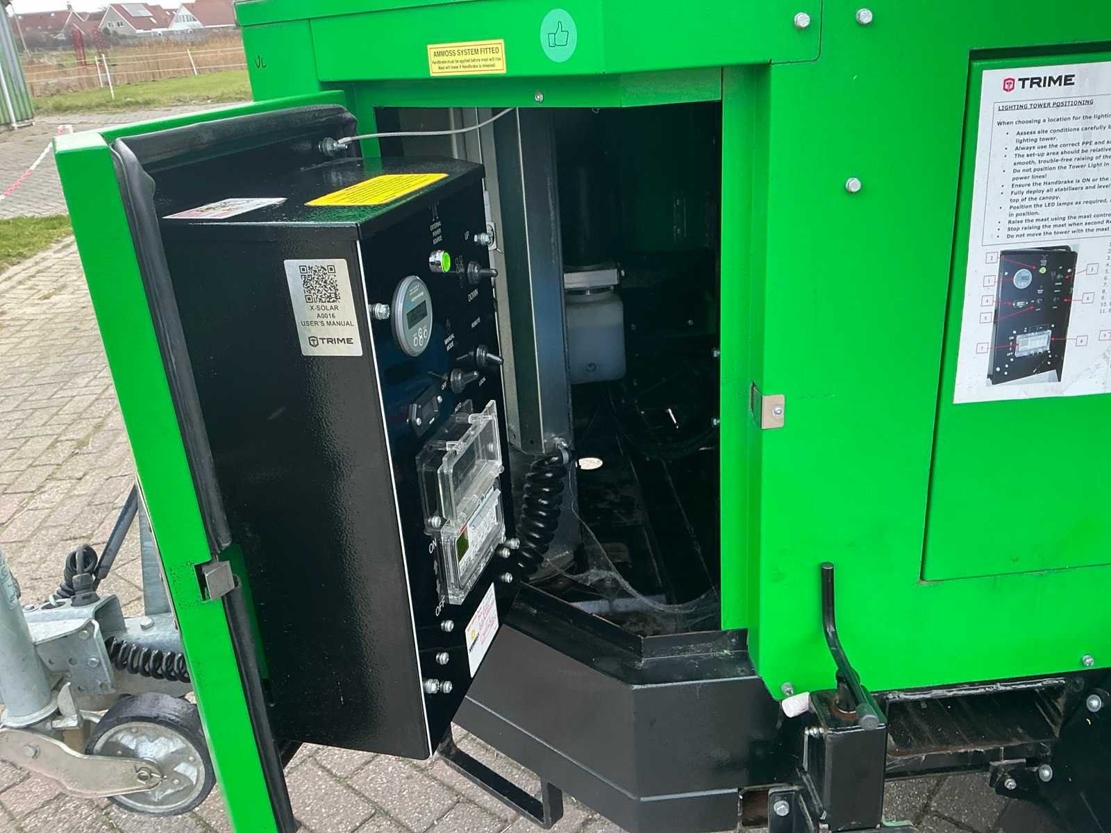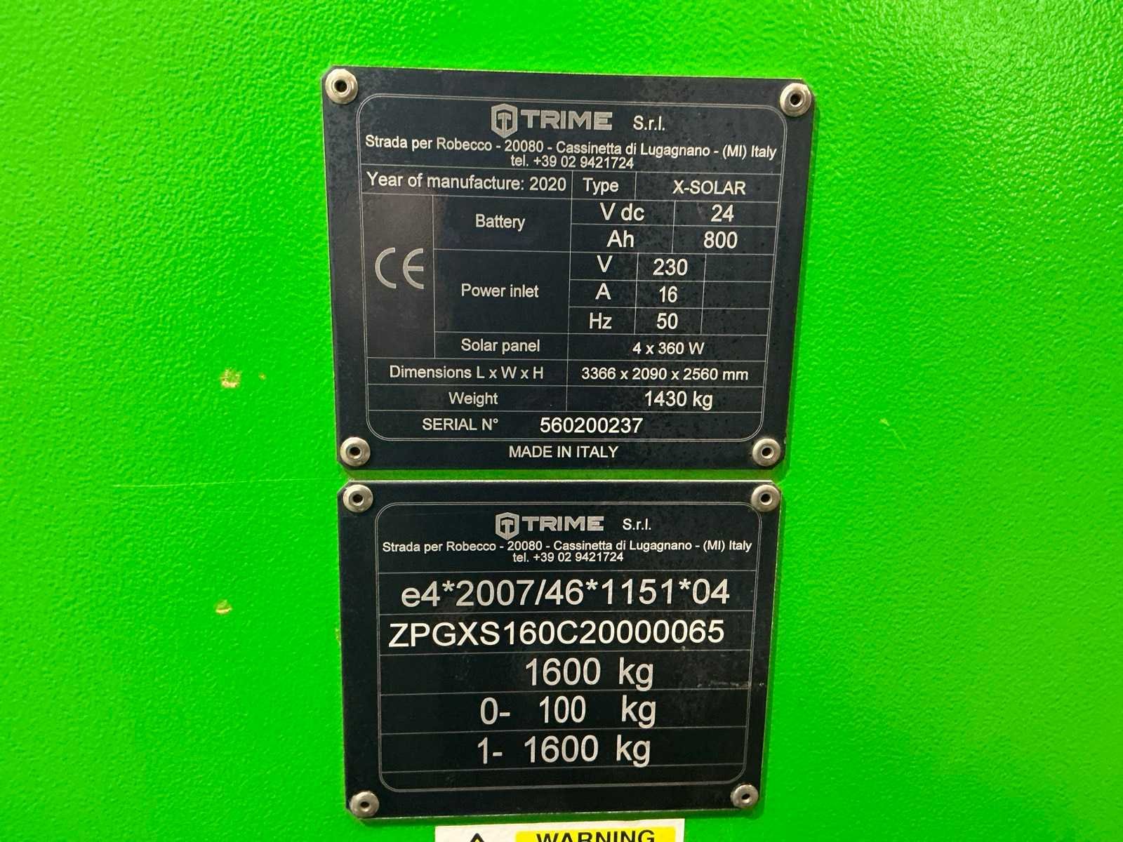 Solarpanelen laden batterijen op Nee Merk: TRIME Type: X-SOLAR Bouwjaar: 2020 Serienummer: 560200237 LED: true Statief: true Aansluiting: 230V Eigen gewicht: 1430kg Totale afmeting L: 3366mm Totale afmeting Breedte: 2090mm Totale afmeting Hoogte: 2560mm