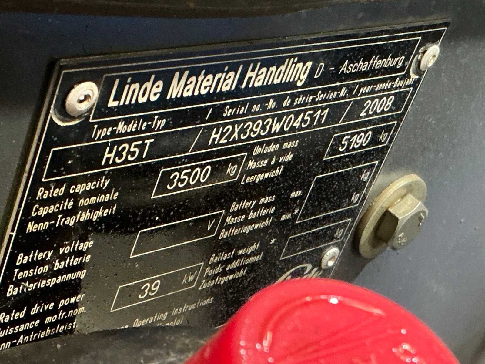 Ter reparatie, joystick ontbreekt Nee Merk: Linde Type: H35T Bouwjaar: 2008 Serienummer: H2X393W04511 Brandstof: LPG Mast: Duplex Soort band: Volrubber banden Aantal wielen: 4 Duplex mast: true Eigen gewicht: 5190kg Hefvermogen: 3500kg Lepellengte: 1050mm Hefhoogte: 6000mm Vol rubber banden: true Totale afmeting L: 2750mm Totale afmeting Breedte: 1350mm Totale afmeting Hoogte: 3350mm