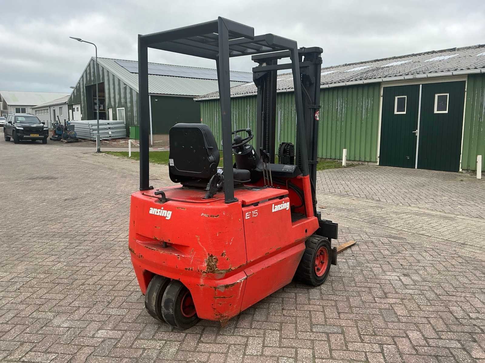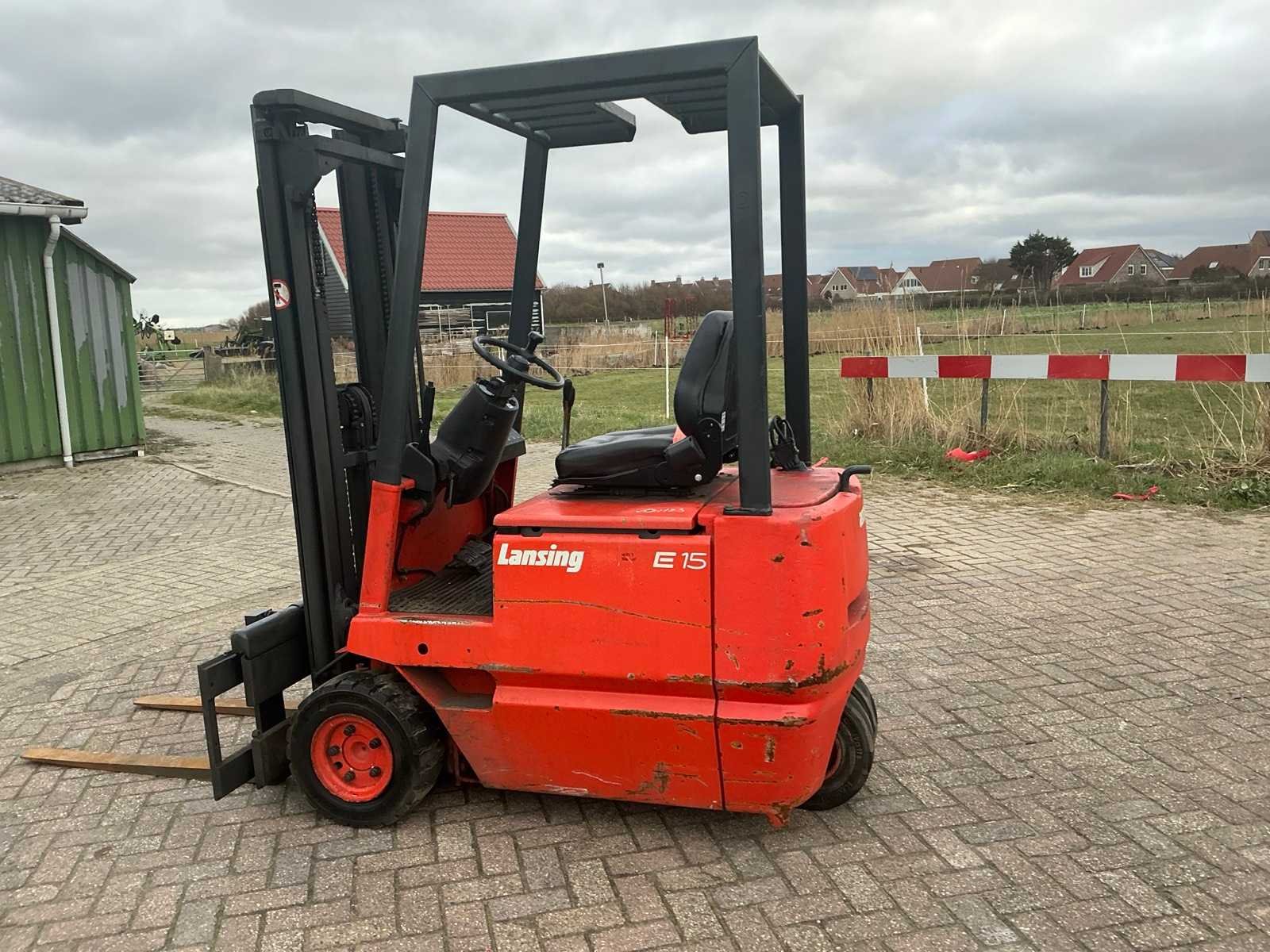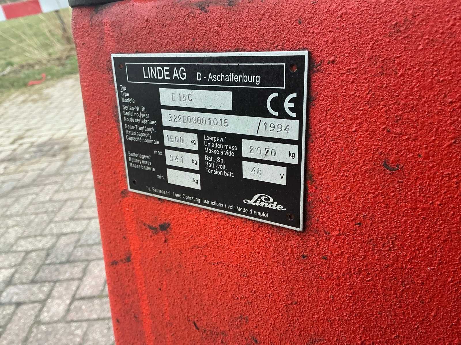 Rijd niet Nee Merk: Linde Type: E15C Serienummer: 322E08001015 Brandstof: Elektrisch Mast: Triple Soort band: Volrubber banden Aantal wielen: 3 Afgelezen urenstand: 7119 Free-lift: true Side-shift: true Triple mast: true Eigen gewicht: 3021kg Hefvermogen: 1500kg Lepellengte: 1000mm Hefhoogte: 4675mm Vol rubber banden: true Minimale doorrijhoogte: 1850mm Totale afmeting L: 1850mm Totale afmeting Breedte: 1050mm