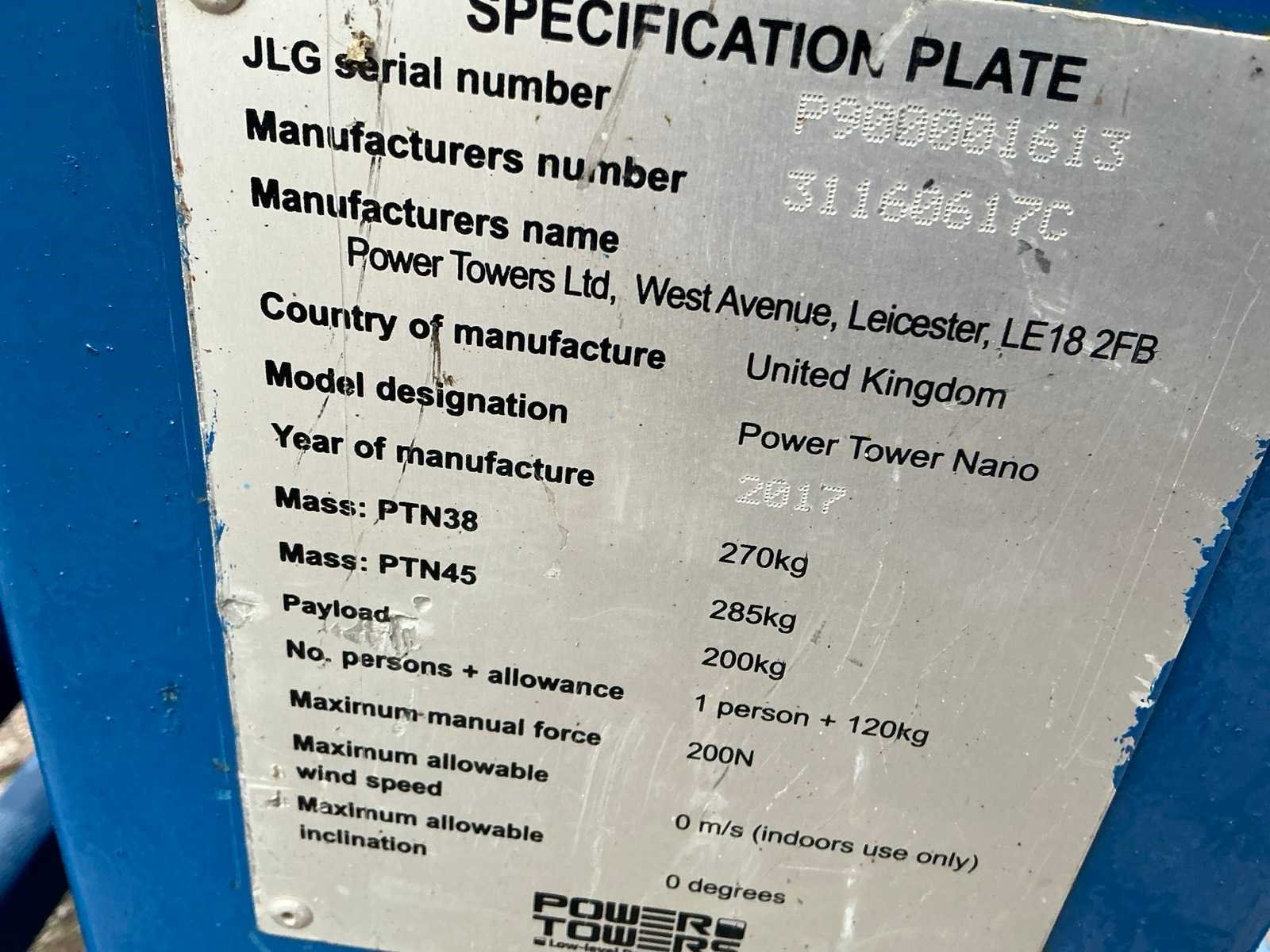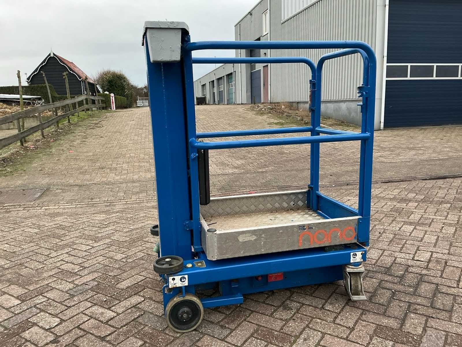 Nee Merk: JLG Type: Nano Bouwjaar: 2017 Serienummer: P900001613 Elektrisch: true Telescoop hoogwerker: true Werkhoogte: 4500mm Plateau afm. l: 1000mm Plateau afm. b: 730mm Platform capaciteit: 200kg Eigen gewicht: 285kg Totale afmeting L: 1250mm Totale afmeting Breedte: 750mm Totale afmeting Hoogte: 1580mm
