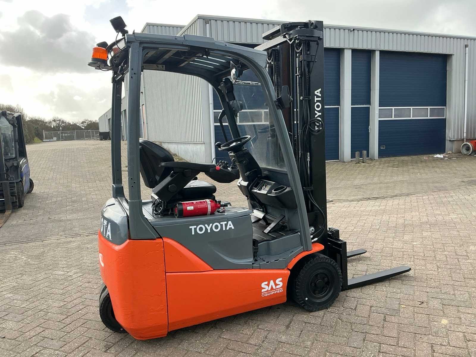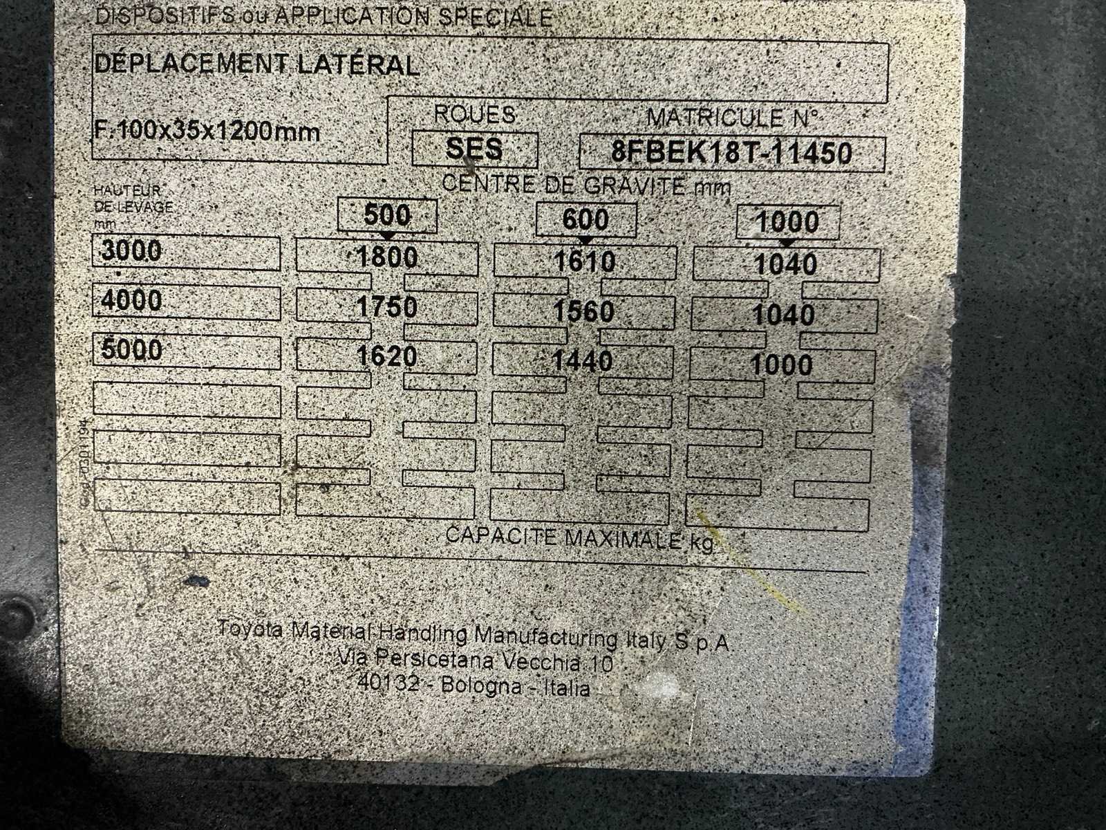 Geen accu Nee Merk: Toyota Type: 8FBEK18T Bouwjaar: 2018 Serienummer: 11450 Brandstof: Elektrisch Mast: Triple Soort band: Volrubber banden Aantal wielen: 3 Free-lift: true Side-shift: true Triple mast: true Eigen gewicht: 2692kg Hefvermogen: 1800kg Lepellengte: 800mm Hefhoogte: 5000mm Vol rubber banden: true Totale afmeting L: 1950mm Totale afmeting Breedte: 1050mm Totale afmeting Hoogte: 2250mm