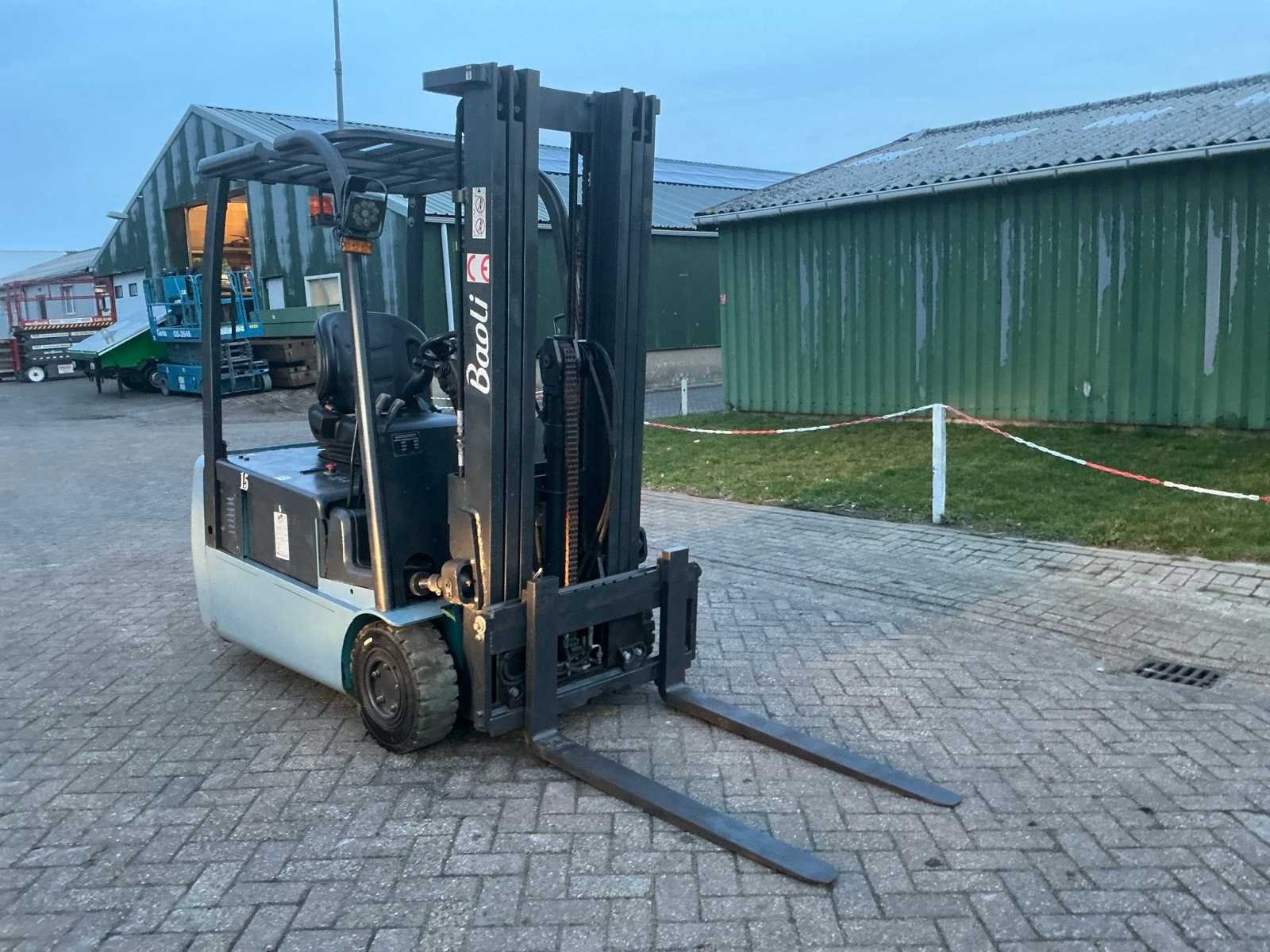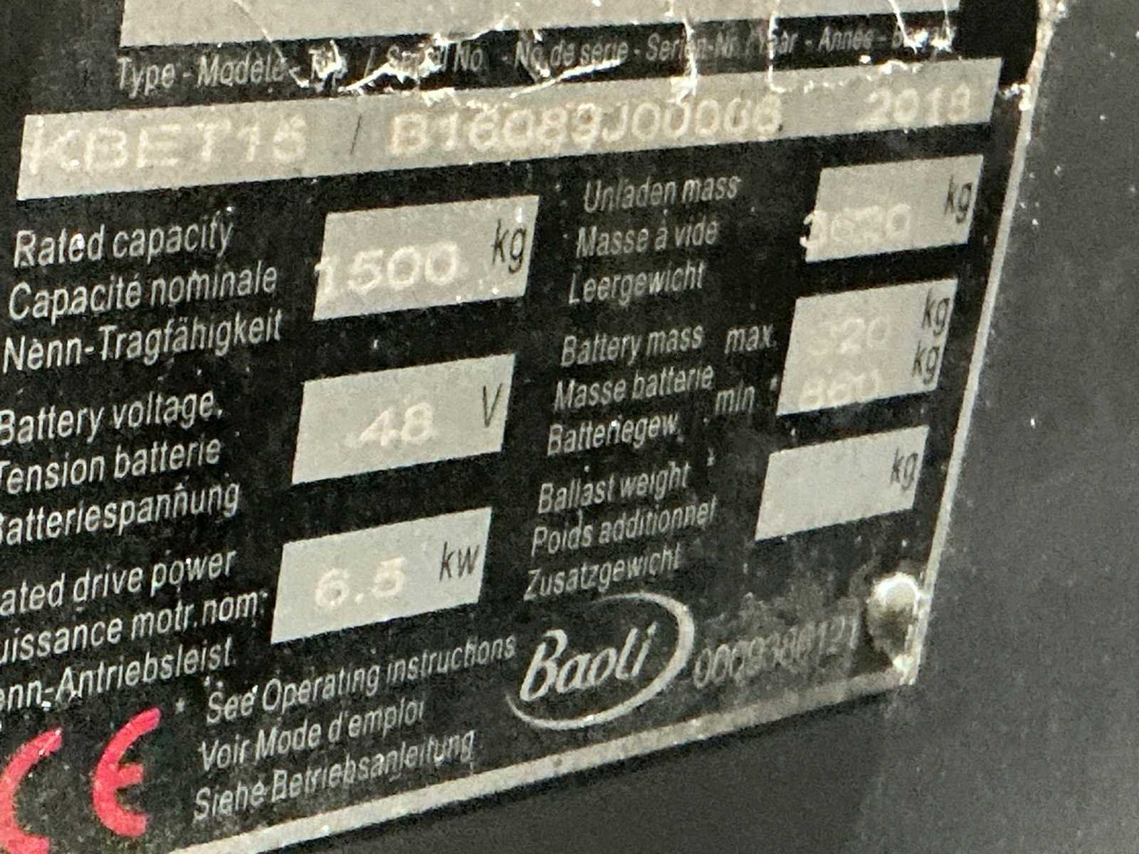Geen sleutel Nee Merk: Baoli Type: KBET15w Bouwjaar: 2018 Serienummer: B16089J00066 Brandstof: Elektrisch Mast: Triple Soort band: Volrubber banden Aantal wielen: 3 Free-lift: true Side-shift: true Triple mast: true Eigen gewicht: 3620kg Hefvermogen: 1500kg Lepellengte: 1200mm Hefhoogte: 4600mm Vol rubber banden: true Totale afmeting L: 2200mm Totale afmeting Breedte: 1200mm Totale afmeting Hoogte: 2200mm