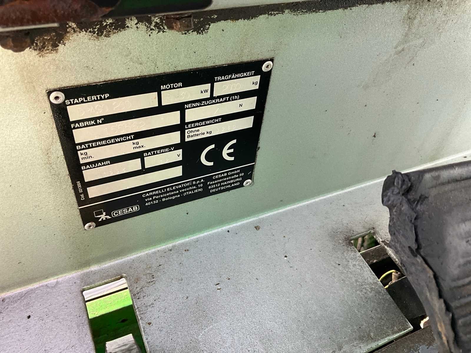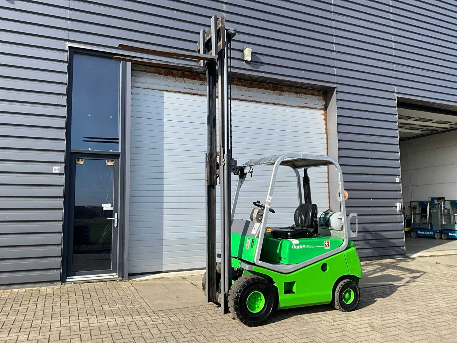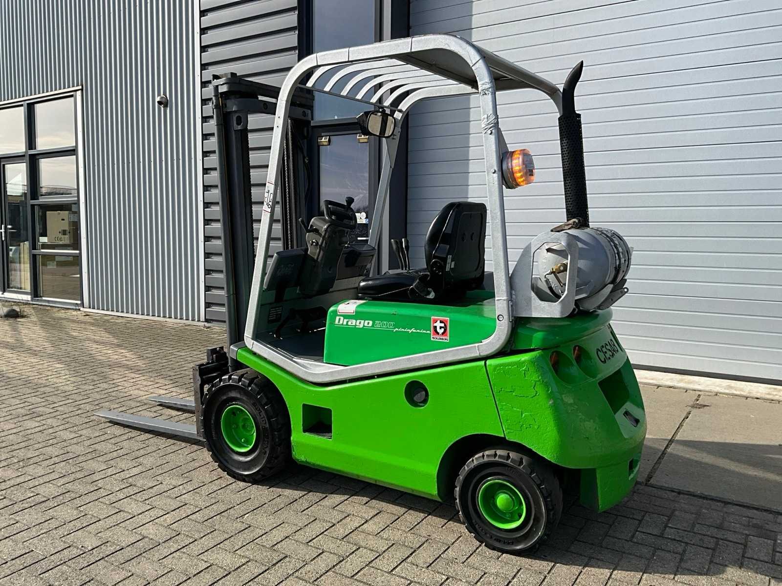 Gaat niet in achteruit Nee Merk: Cesab Type: Drago 200 Serienummer: 155562 Brandstof: LPG Mast: Duplex Soort band: Volrubber banden Aantal wielen: 4 Side-shift: true Duplex mast: true Eigen gewicht: 3280kg Hefvermogen: 2000kg Lepellengte: 1150mm Hefhoogte: 3200mm Minimale doorrijhoogte: 2120mm Totale afmeting L: 2300mm Totale afmeting Breedte: 1170mm LPG: true