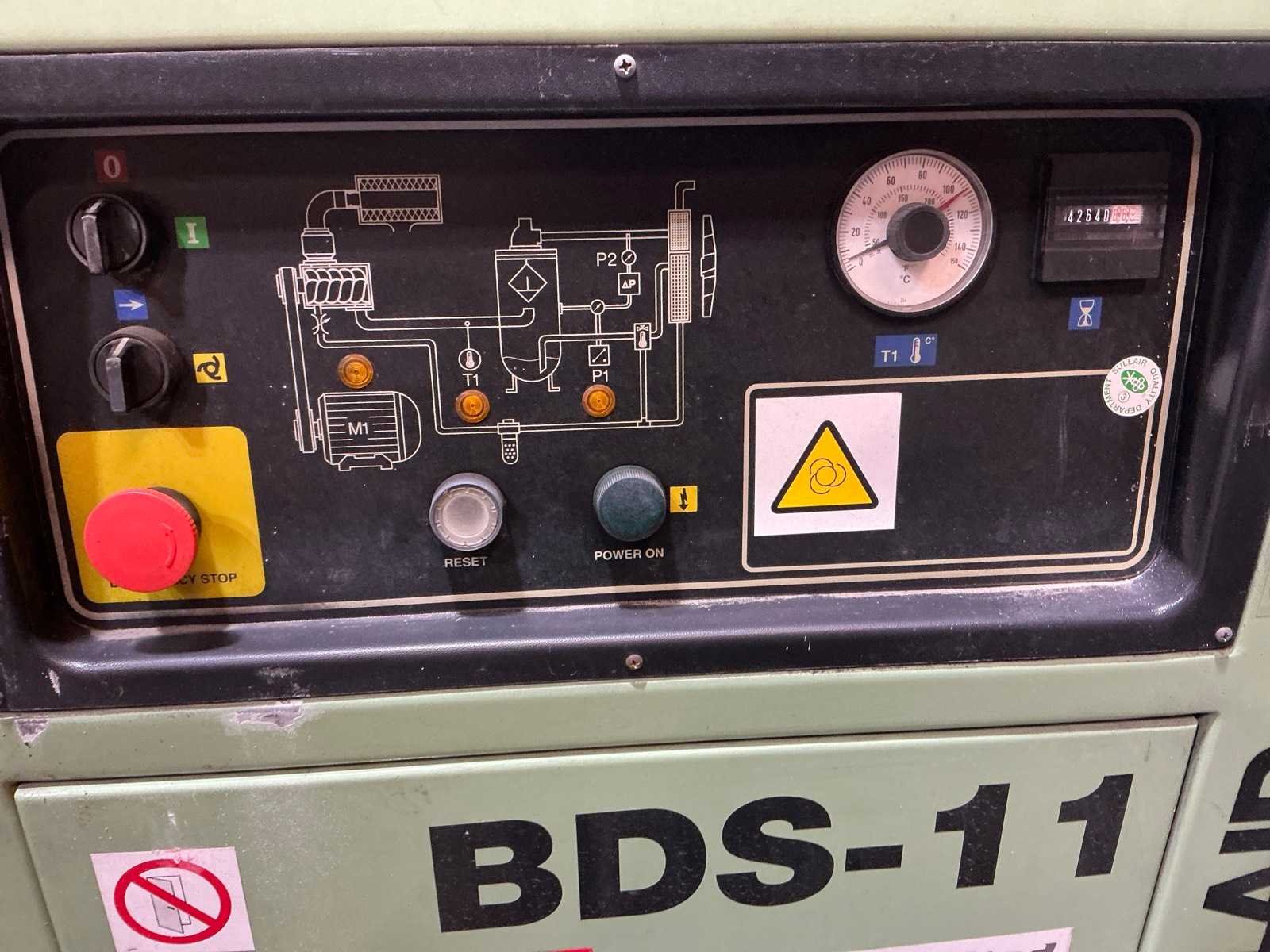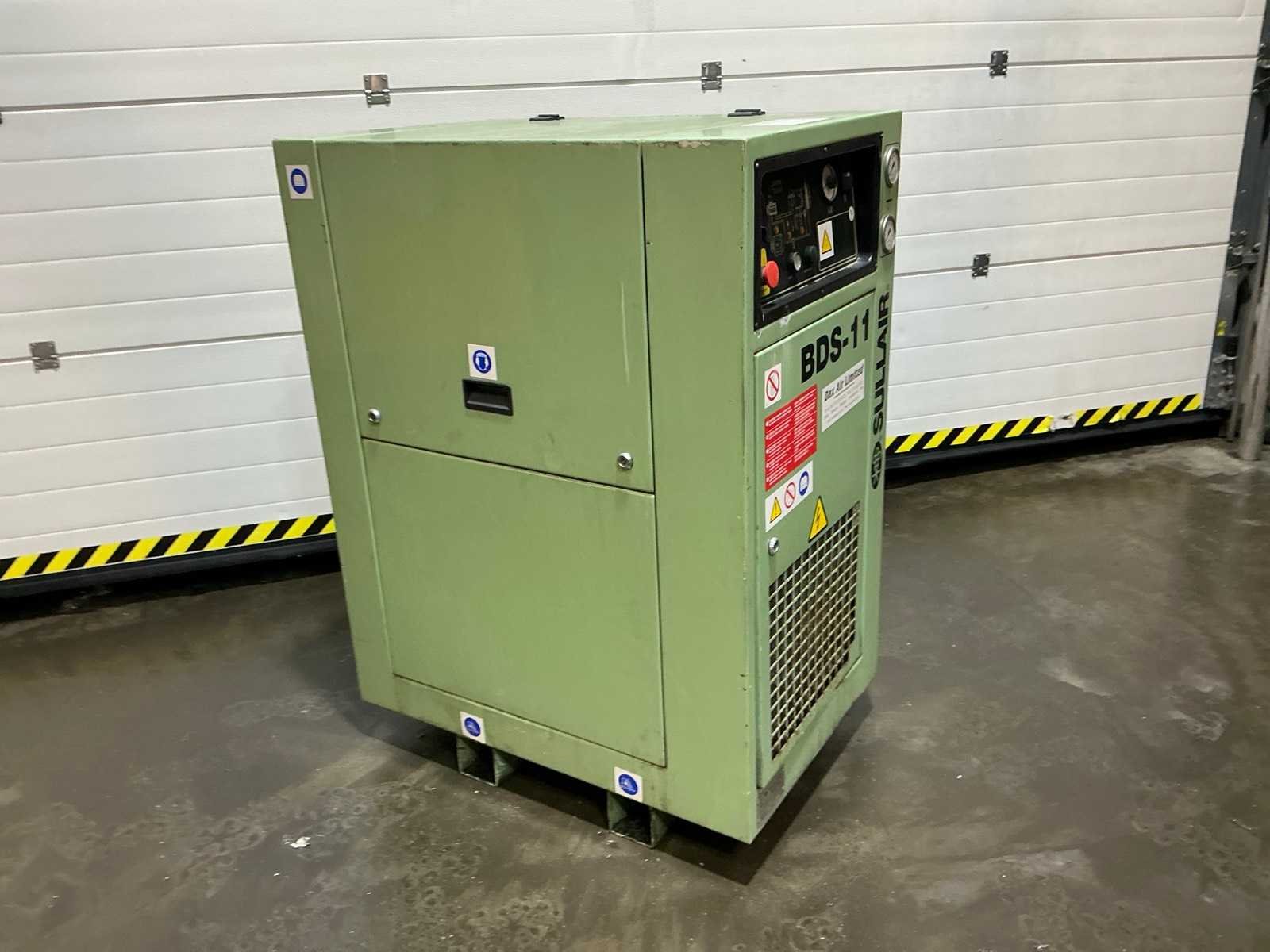 Nee Merk: SULLAIR Type: BDS-11 Serienummer: 68570004 Luchtstroom: 1400l/min Vermogen: 11kW Aansluiting: 400V Eigen gewicht: 334kg Totale afmeting L: 650mm Totale afmeting Breedte: 980mm Totale afmeting Hoogte: 1300mm