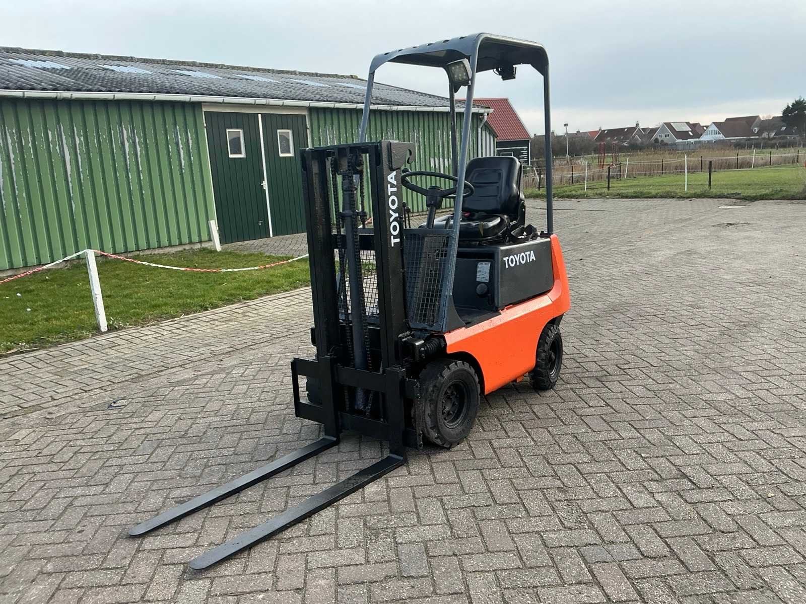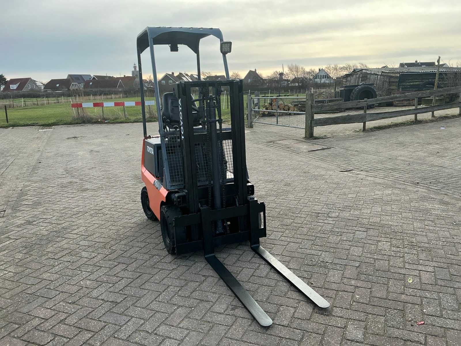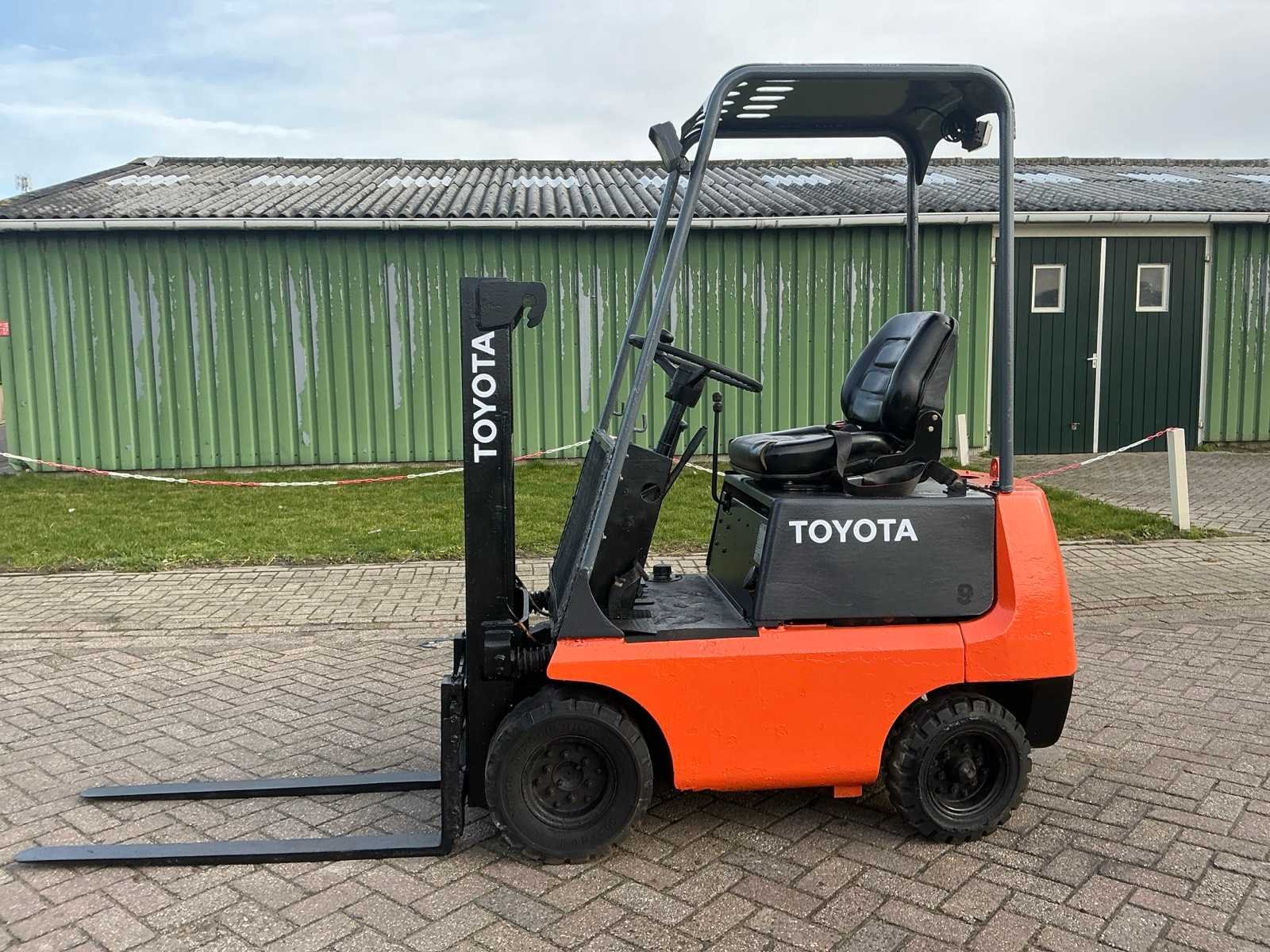 Geen sleutel, niet getest Nee Merk: Toyota Type: FG 9 Serienummer: 11520 Mast: Duplex Soort band: Volrubber banden Aantal wielen: 4 Duplex mast: true Eigen gewicht: 900kg Hefvermogen: 900kg Lepellengte: 1050mm Hefhoogte: 2050mm Vol rubber banden: true Totale afmeting L: 1750mm Totale afmeting Breedte: 850mm Totale afmeting Hoogte: 2000mm