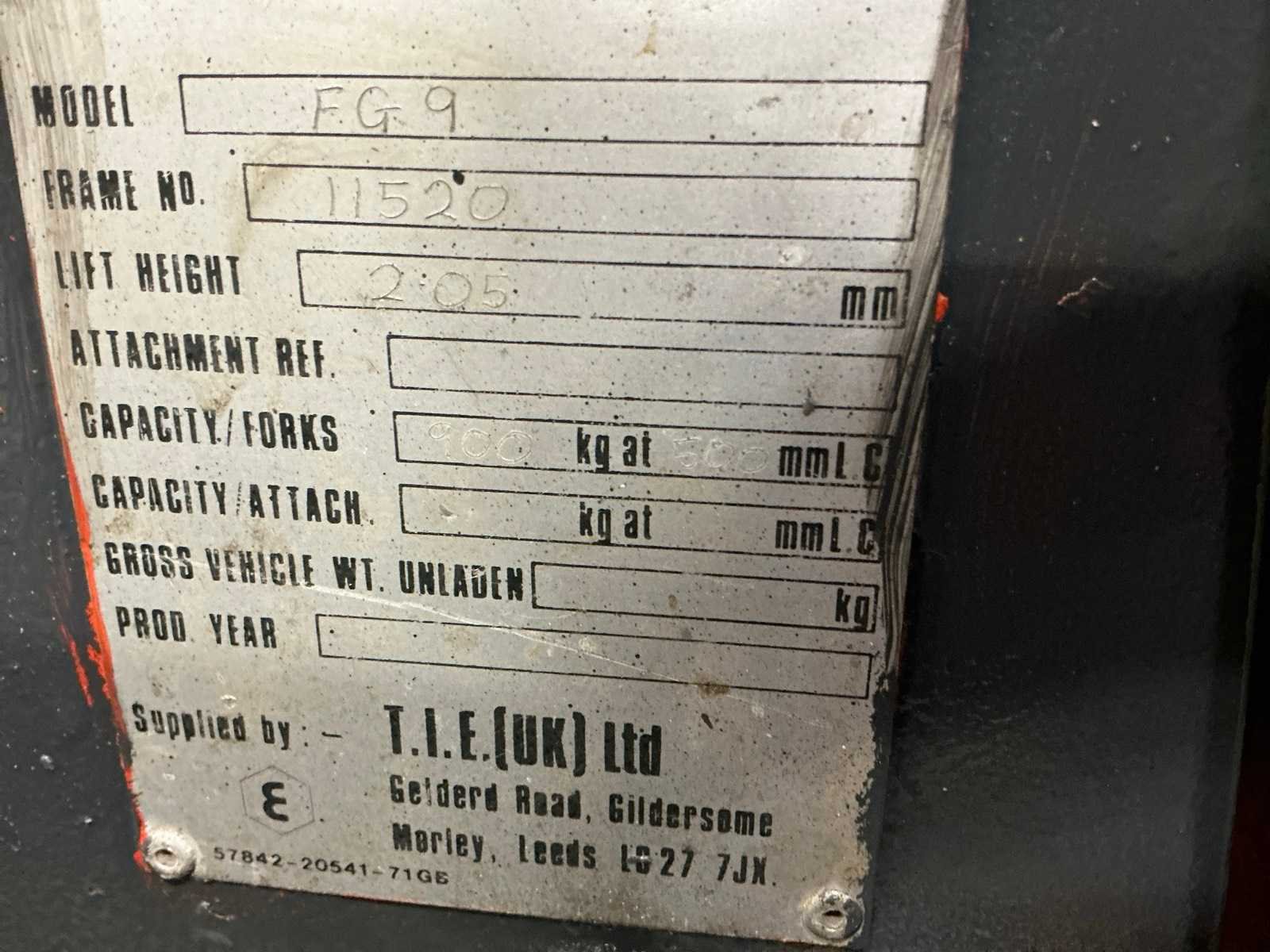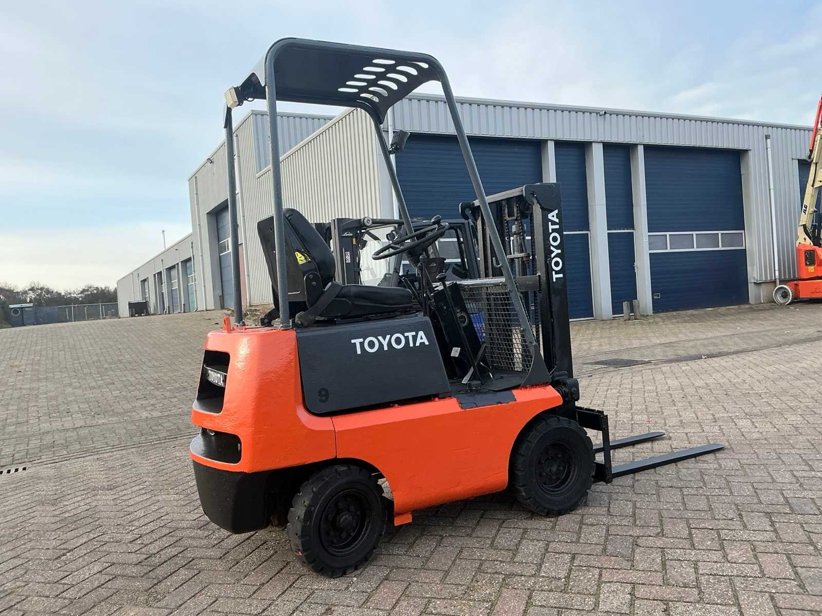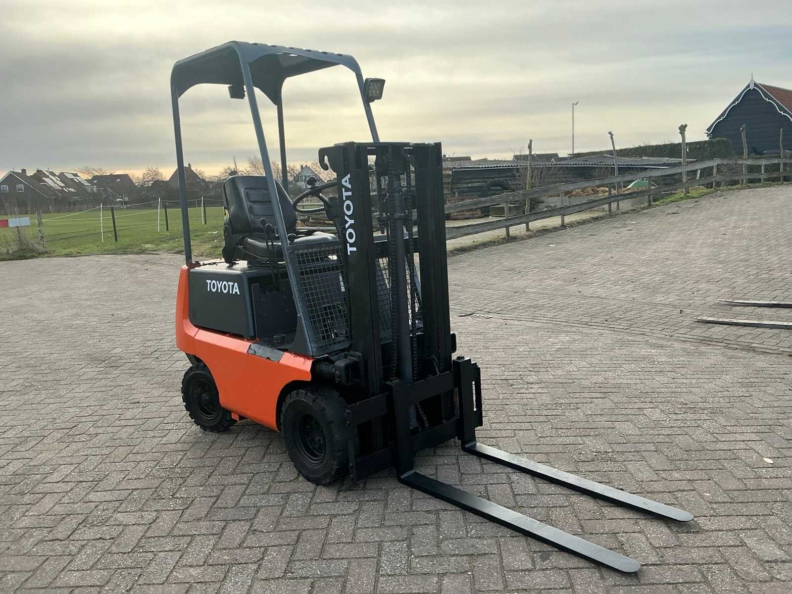 Geen sleutel, niet getest Nee Merk: Toyota Type: FG 9 Serienummer: 11520 Mast: Duplex Soort band: Volrubber banden Aantal wielen: 4 Duplex mast: true Eigen gewicht: 900kg Hefvermogen: 900kg Lepellengte: 1050mm Hefhoogte: 2050mm Vol rubber banden: true Totale afmeting L: 1750mm Totale afmeting Breedte: 850mm Totale afmeting Hoogte: 2000mm