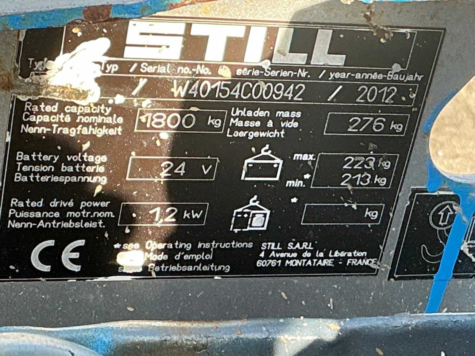 Nee Merk: Still Type: EXU18 Bouwjaar: 2012 Serienummer: W40154C00942 Hefvermogen: 1800kg Lepellengte: 1150mm Eigen gewicht: 498kg Totale afmeting L: 1700mm Totale afmeting Breedte: 720mm Totale afmeting Hoogte: 900mm