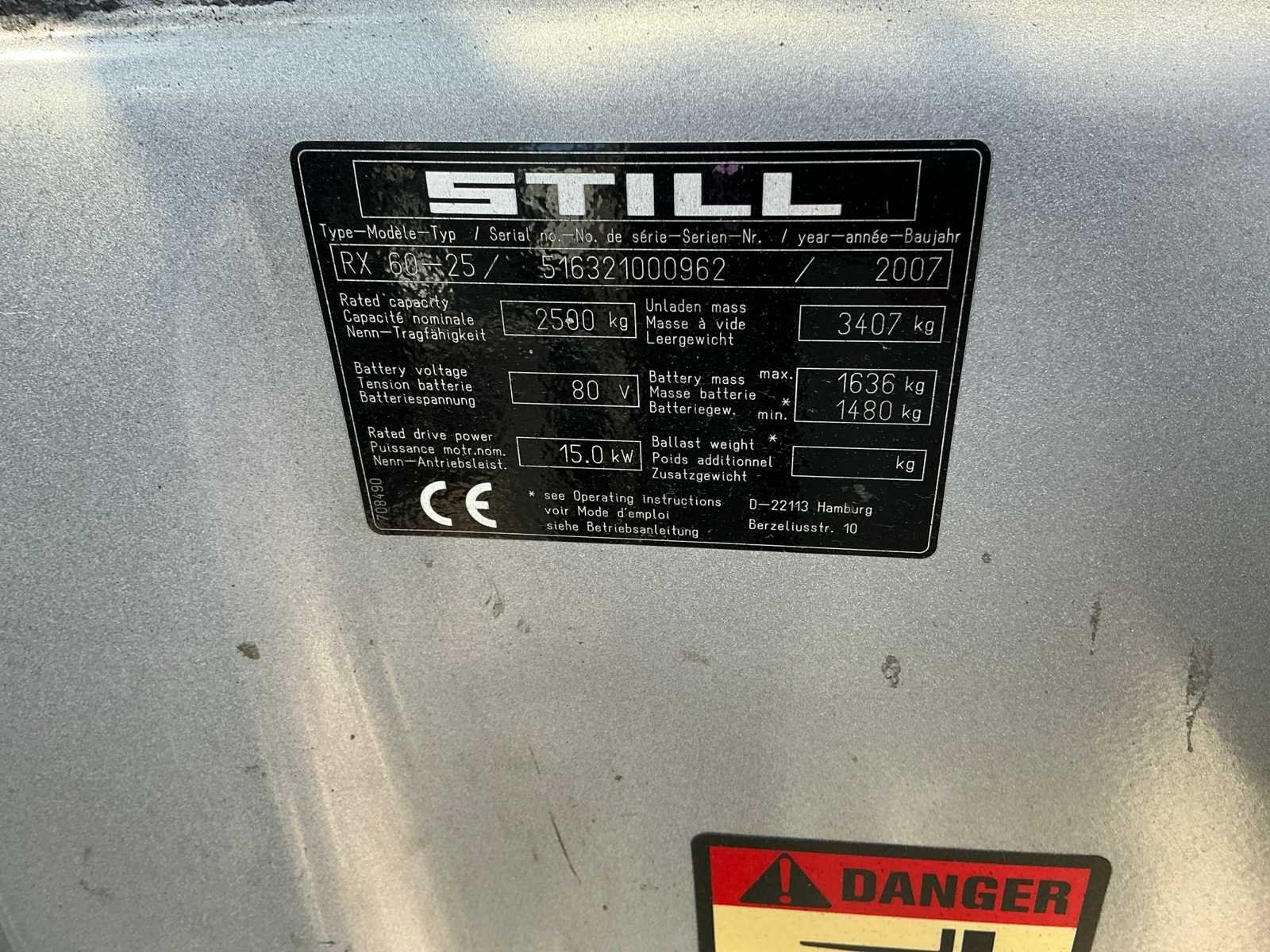 Nee Merk: STILL Type: RX60-25 Bouwjaar: 2007 Serienummer: 516321000962 Brandstof: Elektrisch Mast: Triple Soort band: Volrubber banden Aantal wielen: 4 Free-lift: true Side-shift: true Triple mast: true Eigen gewicht: 5053kg Hefvermogen: 2500kg Lepellengte: 1150mm Hefhoogte: 5700mm Vol rubber banden: true Totale afmeting L: 2250mm Totale afmeting Breedte: 1200mm Totale afmeting Hoogte: 2450mm