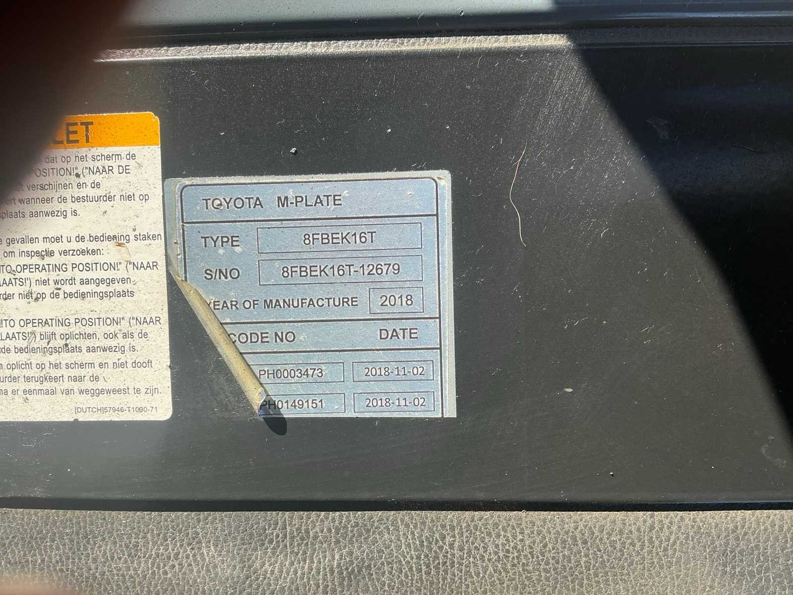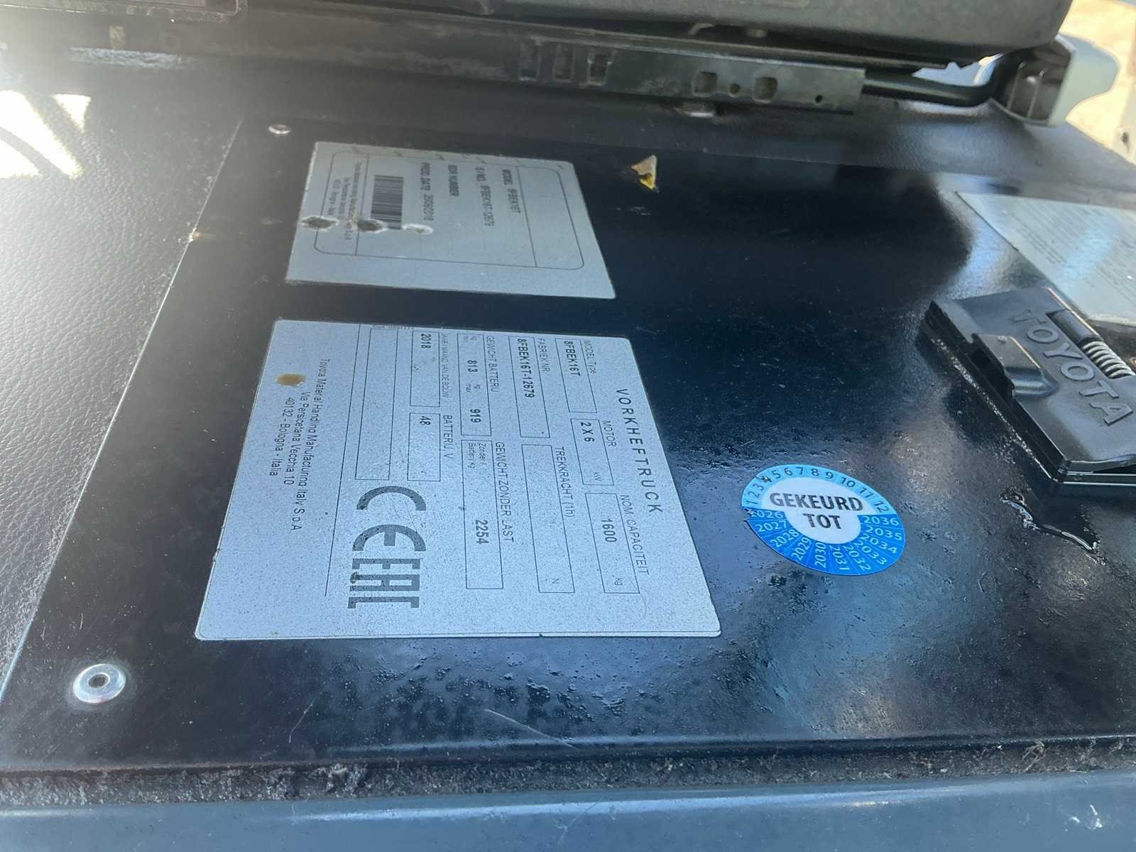 Nee Merk: Toyota Type: 8FBEK16T Bouwjaar: 2018 Serienummer: 12679 Brandstof: Elektrisch Mast: Duplex Soort band: Volrubber banden Aantal wielen: 3 Free-lift: true Side-shift: true Duplex mast: true Eigen gewicht: 3100kg Hefvermogen: 1600kg Lepellengte: 1000mm Hefhoogte: 3350mm Vol rubber banden: true Totale afmeting L: 1850mm Totale afmeting Breedte: 1050mm Totale afmeting Hoogte: 2150mm