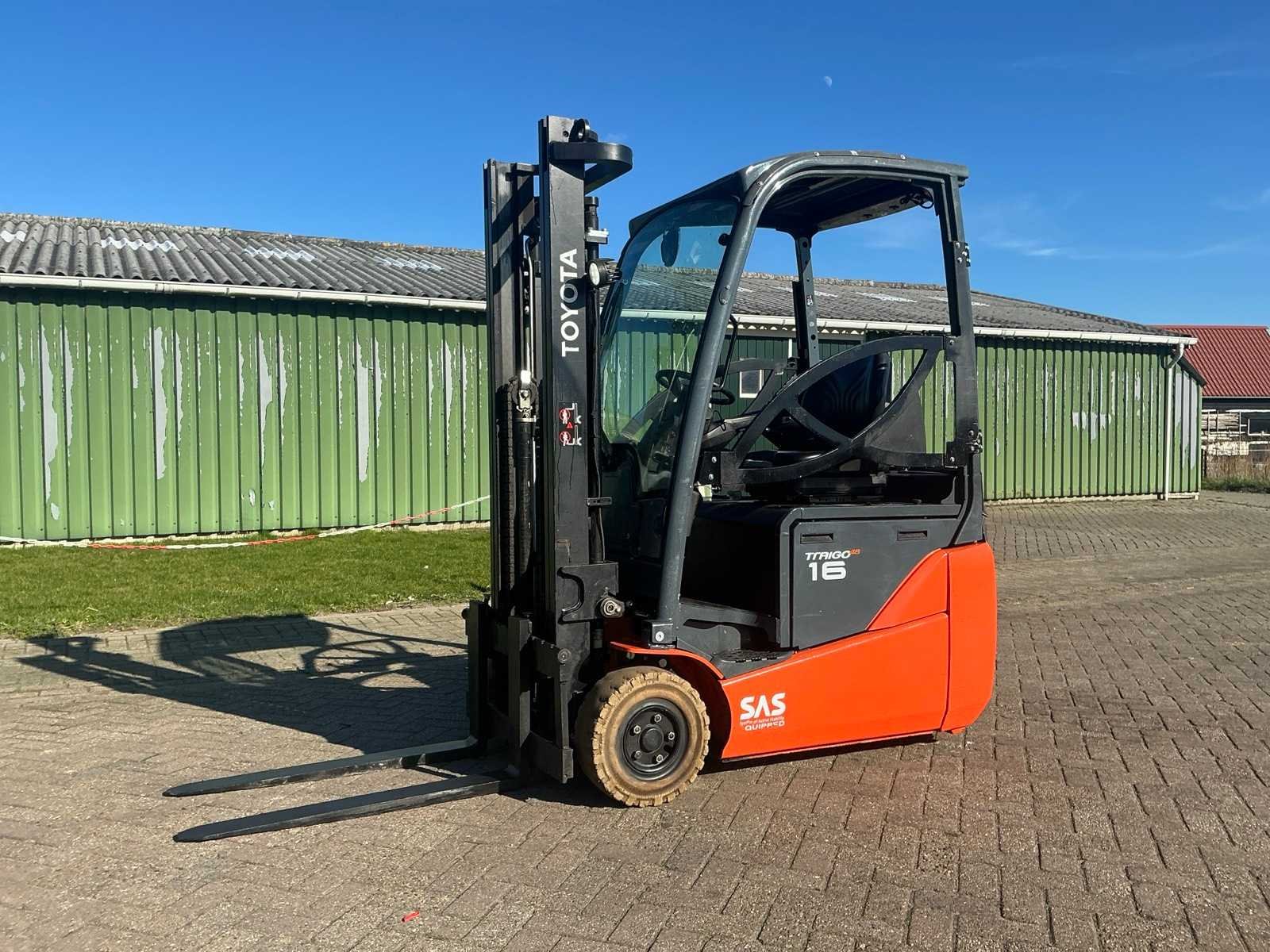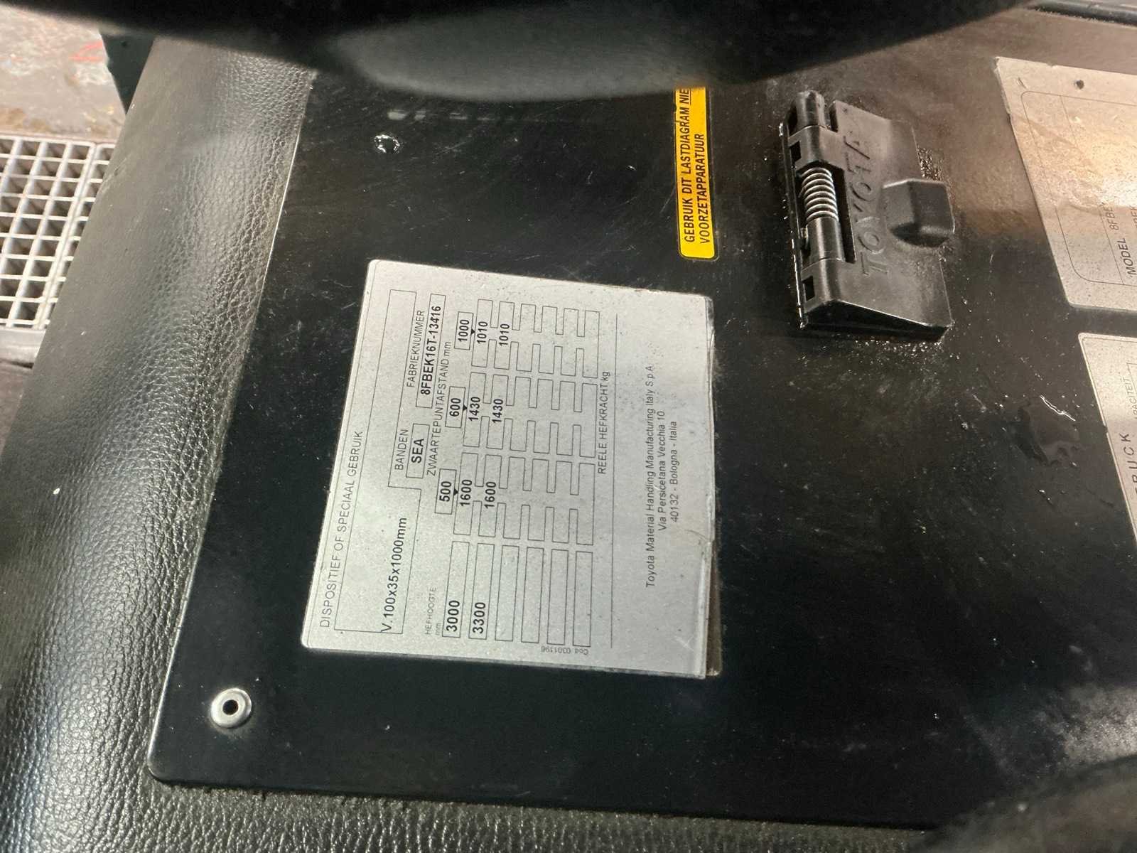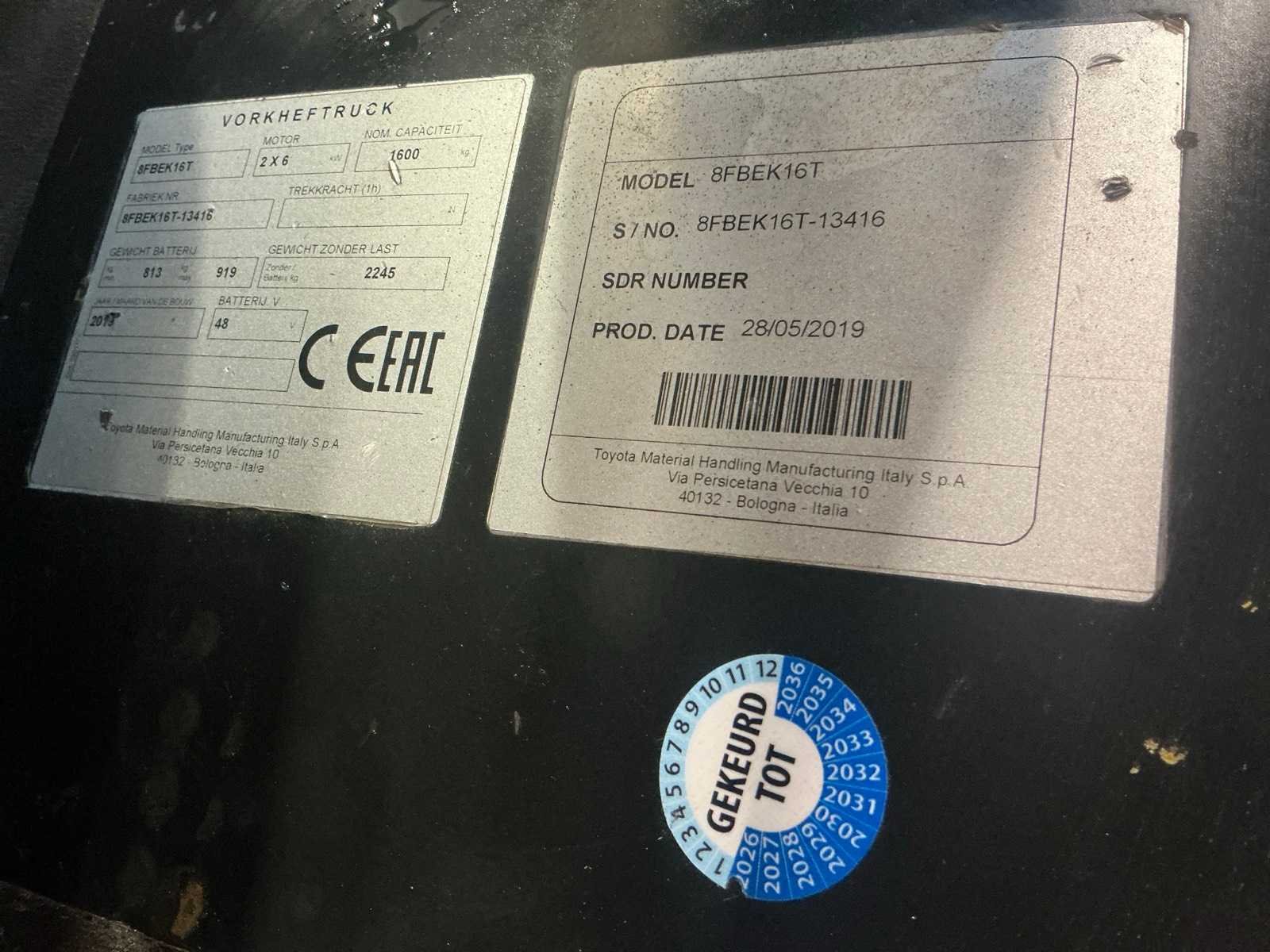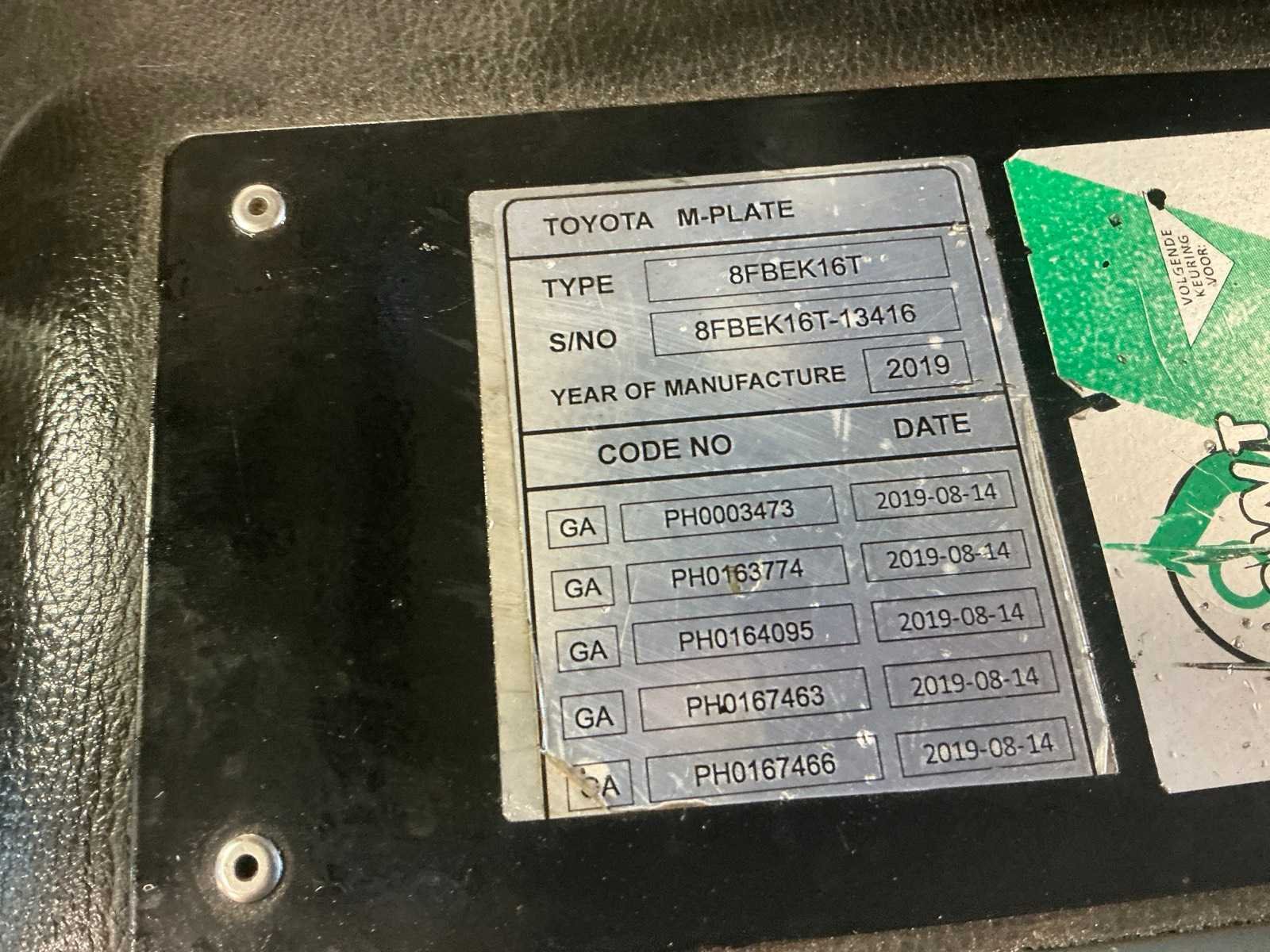 Nee Merk: Toyota Type: 8FBEK16T Bouwjaar: 2019 Serienummer: 13416 Brandstof: Elektrisch Mast: Duplex Soort band: Volrubber banden Aantal wielen: 3 Free-lift: true Side-shift: true Duplex mast: true Eigen gewicht: 3100kg Hefvermogen: 1600kg Lepellengte: 1000mm Hefhoogte: 3350mm Vol rubber banden: true Totale afmeting L: 1850mm Totale afmeting Breedte: 1050mm Totale afmeting Hoogte: 2150mm
