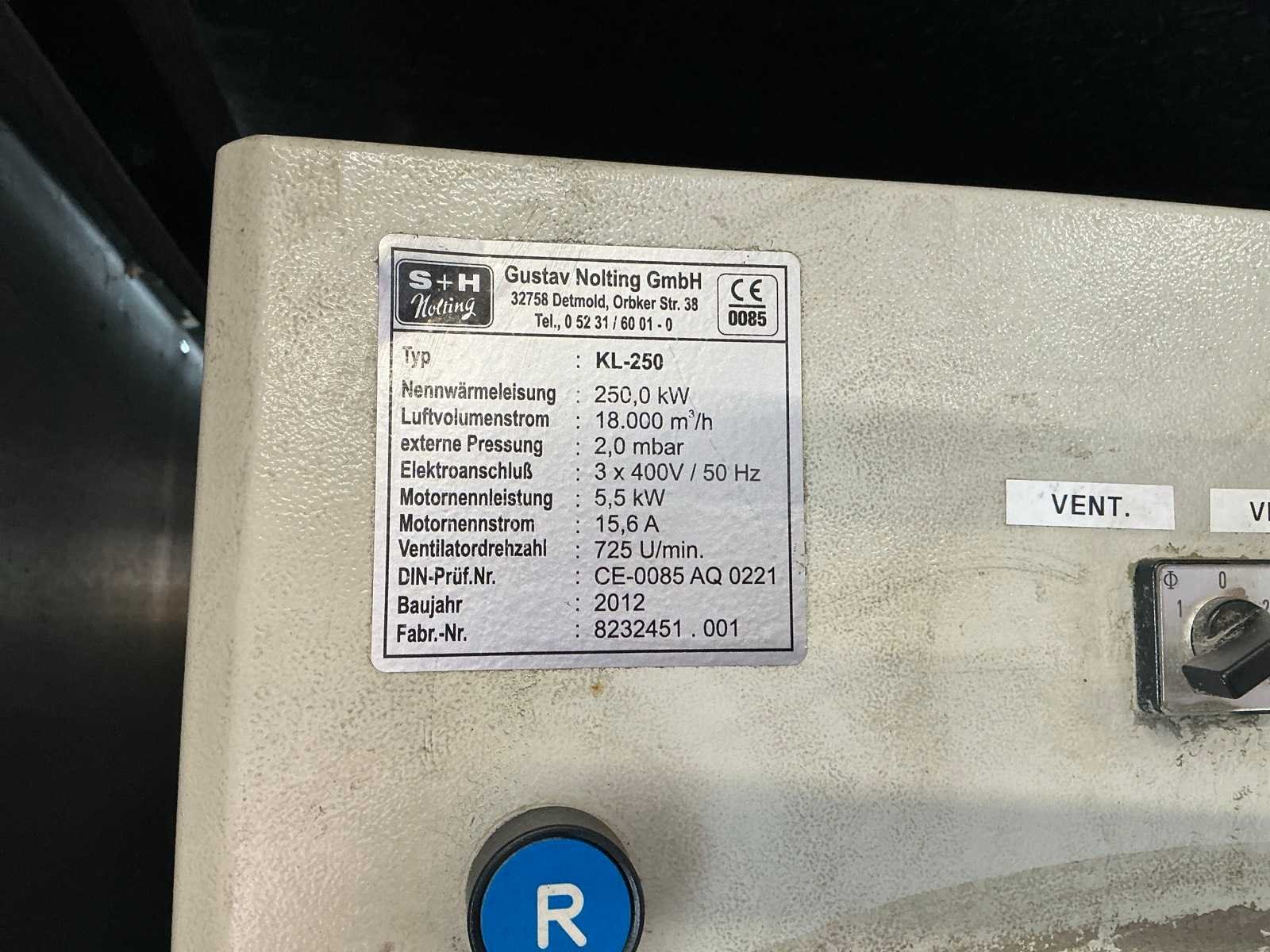 Nee Merk: Gustav nolting Type: KL250 oil heater Bouwjaar: 2012 Serienummer: 8232451 Vermogen: 250kW Ventilator: true Thermostaat: true Totale afmeting L: 1200mm Totale afmeting Breedte: 3500mm Totale afmeting Hoogte: 2050mm