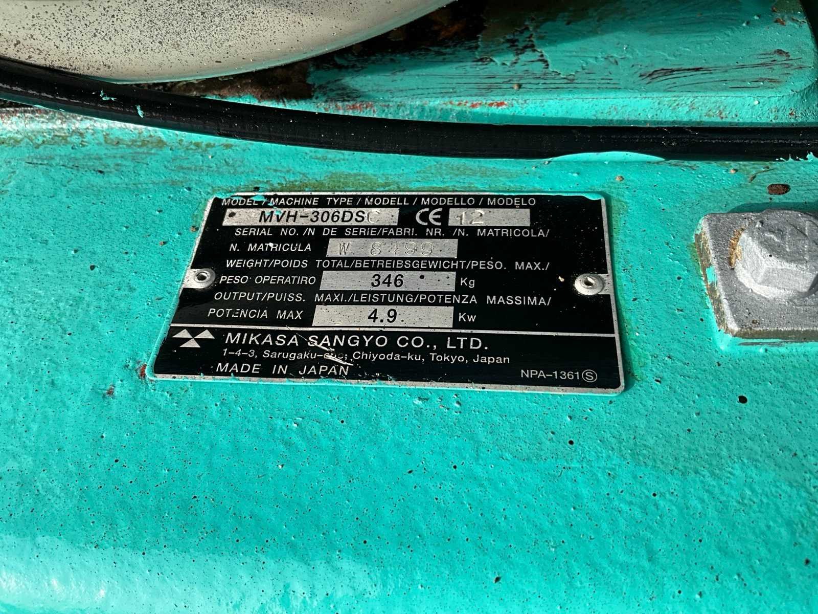 Nee Merk: Mikasa Type: MVH-306DS Serienummer: W8499 Bedrijfsgewicht: 346kg Grondplaat afm. l: 850mm Grondplaat afm. b: 450mm Merk motor: Yanmar Brandstof: Diesel